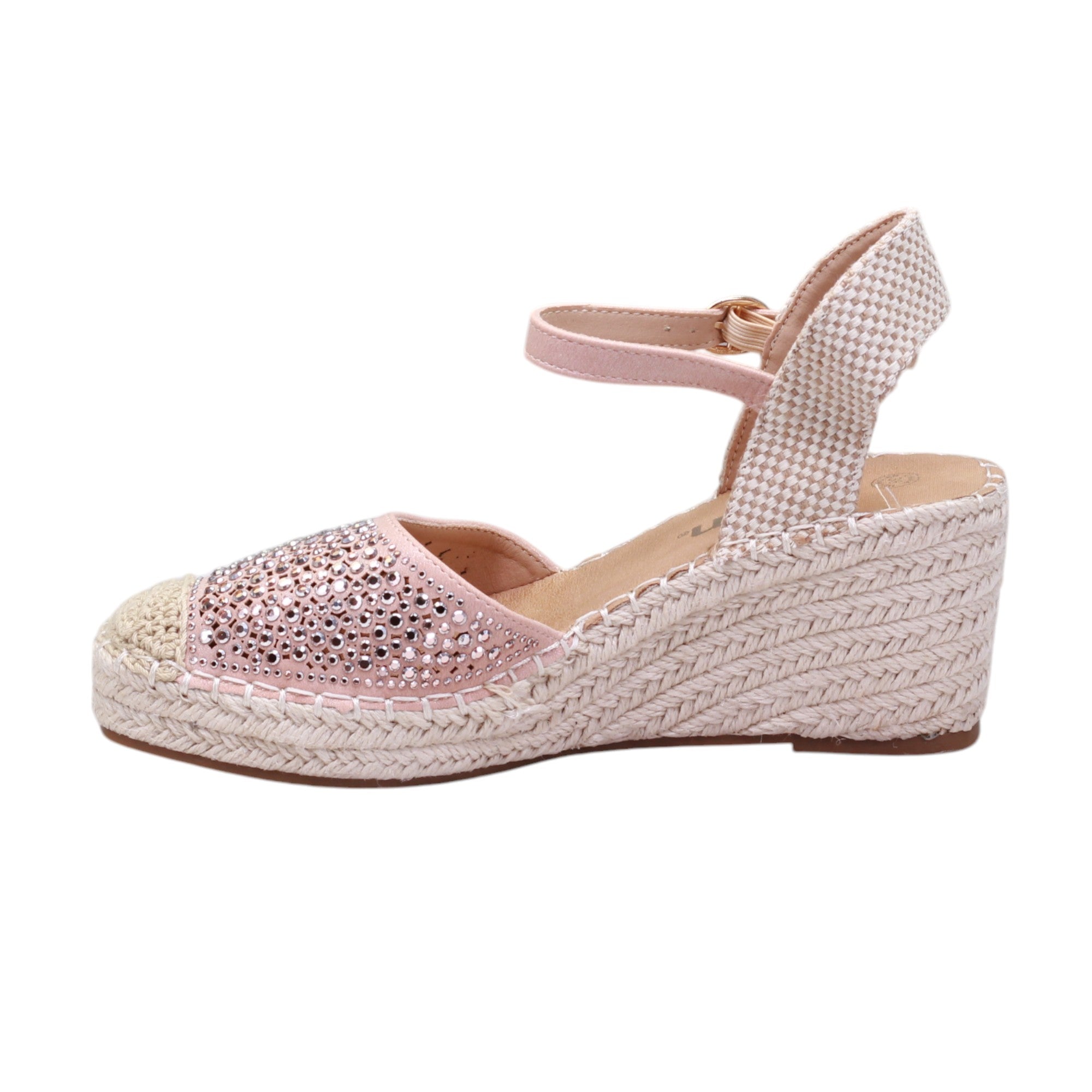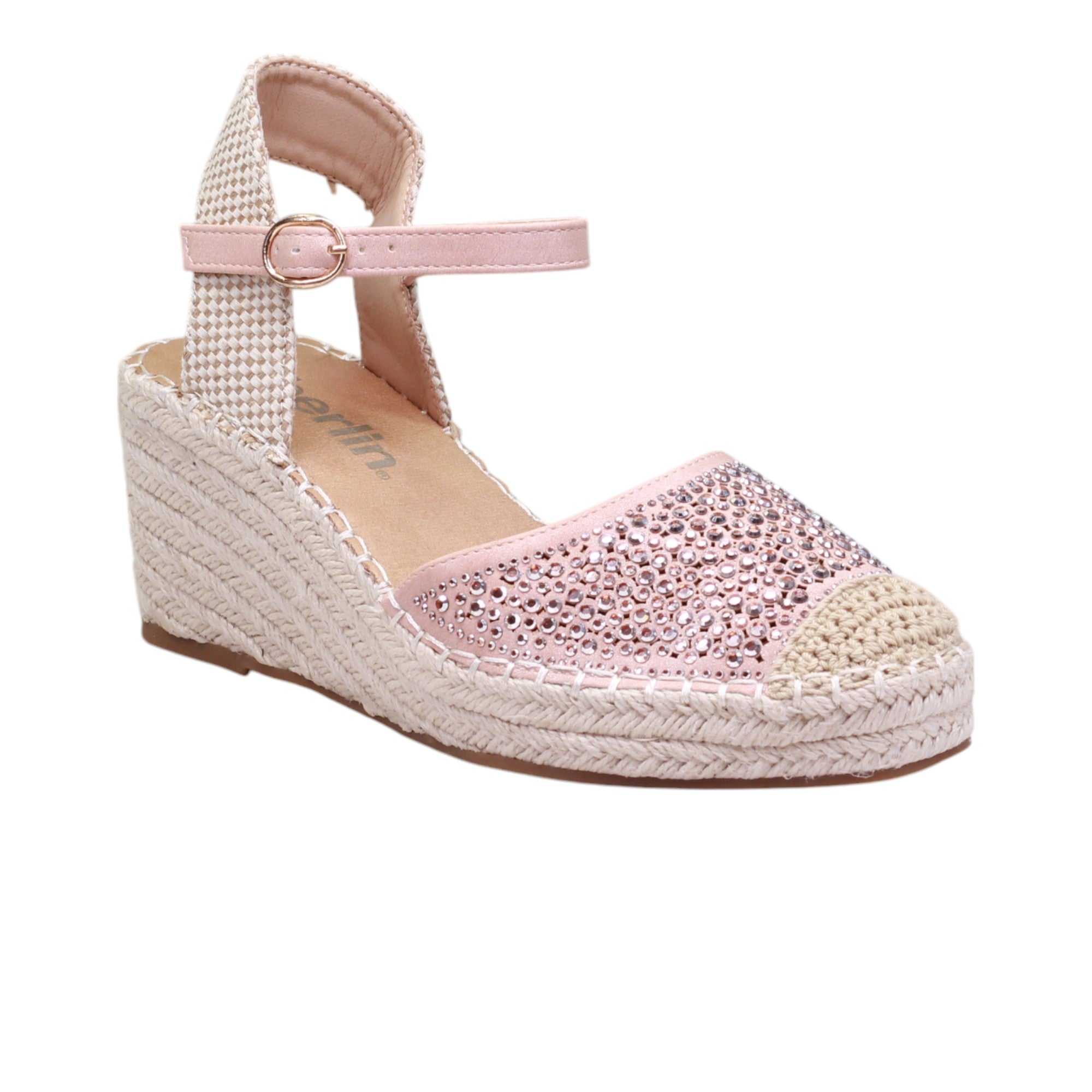 Alpargata para dama marca Berlin en color beige. La plataforma tejida de 6.5 cm de altura de este modelo cuenta con una hebilla para un ajuste perfecto y un corte adornado con pedrería artificial. Disfruta de comodidad y estilo en un solo zapato.