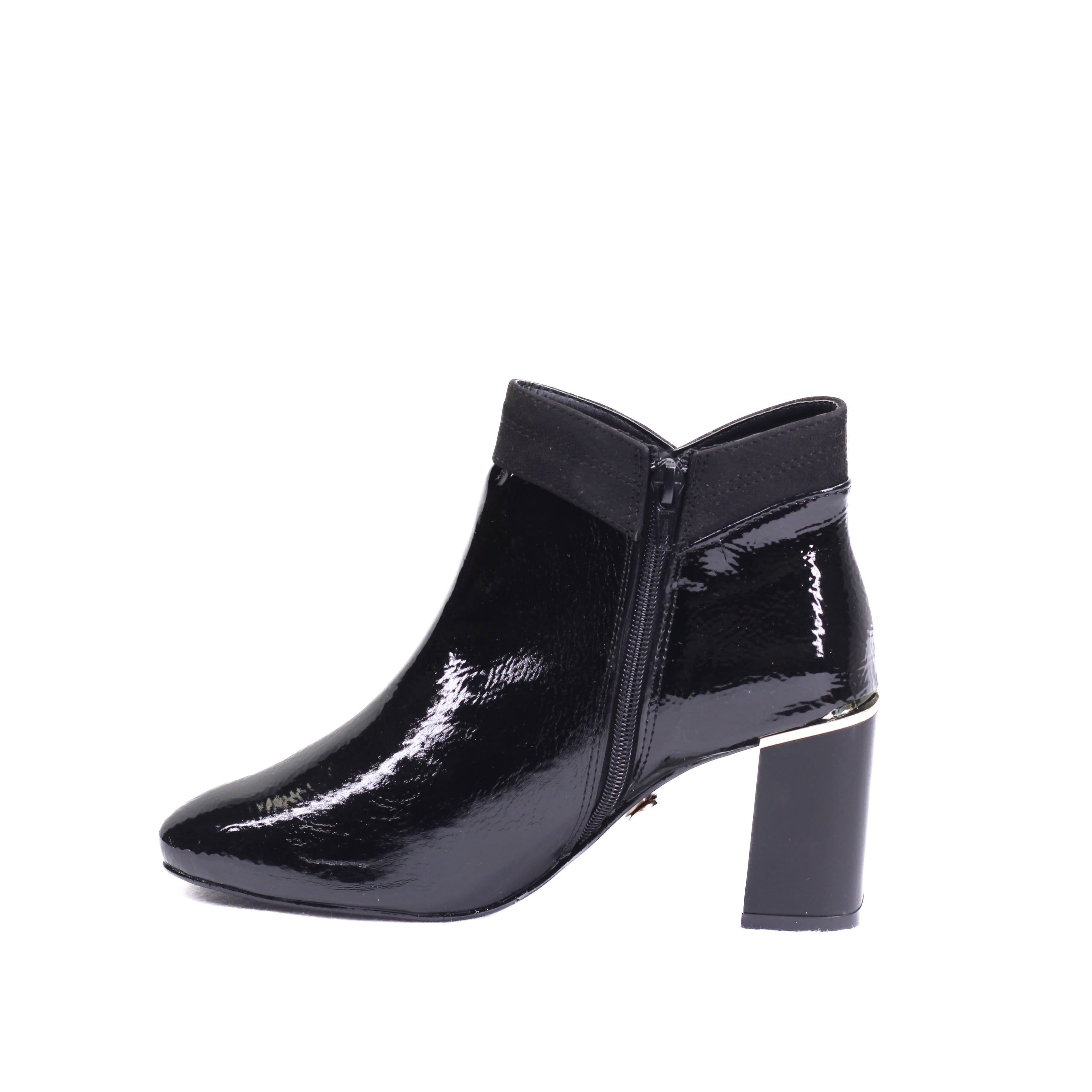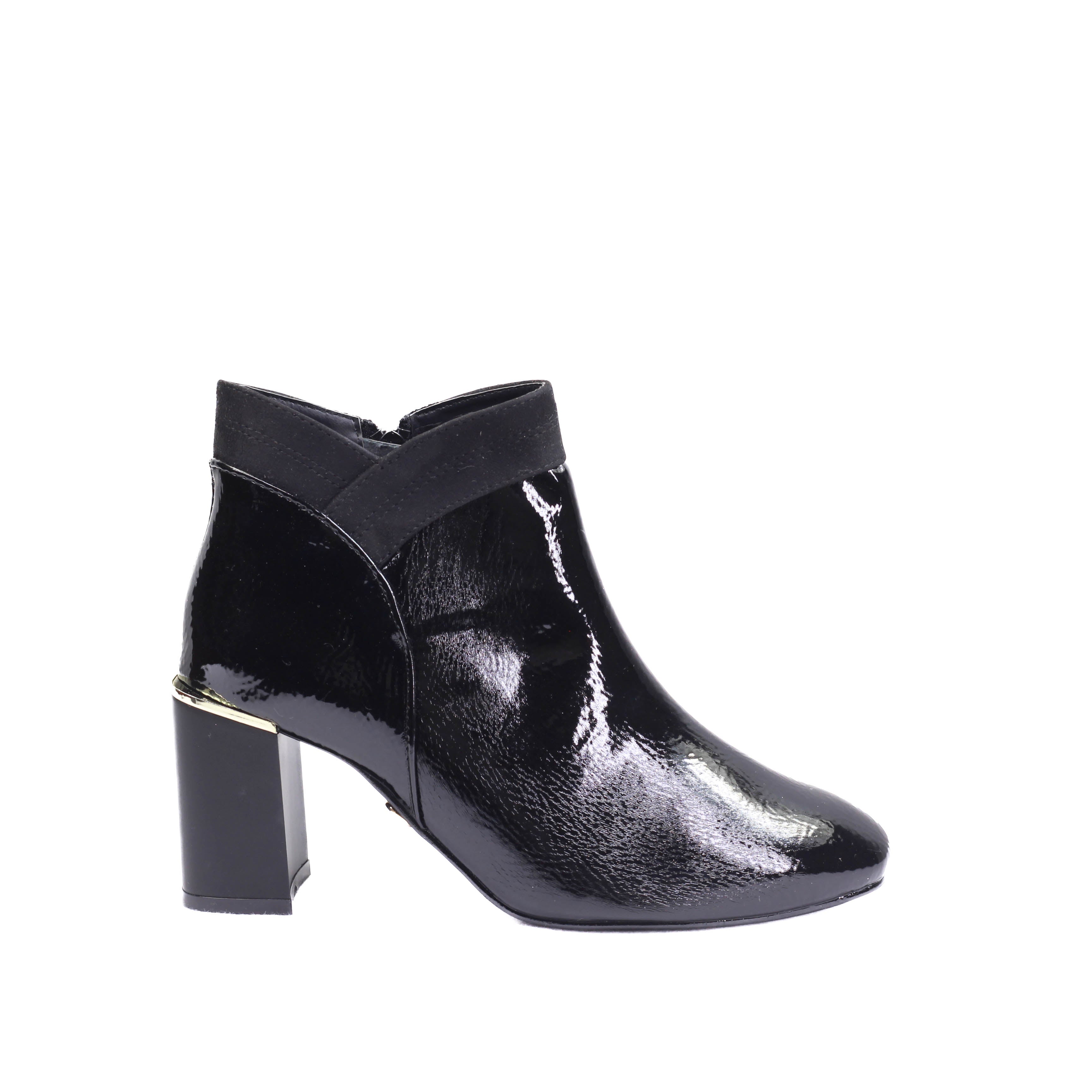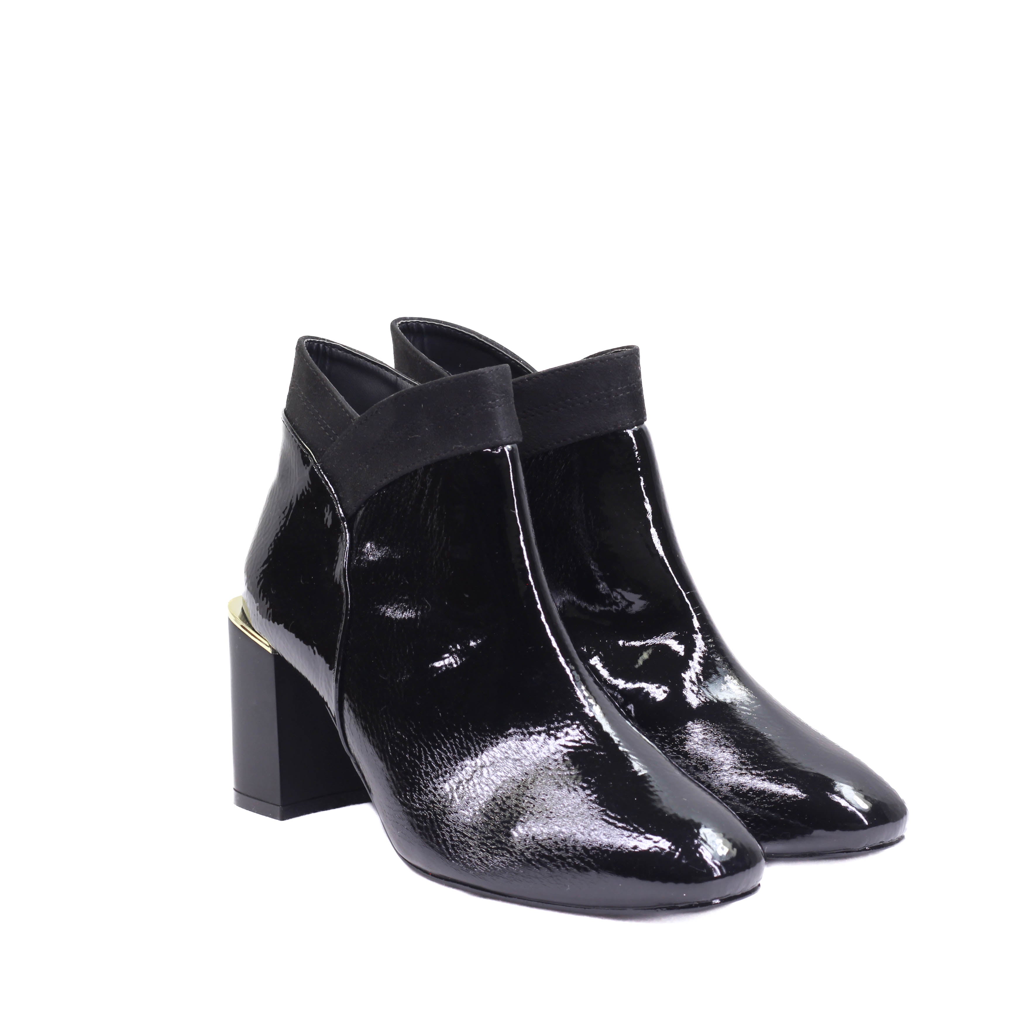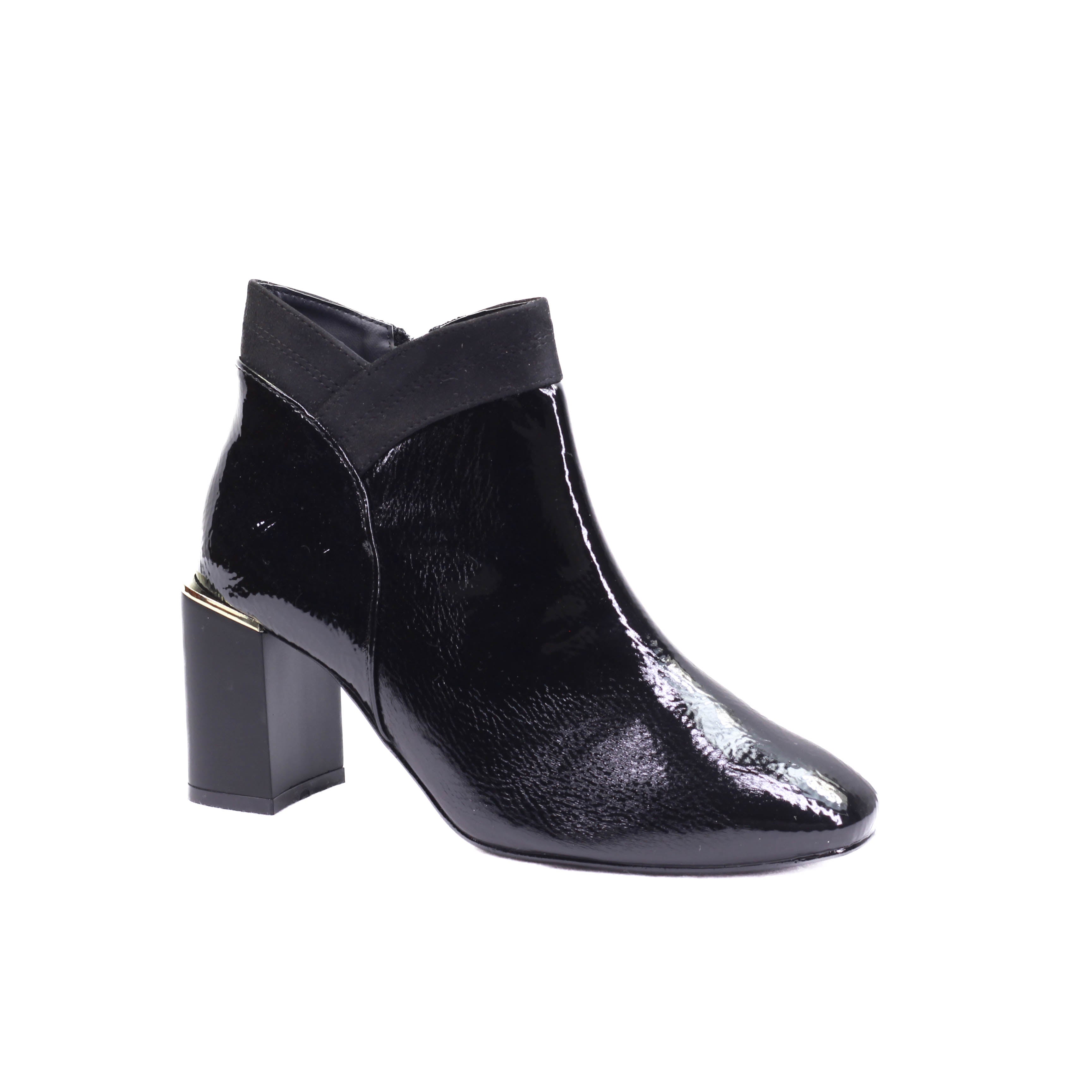 Bota para dama con tacón ancho cuadrado y corte de terminado en charol