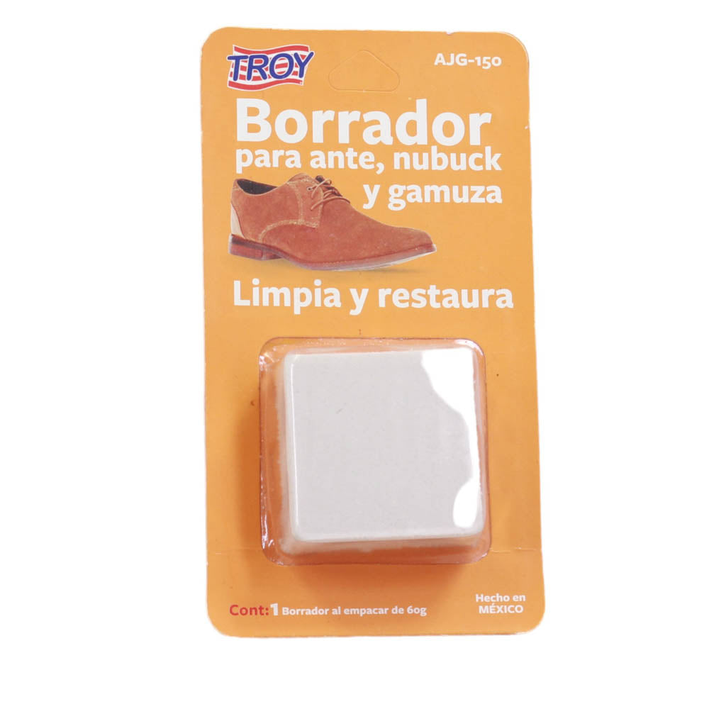 Borrador para calzado marca Troy. Es un producto diseñado para limpiar y restaurar el ante, nubuck y gamuza. Asegúrese de que la superficie del ante esté libre de polvo y suciedad. Puedes usar un cepillo suave para eliminar partículas sueltas. Frota suavemente el borrador sobre las áreas manchadas o desgastadas del ante. El borrador ayudará a eliminar manchas y a revitalizar el material.
