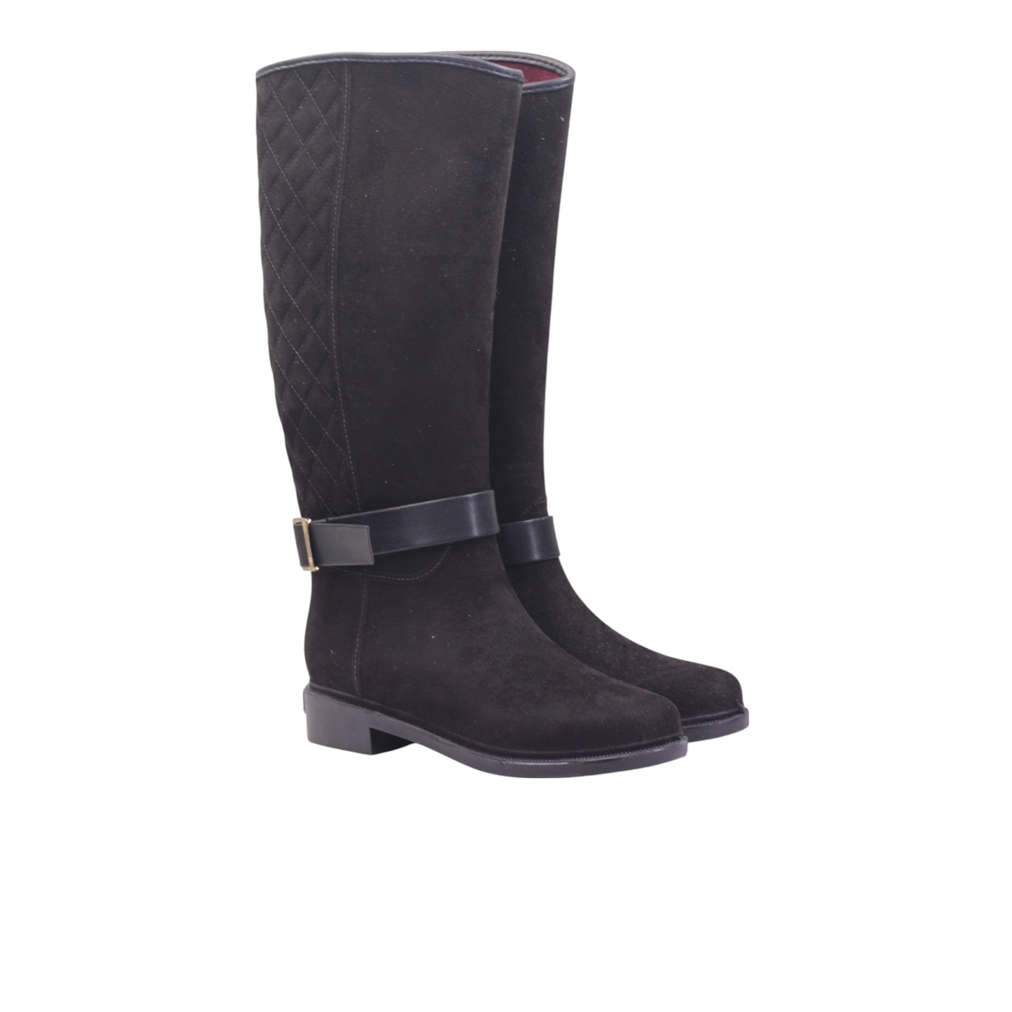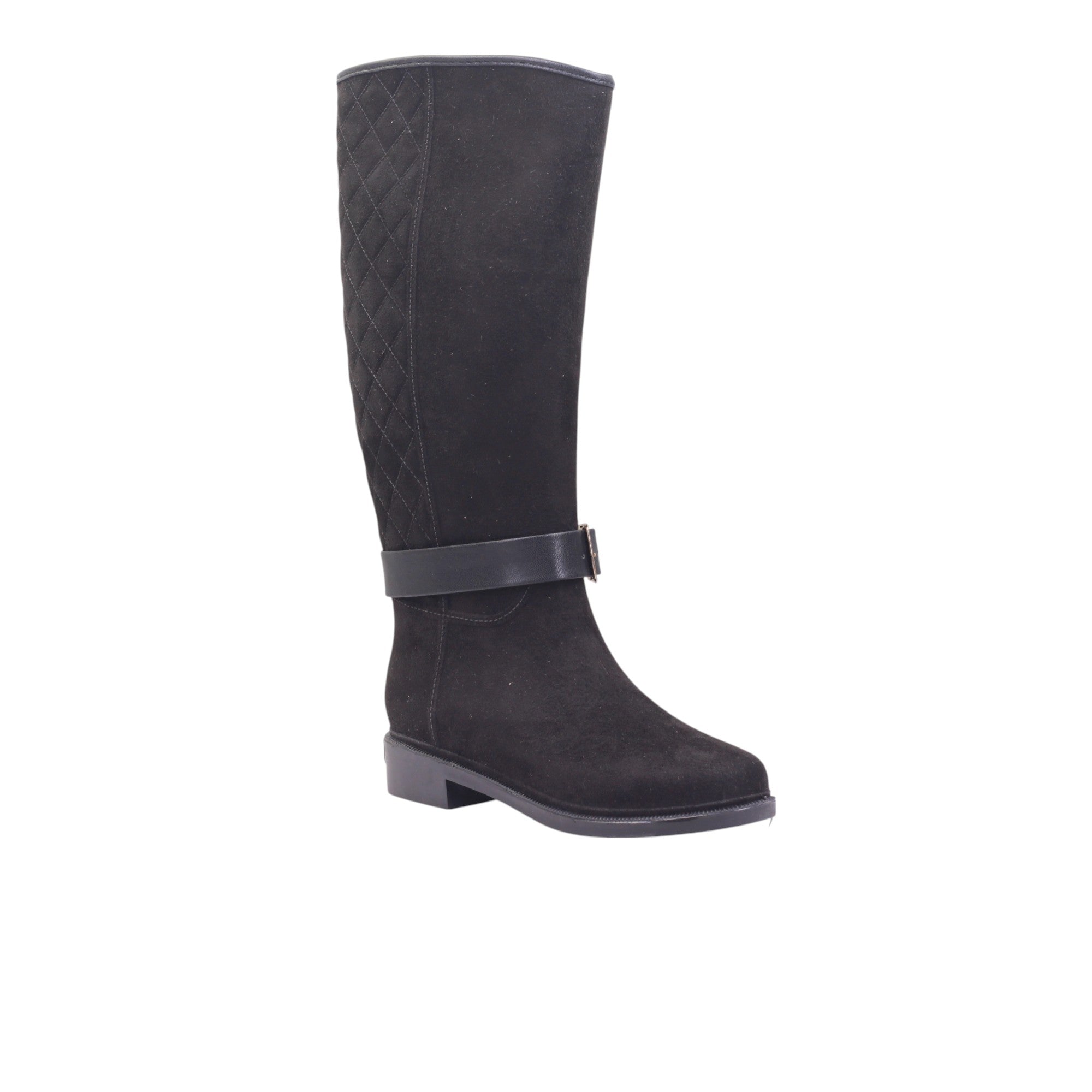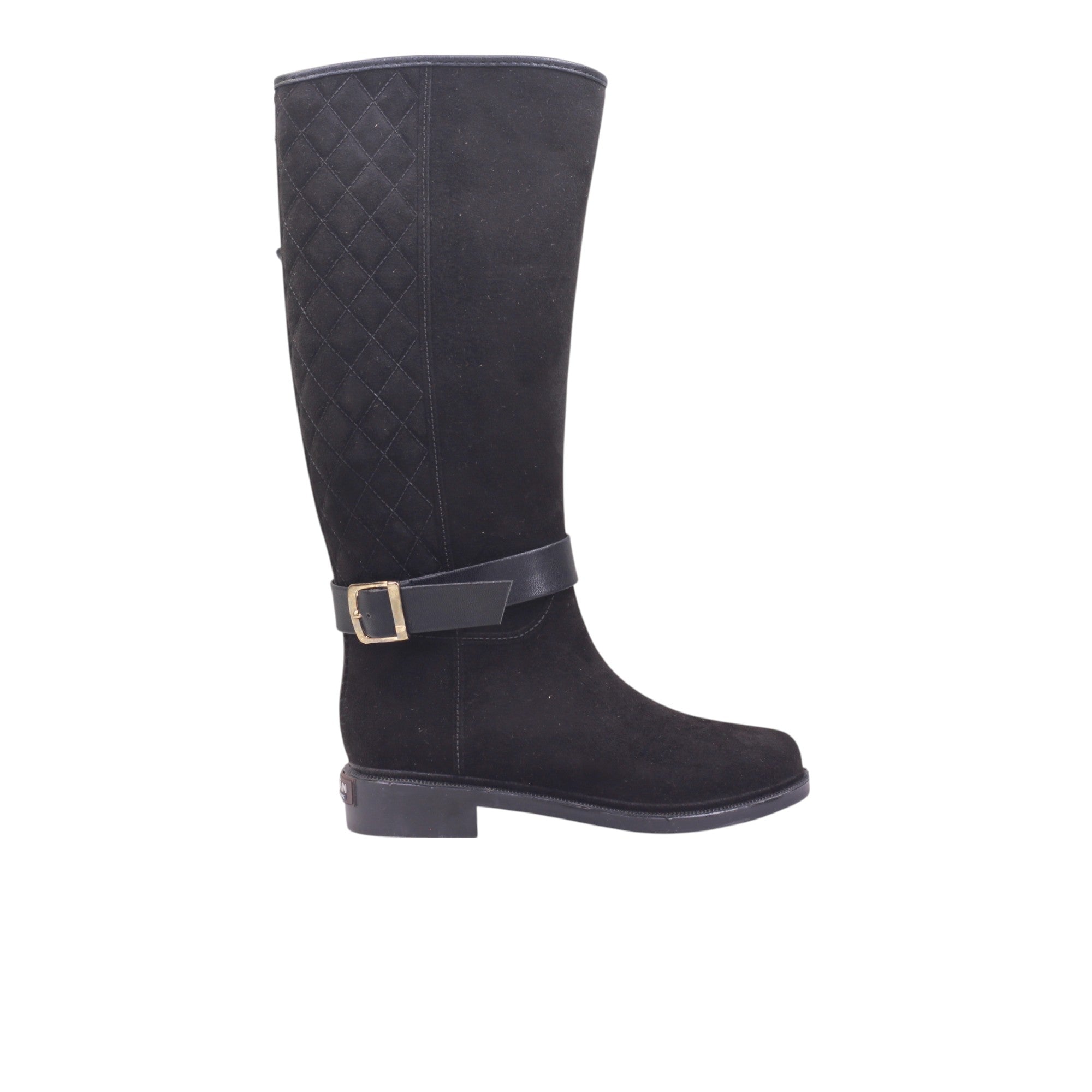 El detalle de hebilla decorativa en el tobillo aporta carácter sin comprometer la practicidad. Su tacón bajo de 2.5 cm y suela plana con diseño antiderrapante aseguran estabilidad y confort en superficies mojadas. El contraste entre el acabado liso en la parte inferior y el patrón acolchado en el tubo crea una silueta atractiva y versátil.
