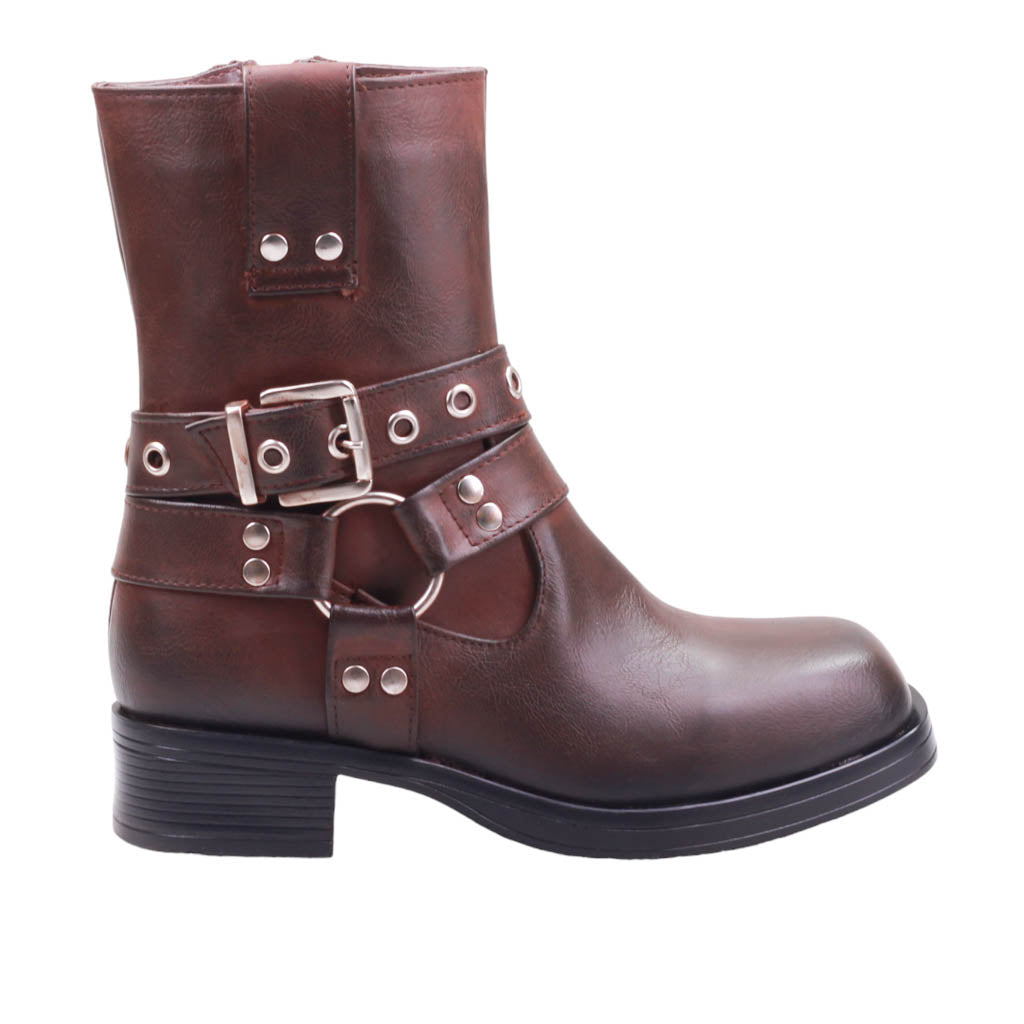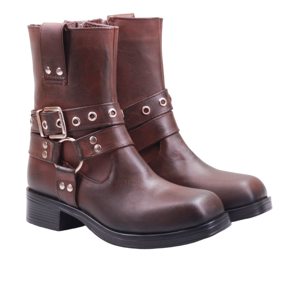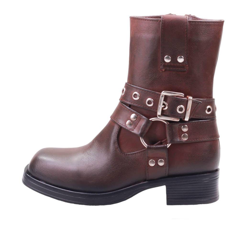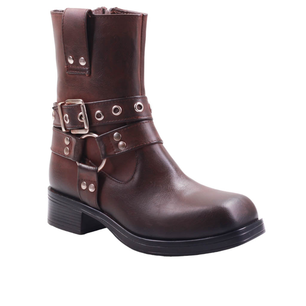 Botín para dama marca Maquech en colores moka y negro. Este modelo cuenta con un tacón ancho y una plantilla de confort para ofrecer una comodidad duradera. Está hecho con piel lisa y una tira ancha con hebilla de ajuste, además de triple tiras unidas a una argolla de adorno. Ideal para un estilo elegante y cómodo.