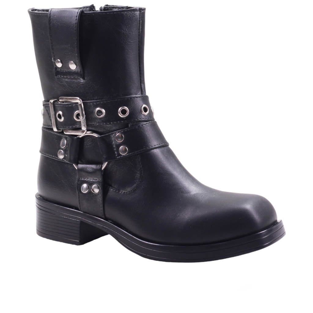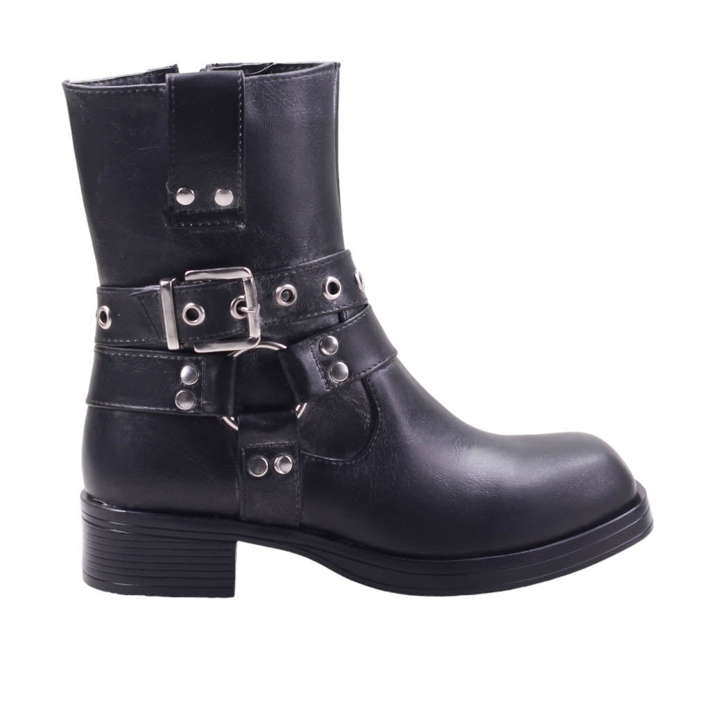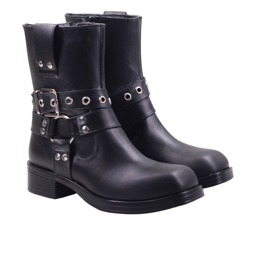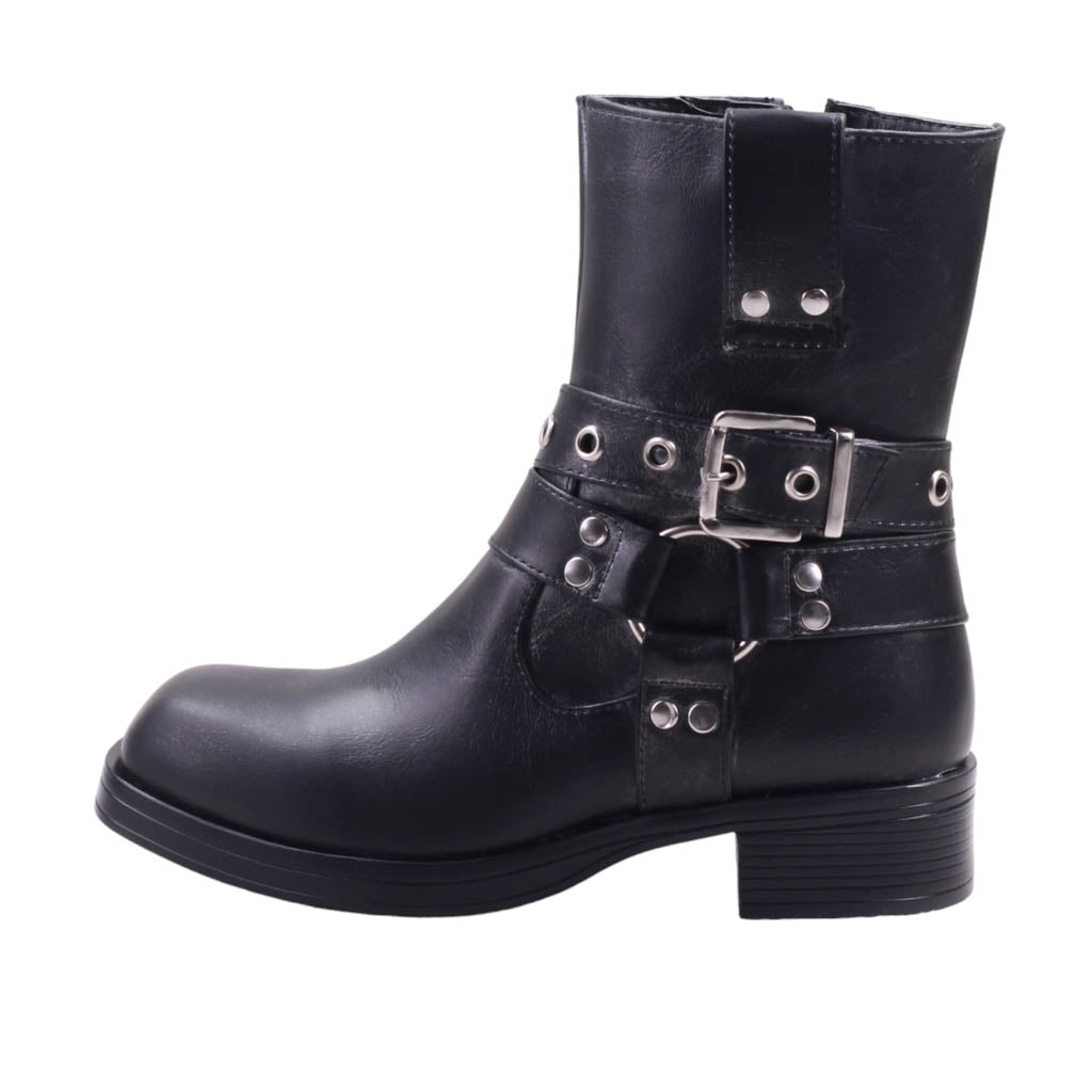 Botín para dama marca Maquech en colores moka y negro. Este modelo cuenta con un tacón ancho y una plantilla de confort para ofrecer una comodidad duradera. Está hecho con piel lisa y una tira ancha con hebilla de ajuste, además de triple tiras unidas a una argolla de adorno. Ideal para un estilo elegante y cómodo.