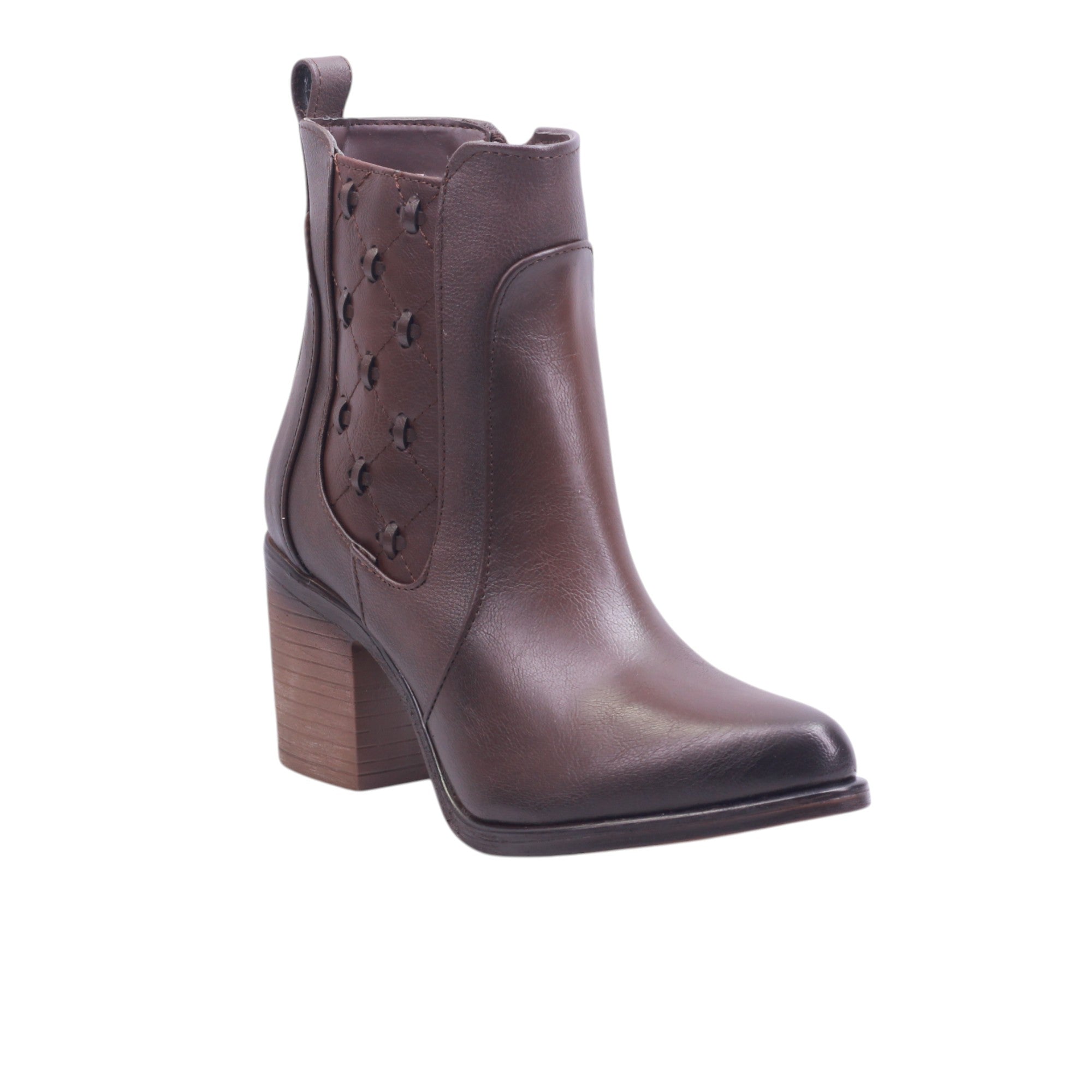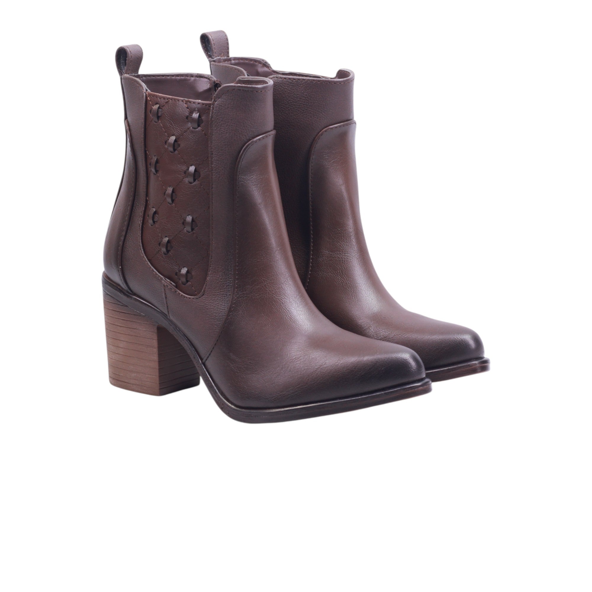 Botín para dama marca Maquech en color moka y negro. Este botín de corte y forro en piel artificial destaca por su diseño estructurado y detalles artesanales. El tubo de 15 cm abraza el tobillo con firmeza, mientras que el tacón ancho de 5.5 cm ofrece una elevación cómoda y estable.