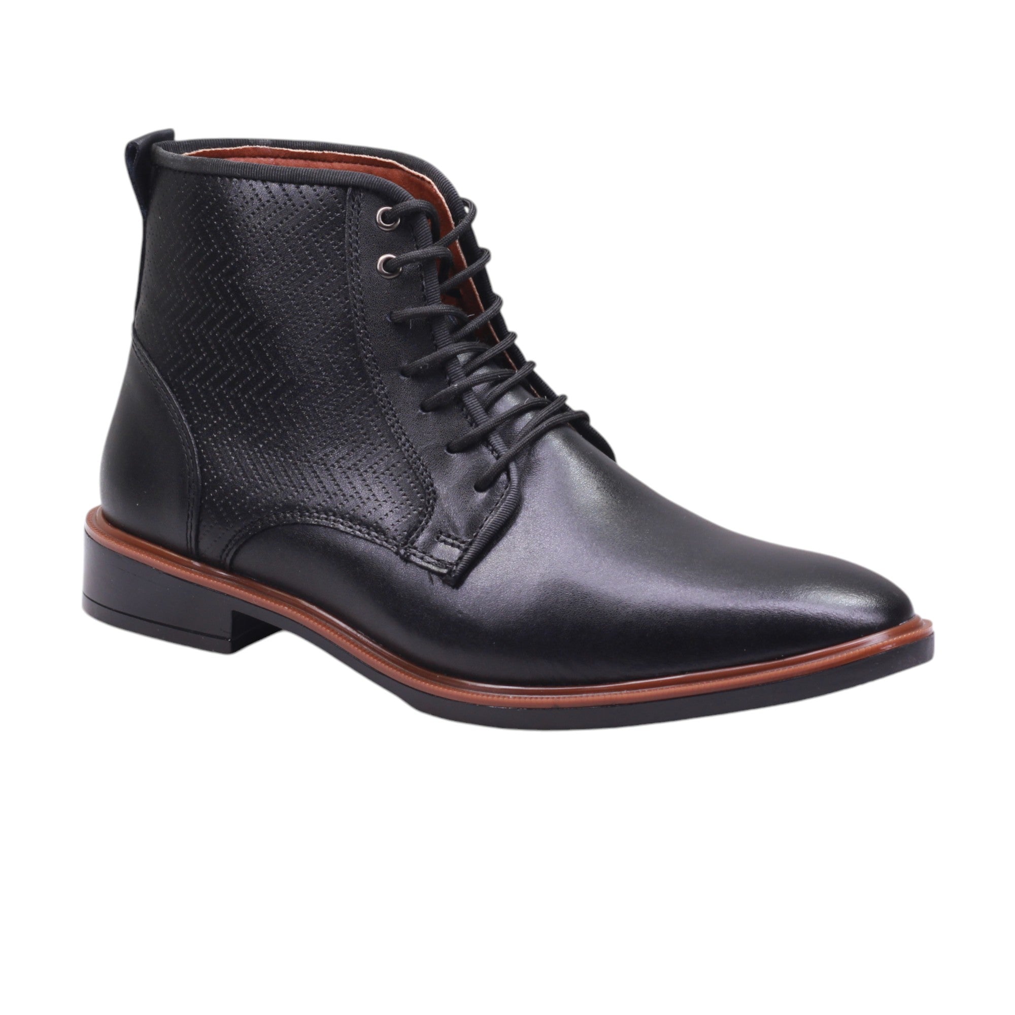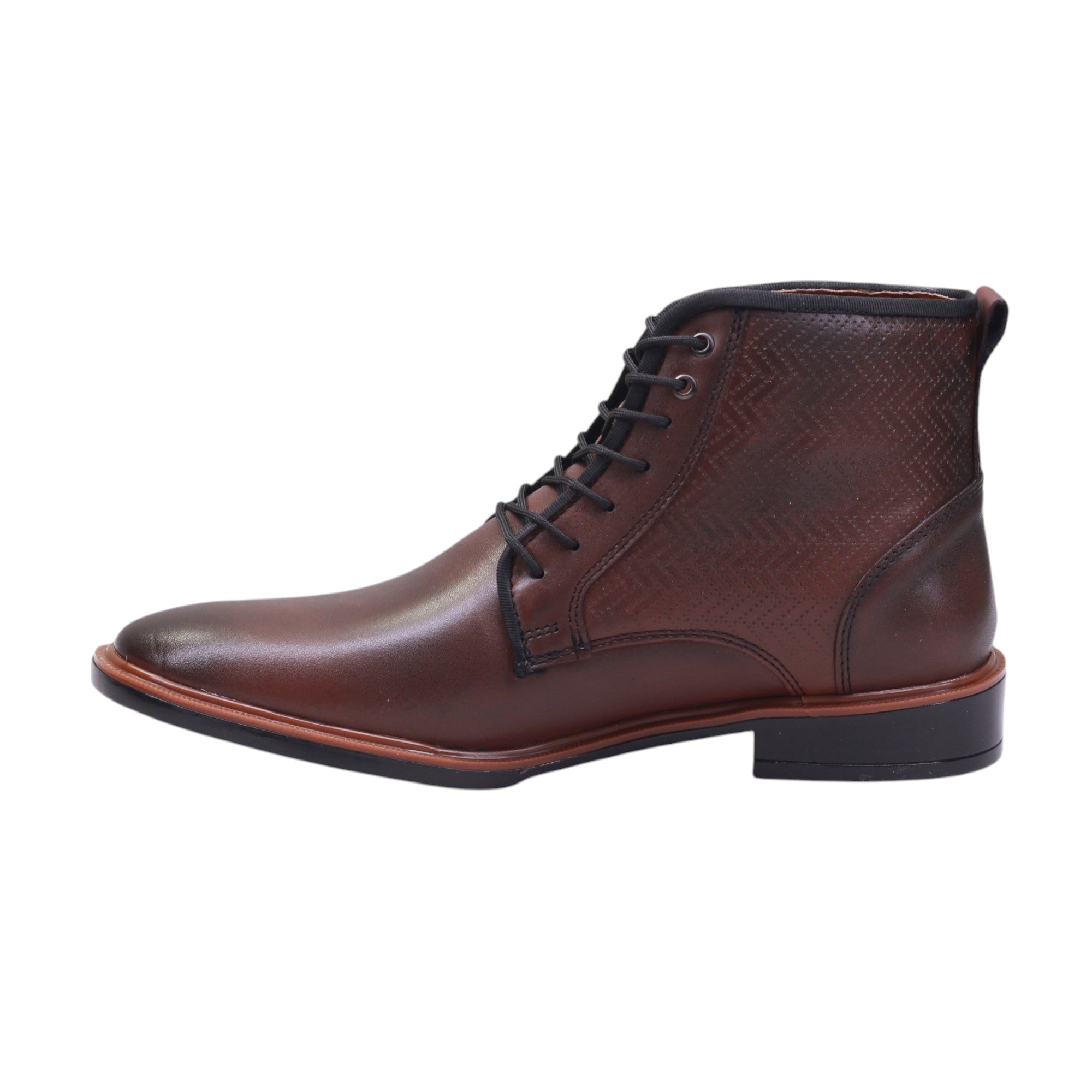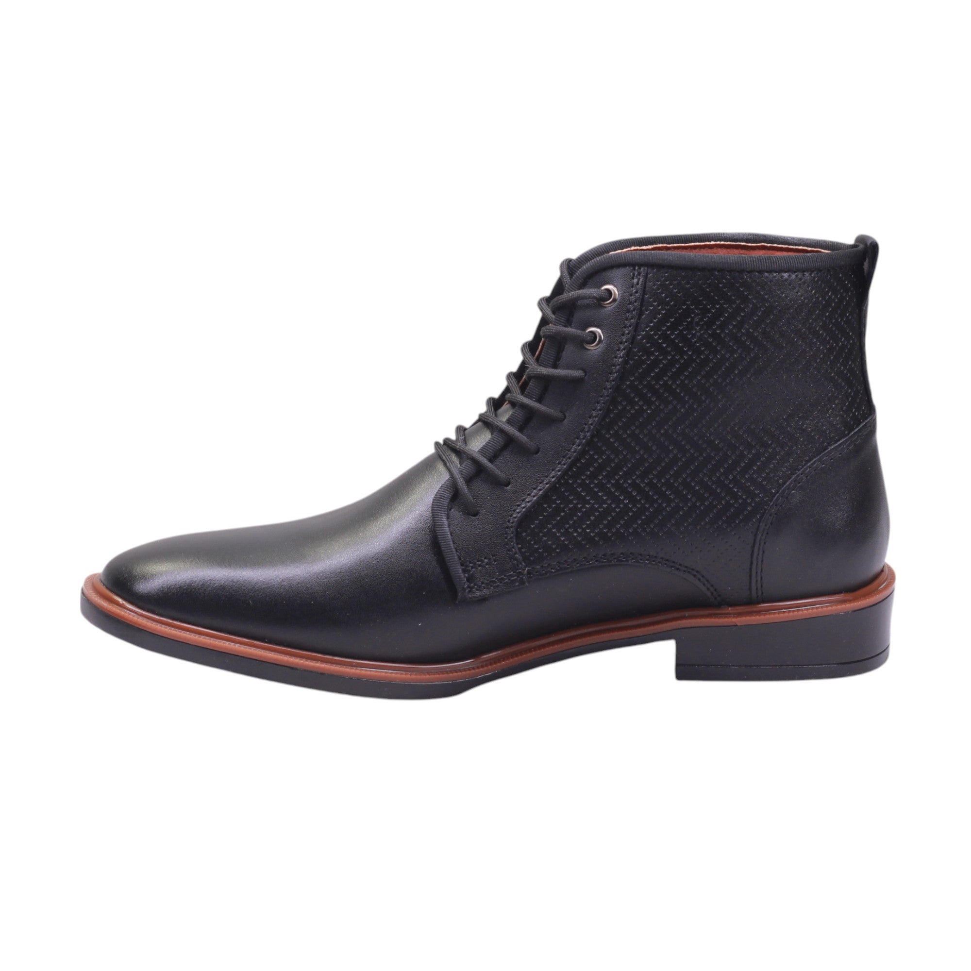 Botín para caballero marca Lugo conti en colores negro y zanahoria. Este modelo cuenta con un sistema de ajuste mediante agujetas, que garantiza una comodidad y sujeción óptimas. Los laterales cuentan con una elegante piel artificial grabada, lo que le da un toque de distinción al diseño. Además, su tacón de 2.5 cm ofrece una altura perfecta para caminar con estabilidad y sin cansancio.