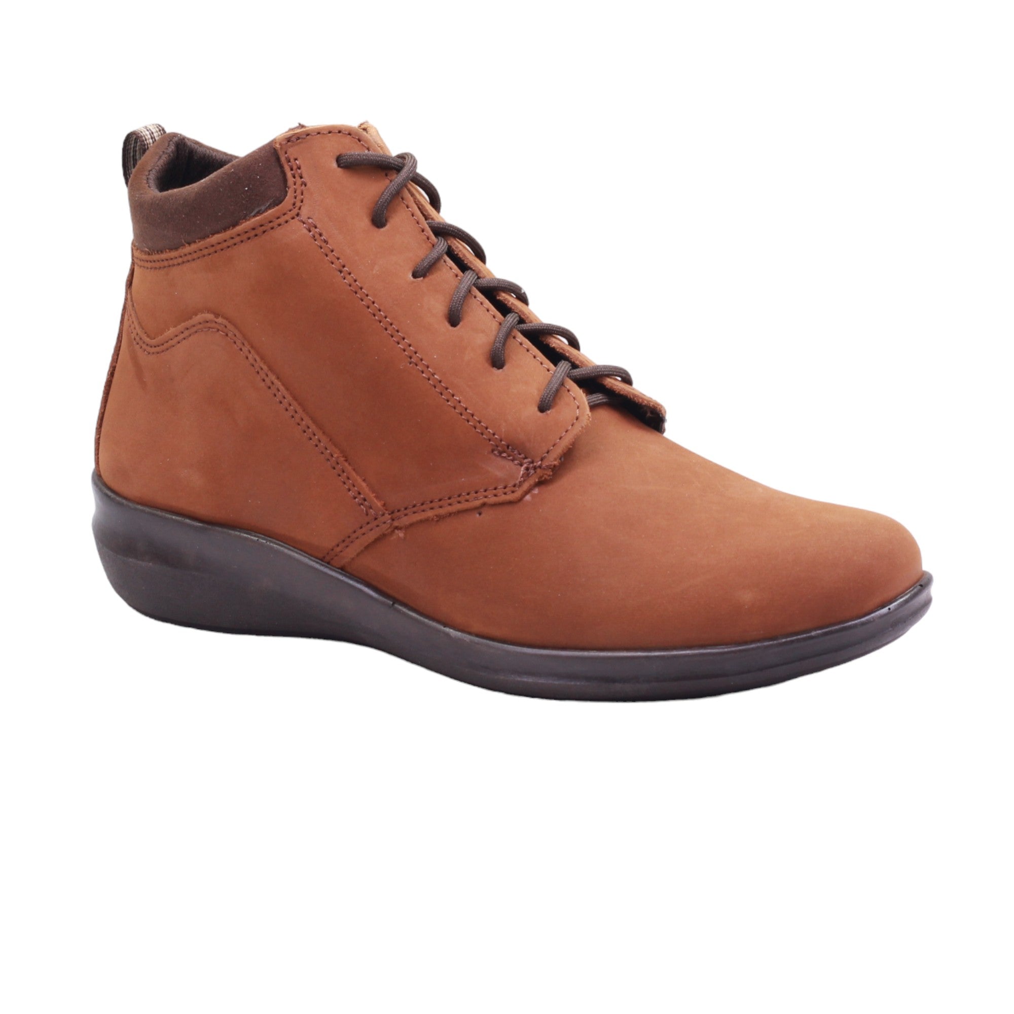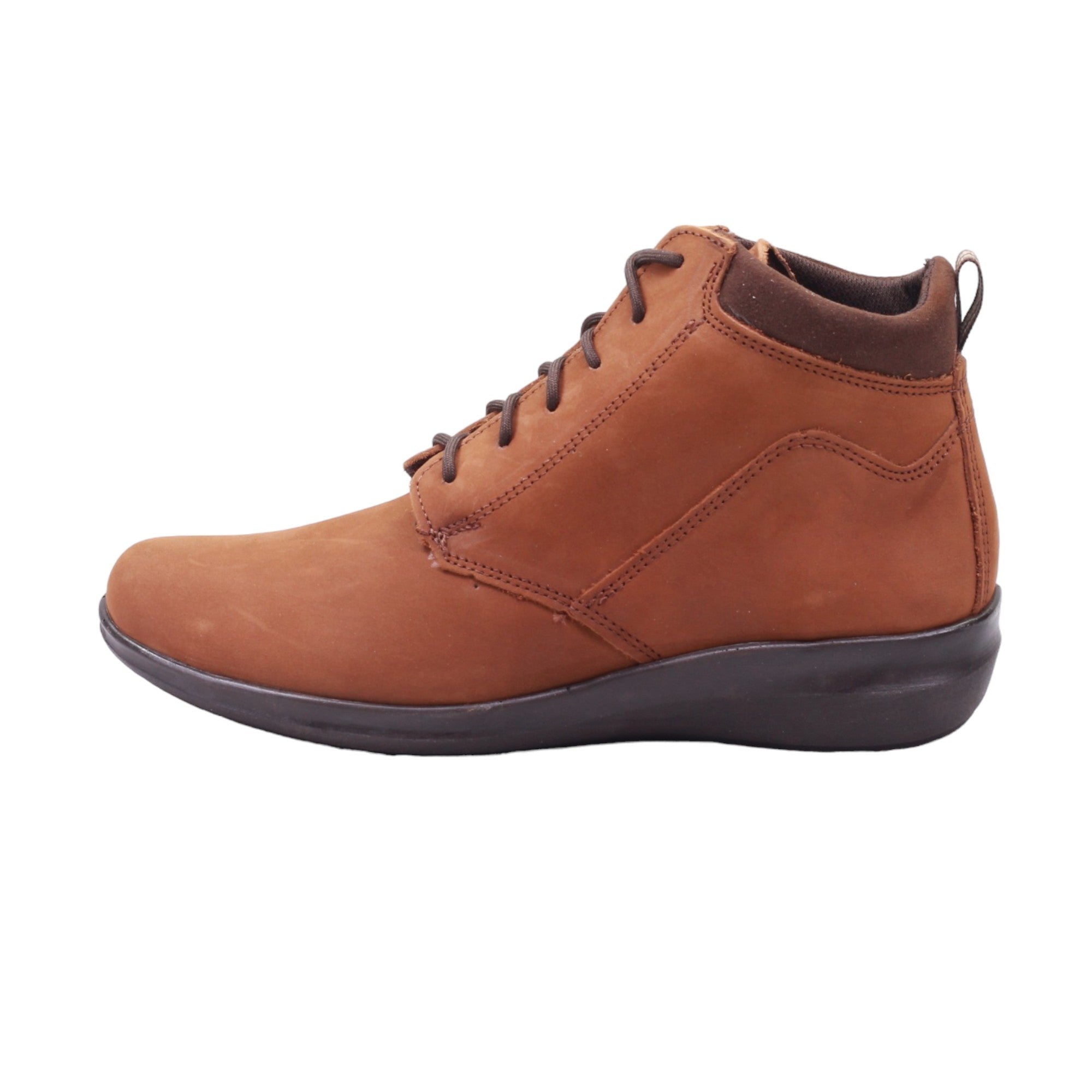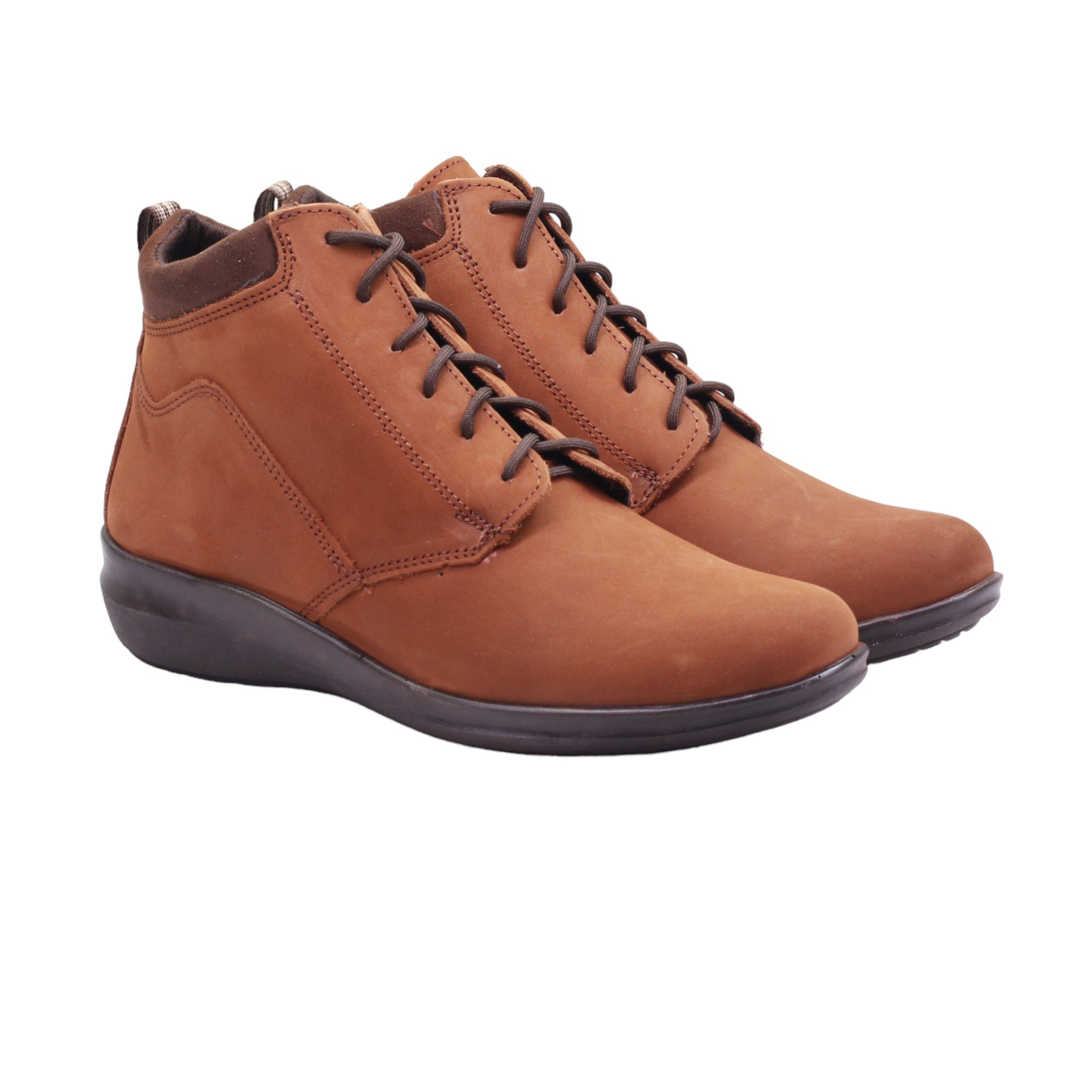 Botín para dama marca 20 Horas en color avellana. Este modelo presenta un ajuste personalizado gracias a sus agujetas, lo que garantiza una comodidad excepcional con su plantilla de confort. La suela corrida con una altura trasera de 3.5 cm proporciona mayor apoyo y estabilidad, mientras que su acabado en piel lisa agrega un toque de sofisticación.