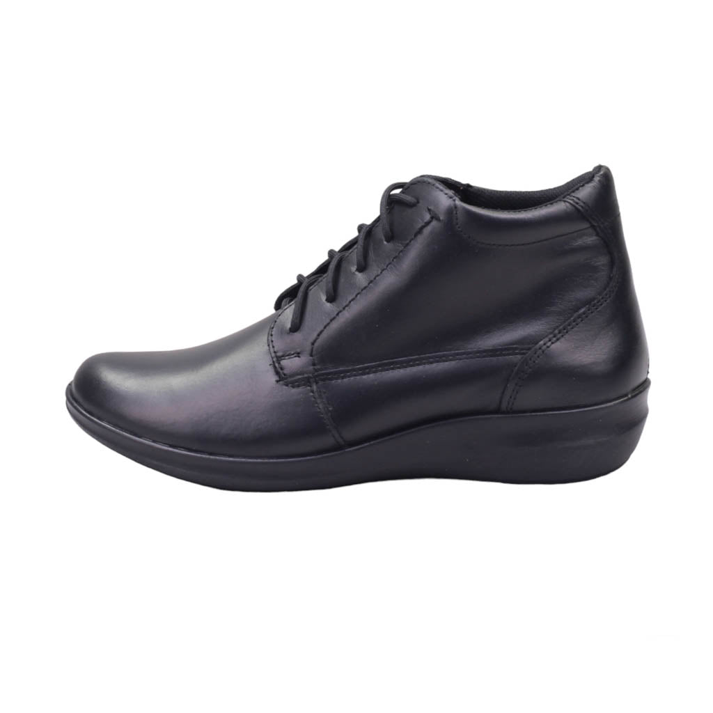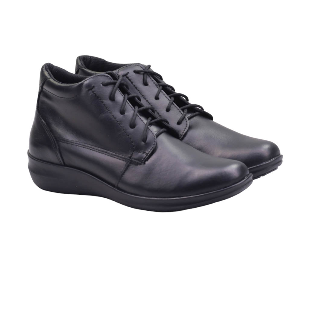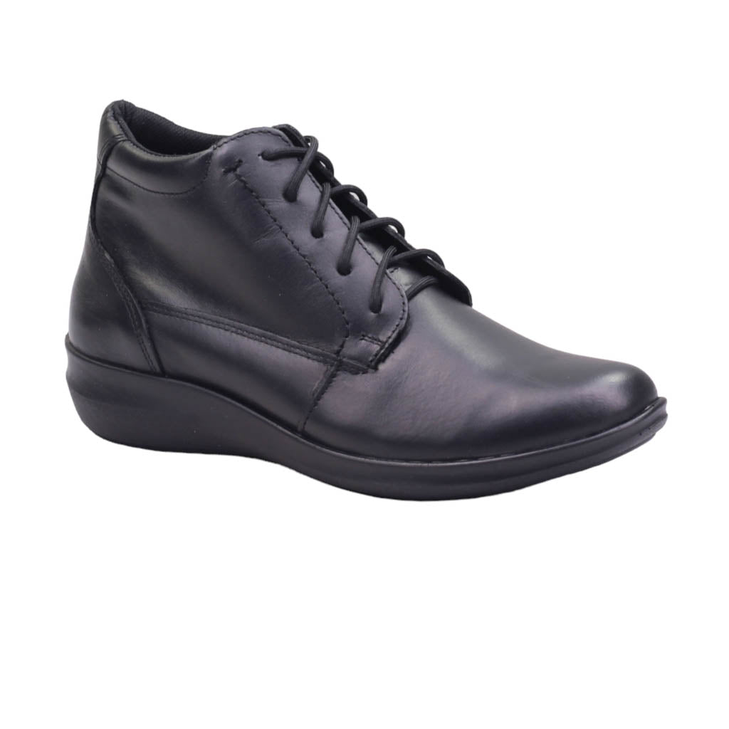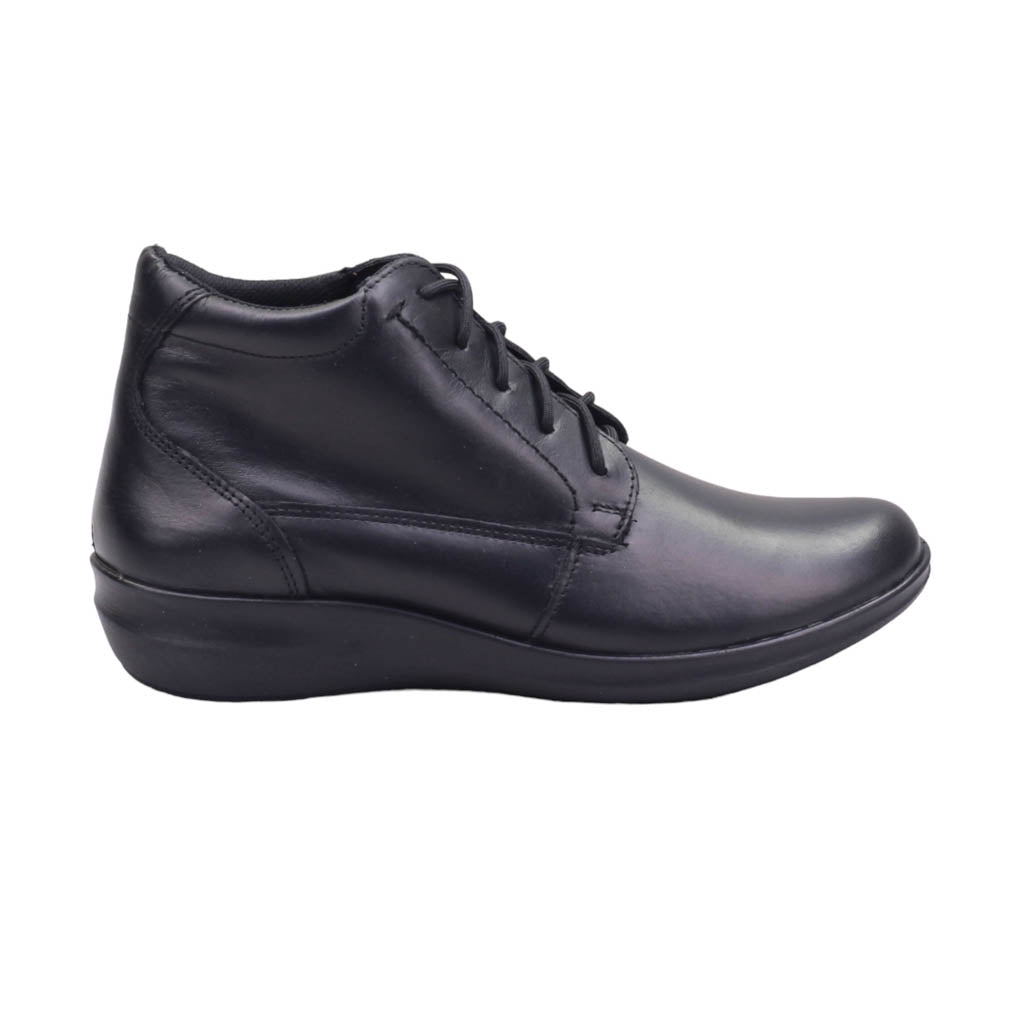 Botín para dama marca 20 Horas en color negro. Este elegante modelo presenta un ajuste personalizado gracias a sus agujetas, lo que garantiza una comodidad excepcional con su plantilla de confort. La suela corrida con una altura trasera de 3.5 cm proporciona mayor apoyo y estabilidad, mientras que su acabado en piel lisa agrega un toque de sofisticación.
