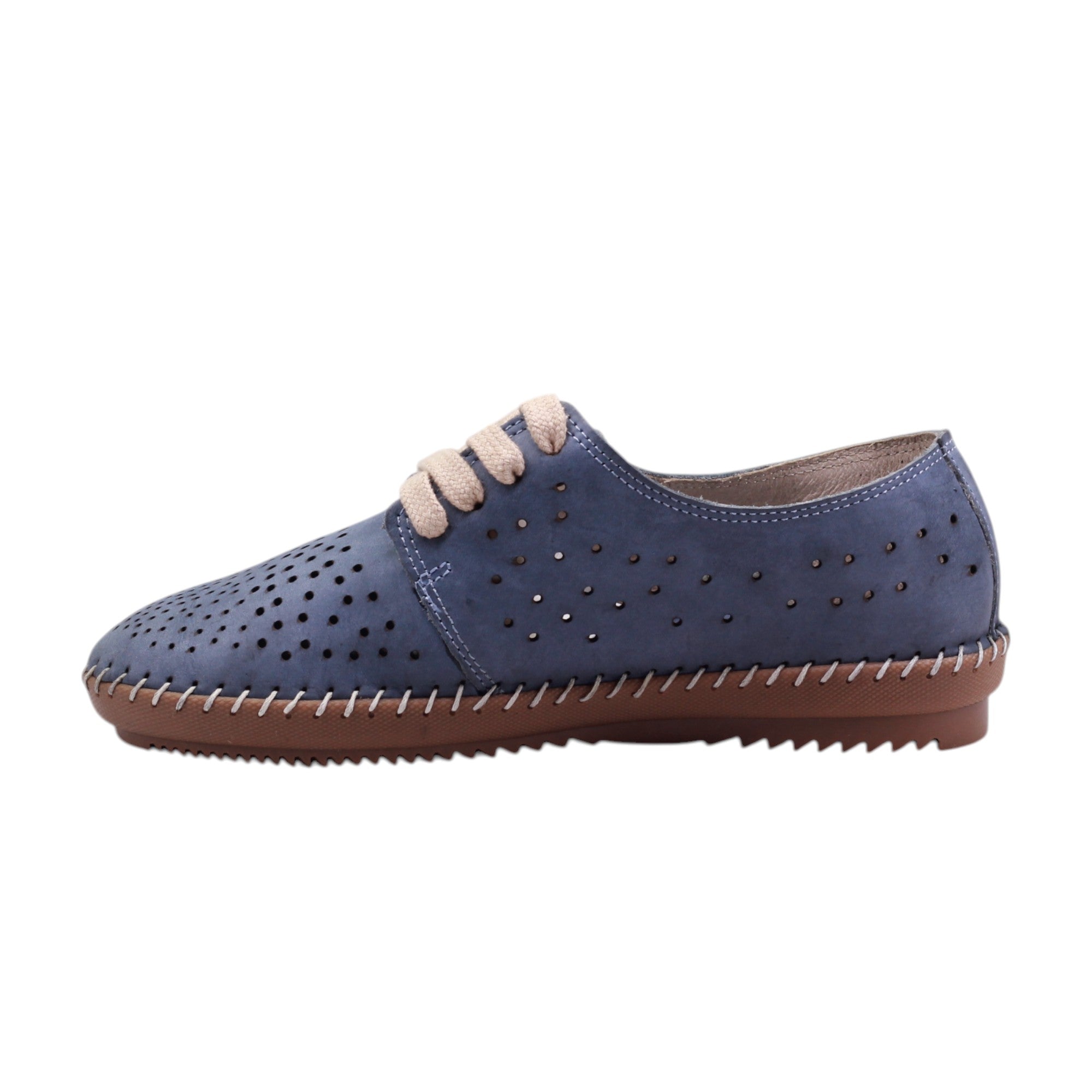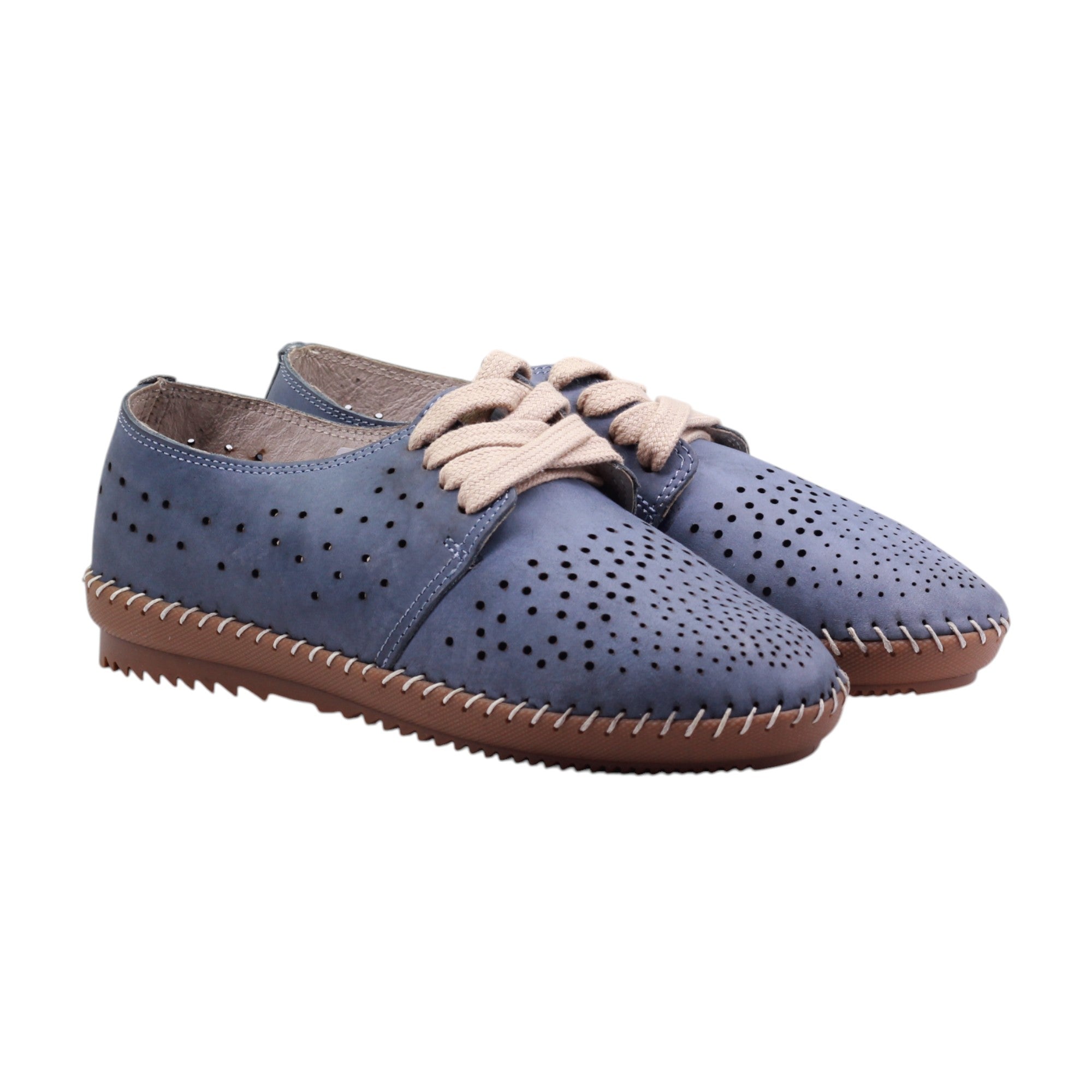 Huarache para dama marca Camina.mx en color azul. Fabricado en piel bovina con forro porcino, este modelo presenta suela de 2.5 cm con dibujo zigzag para mejor agarre. El diseño incluye perforaciones distribuidas en el empeine para ventilación, costuras blancas visibles y cordones beige que contrastan con el acabado mate azul. Ideal para uso diario con estilo relajado y cómodo.