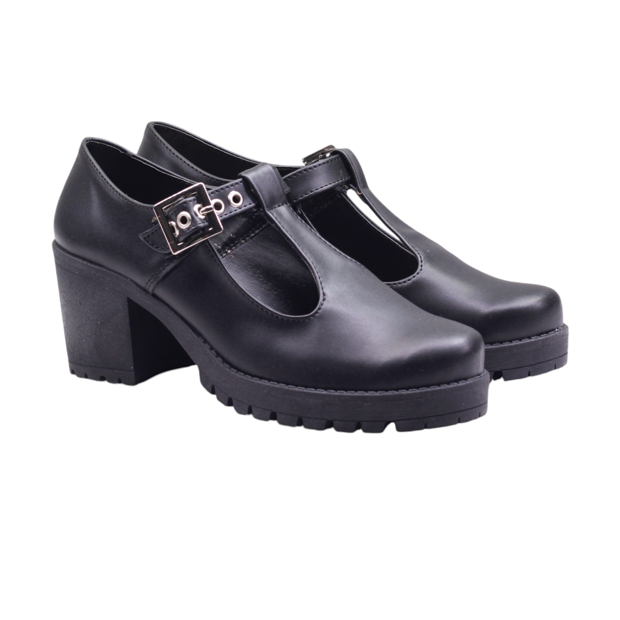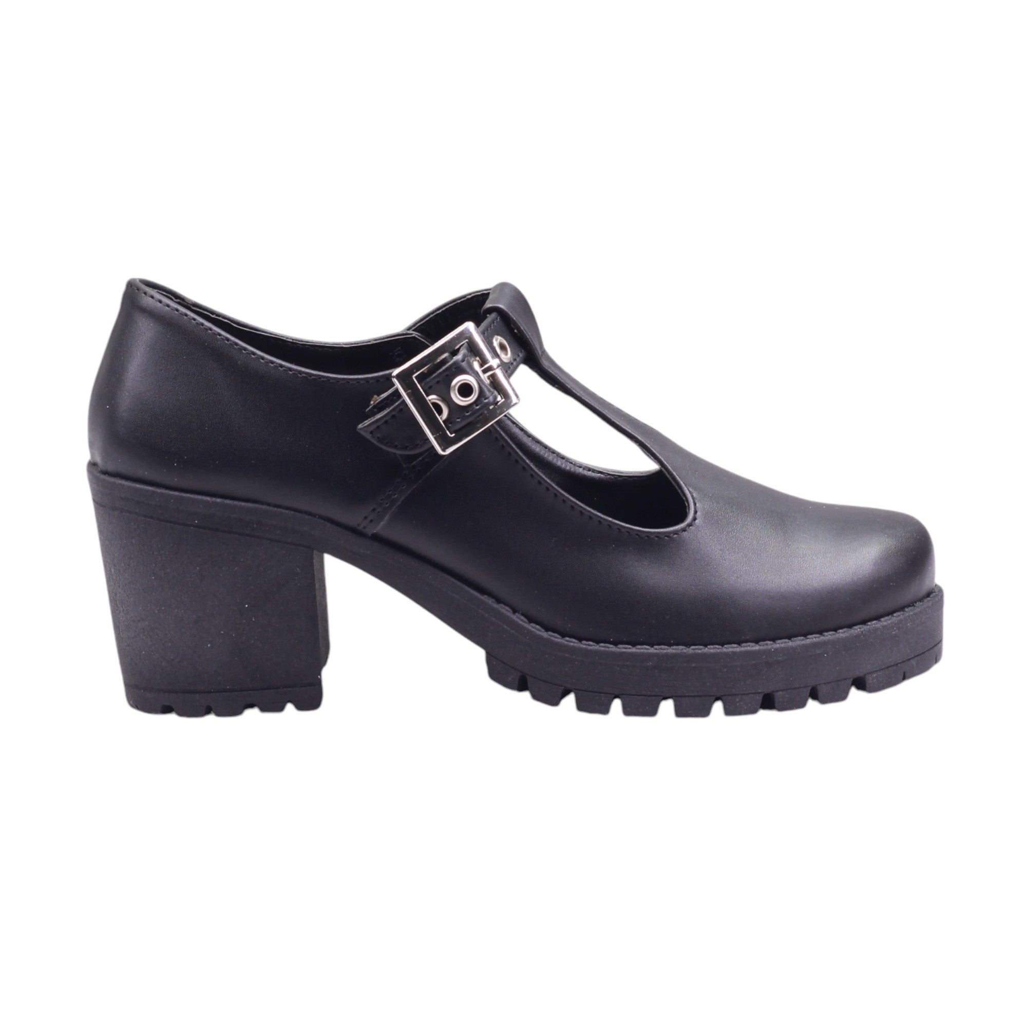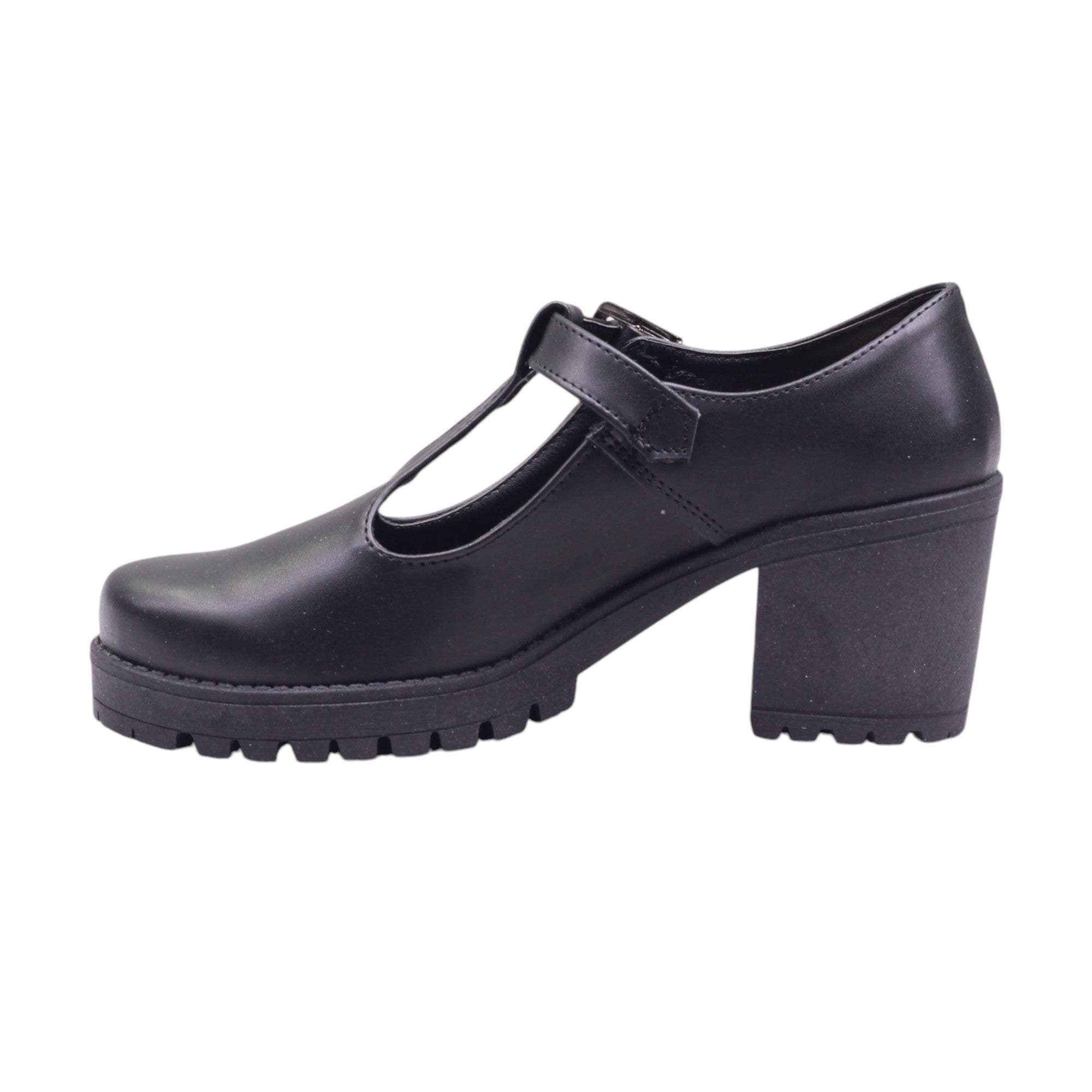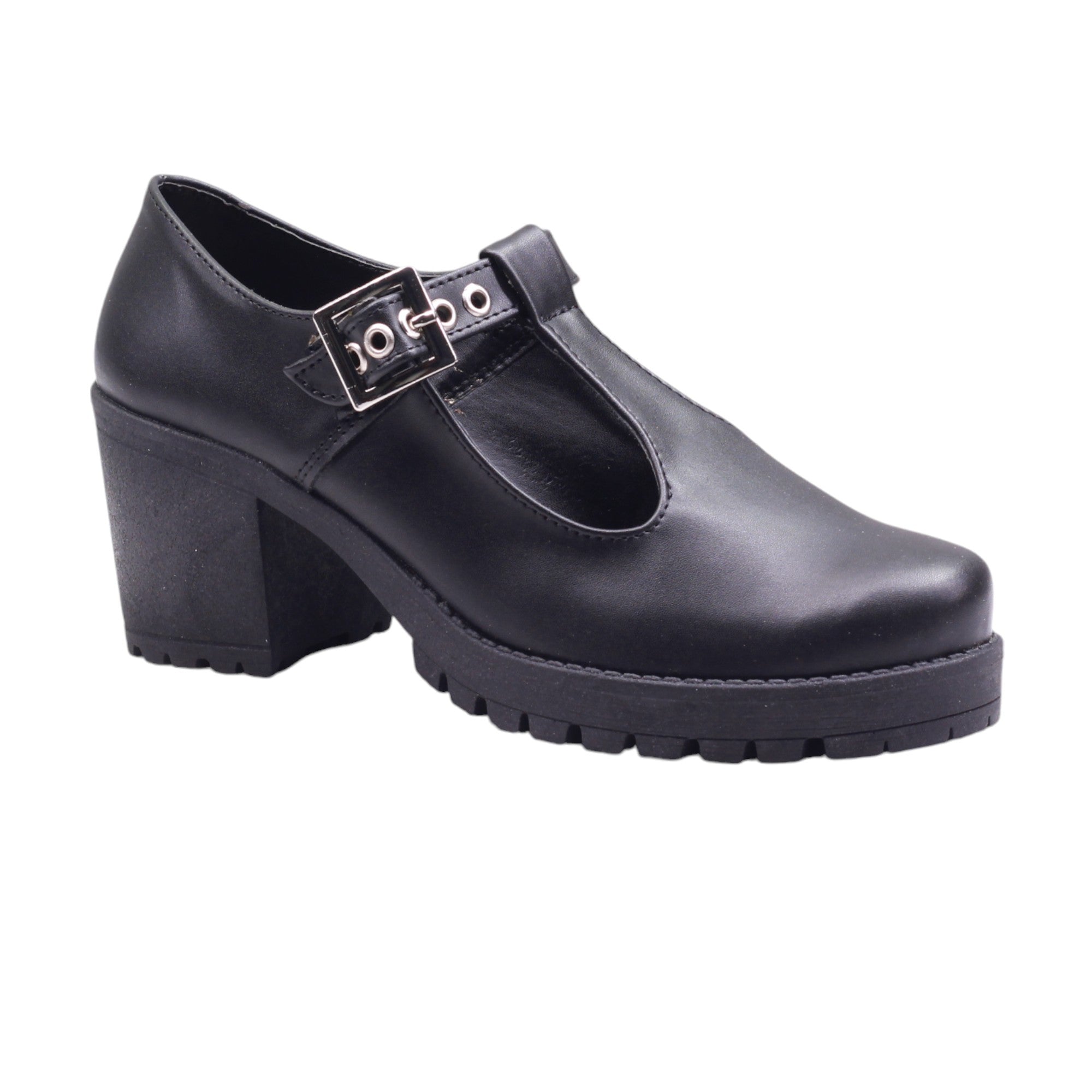 Calzado para dama marca Zócalo en color Negro. Este calzado presenta un modelo de tacón con una altura de 6.5 cm, lo que brinda un gran soporte y comodidad al caminar. Su acabado en piel artificial lisa le da un aspecto elegante y duradero, mientras que su ajuste con hebilla permite un calce perfecto y seguro. Ideal para cualquier ocasión.