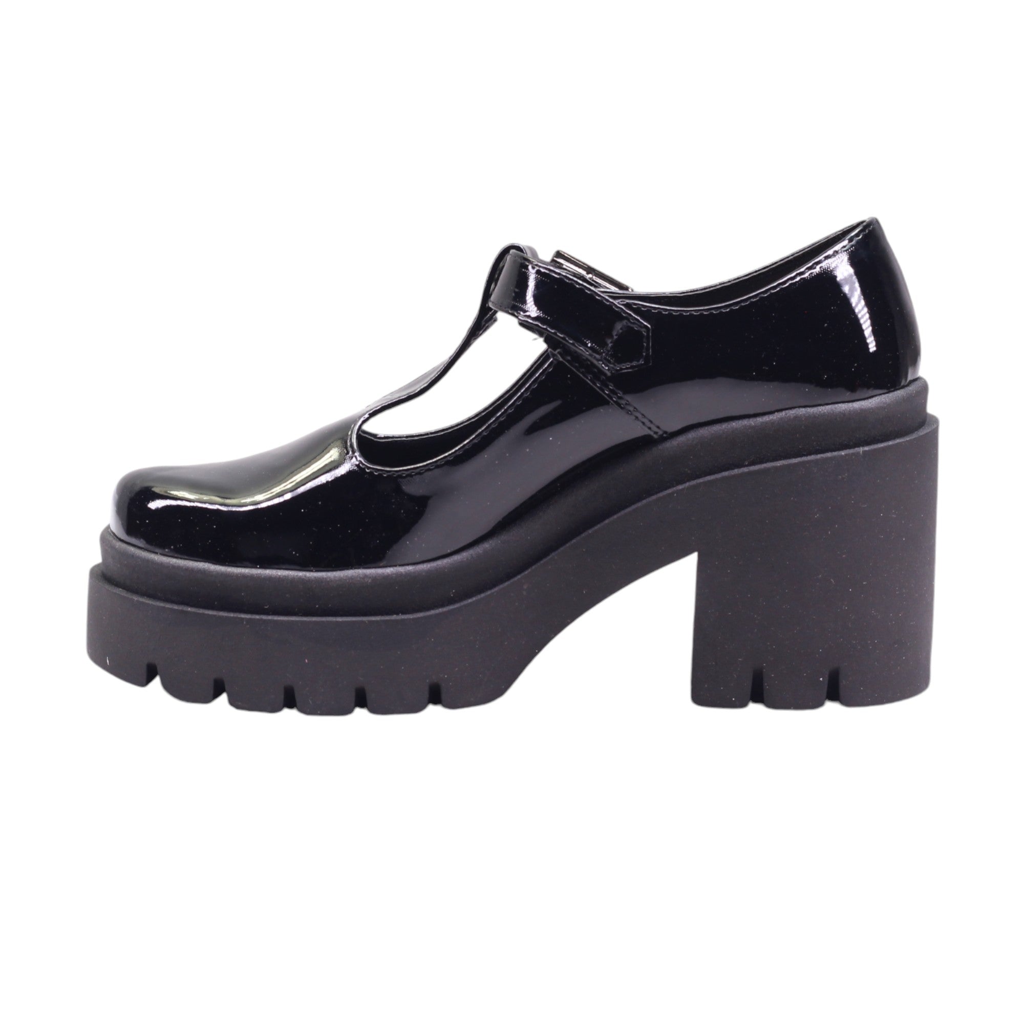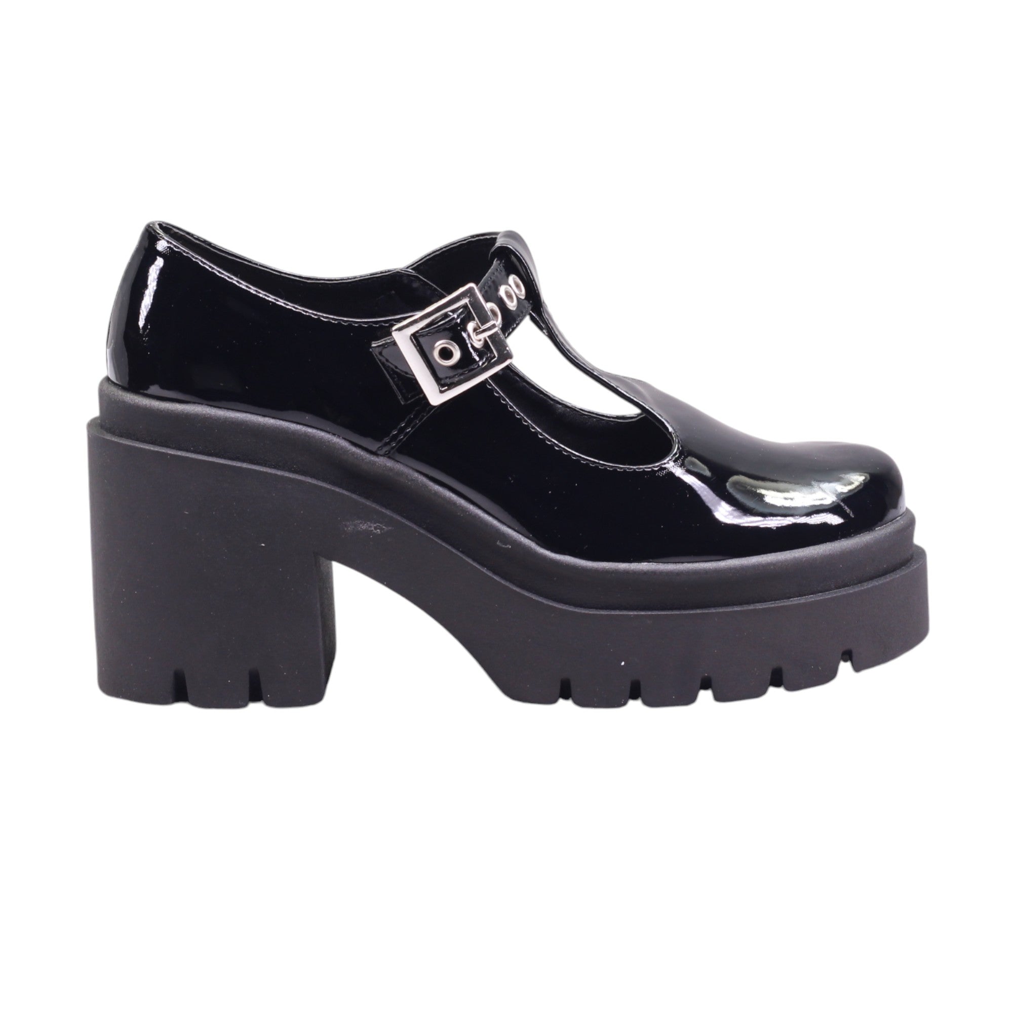Calzado de tacón ancho y ajuste en hebilla, corte de charol
