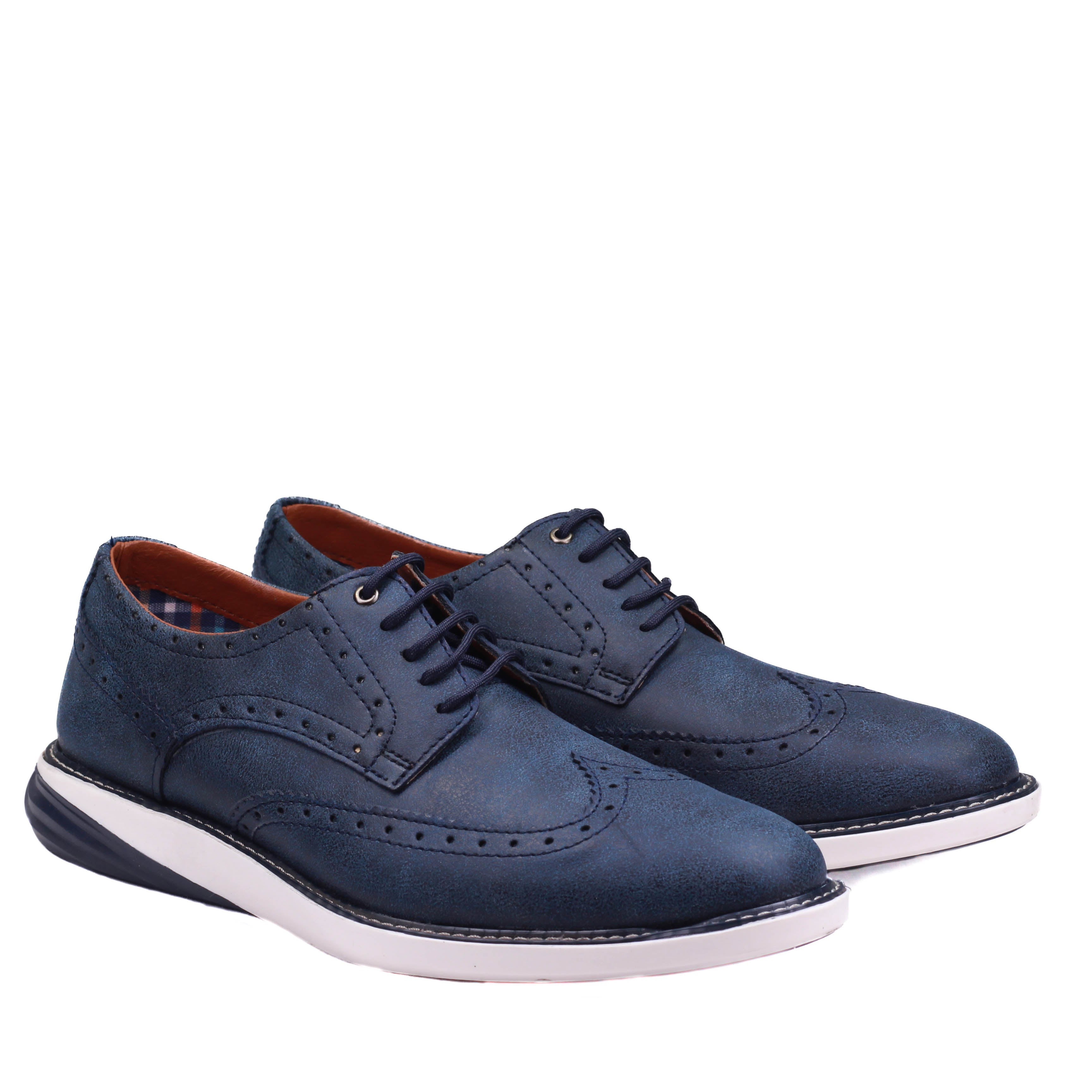 Calzado para caballero marca Lugo Conti en color azul. Calzado tipo bostoniano con suela blanca.