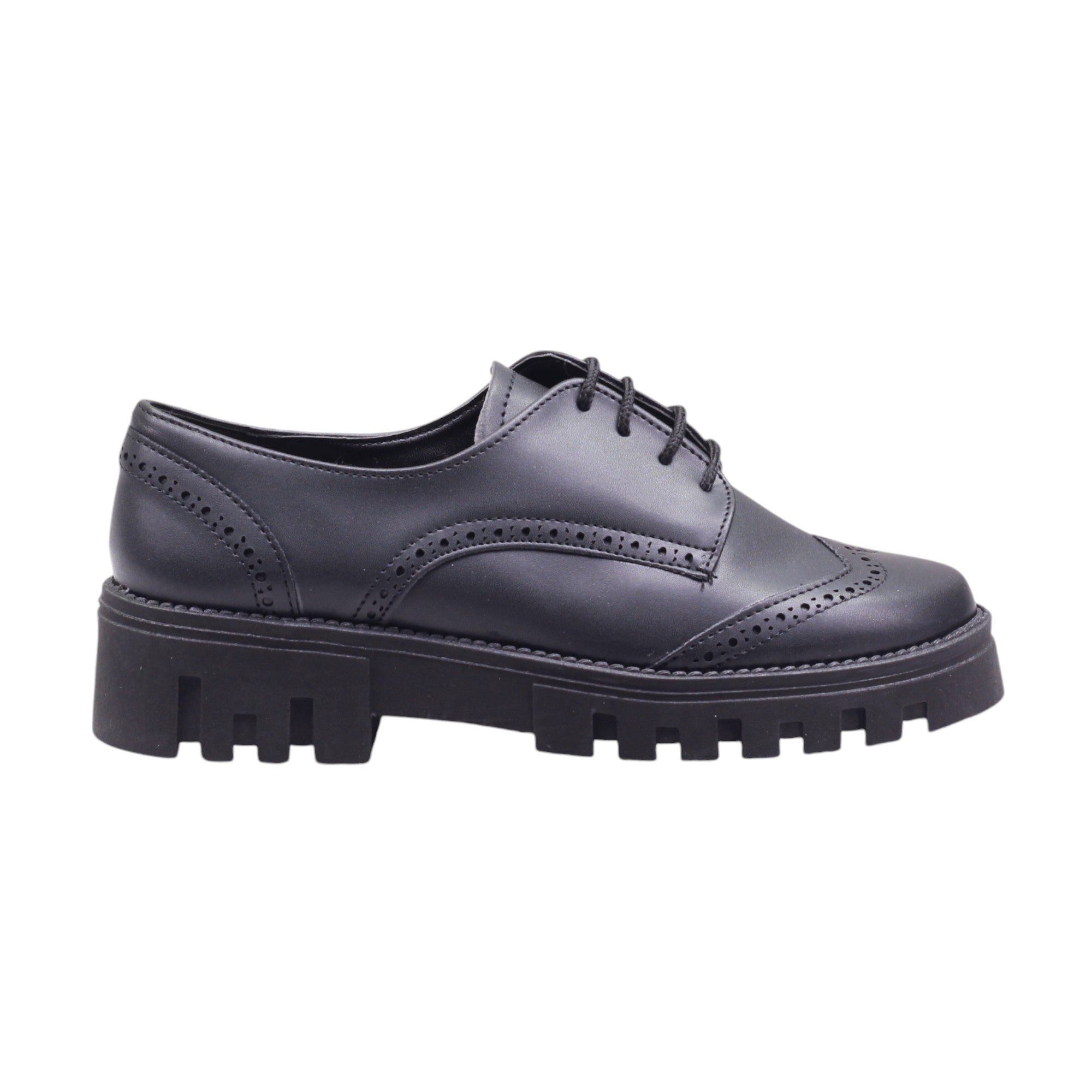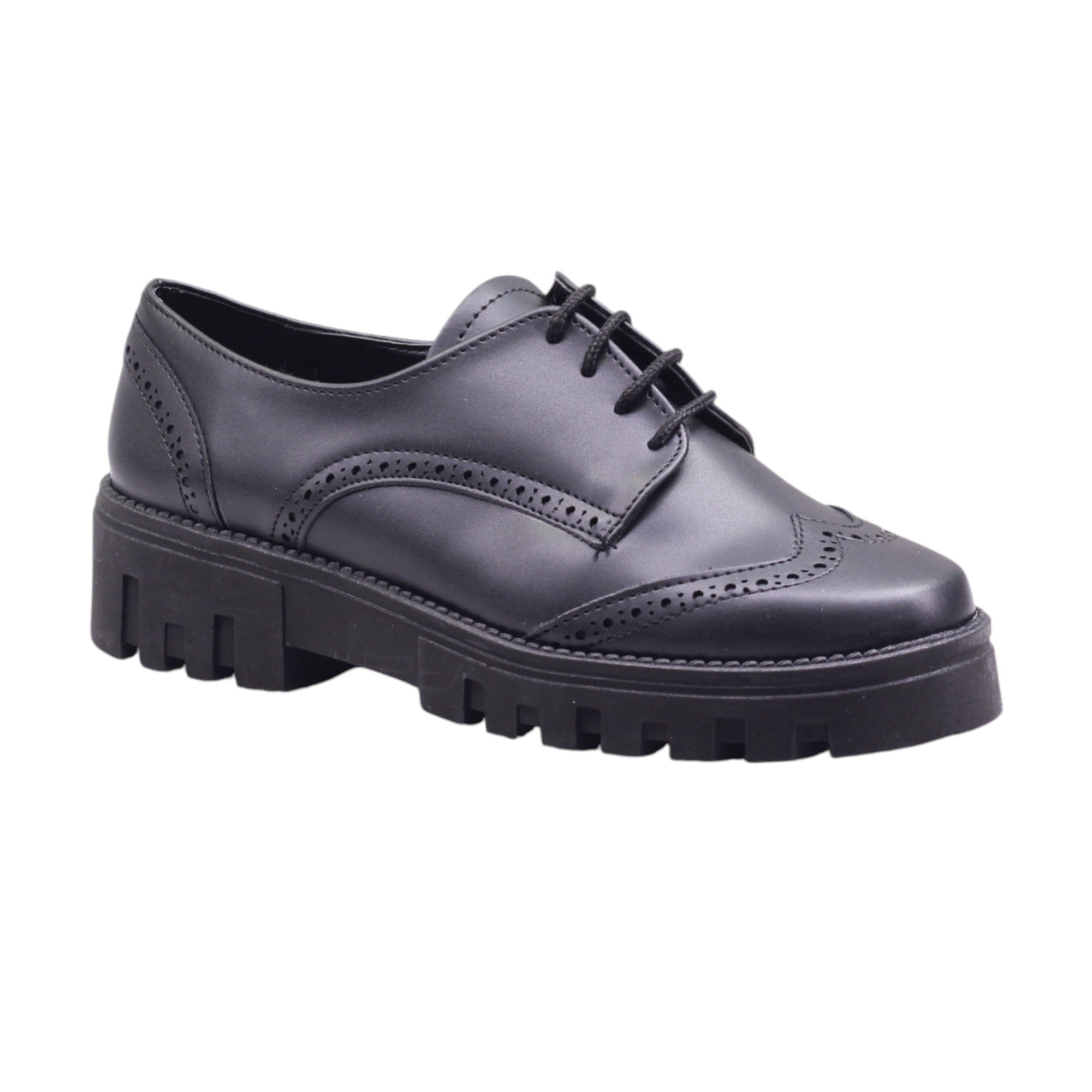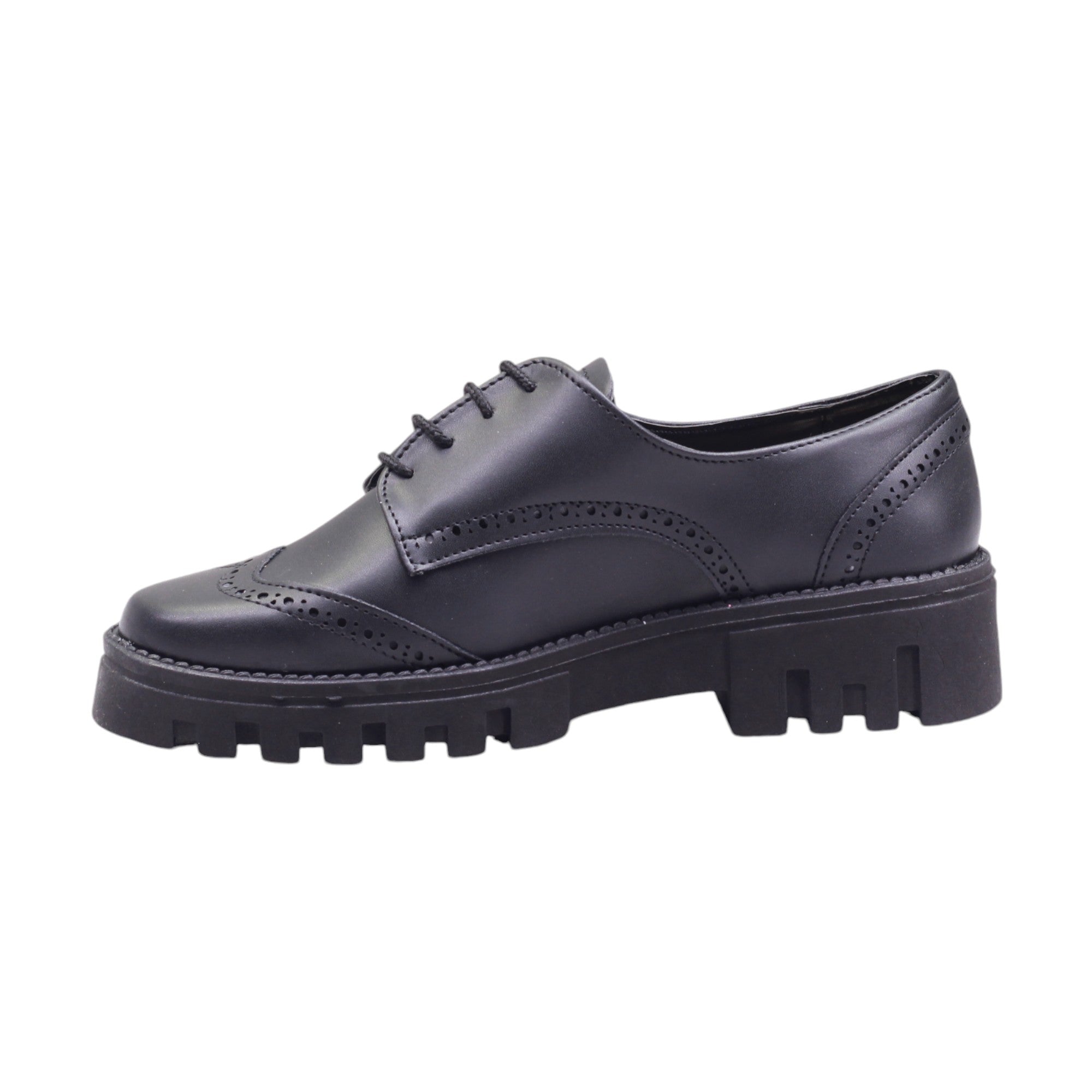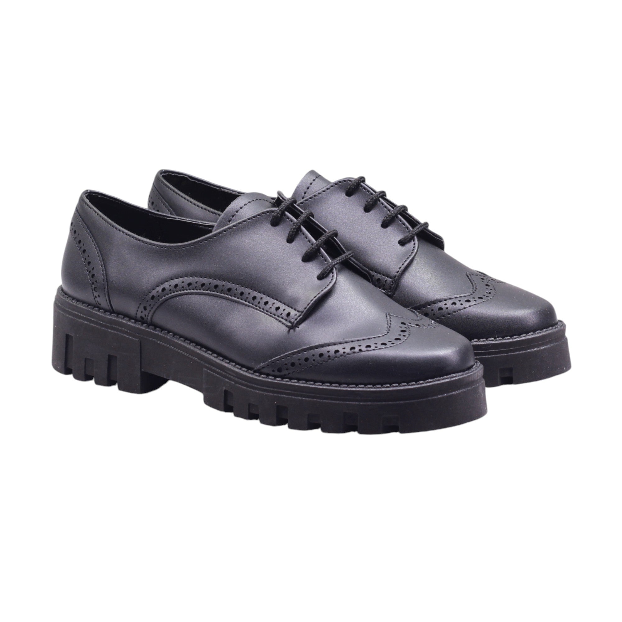 Calzado para dama marca Zócalo en color Negro. Este calzado presenta un modelo de suela ancha con una altura de 4.00 cm, lo que brinda un gran soporte y comodidad al caminar. Su acabado en piel artificial lisa le da un aspecto elegante y duradero, mientras que su ajuste en agujetas permite un calce perfecto y seguro. Ideal para cualquier ocasión.