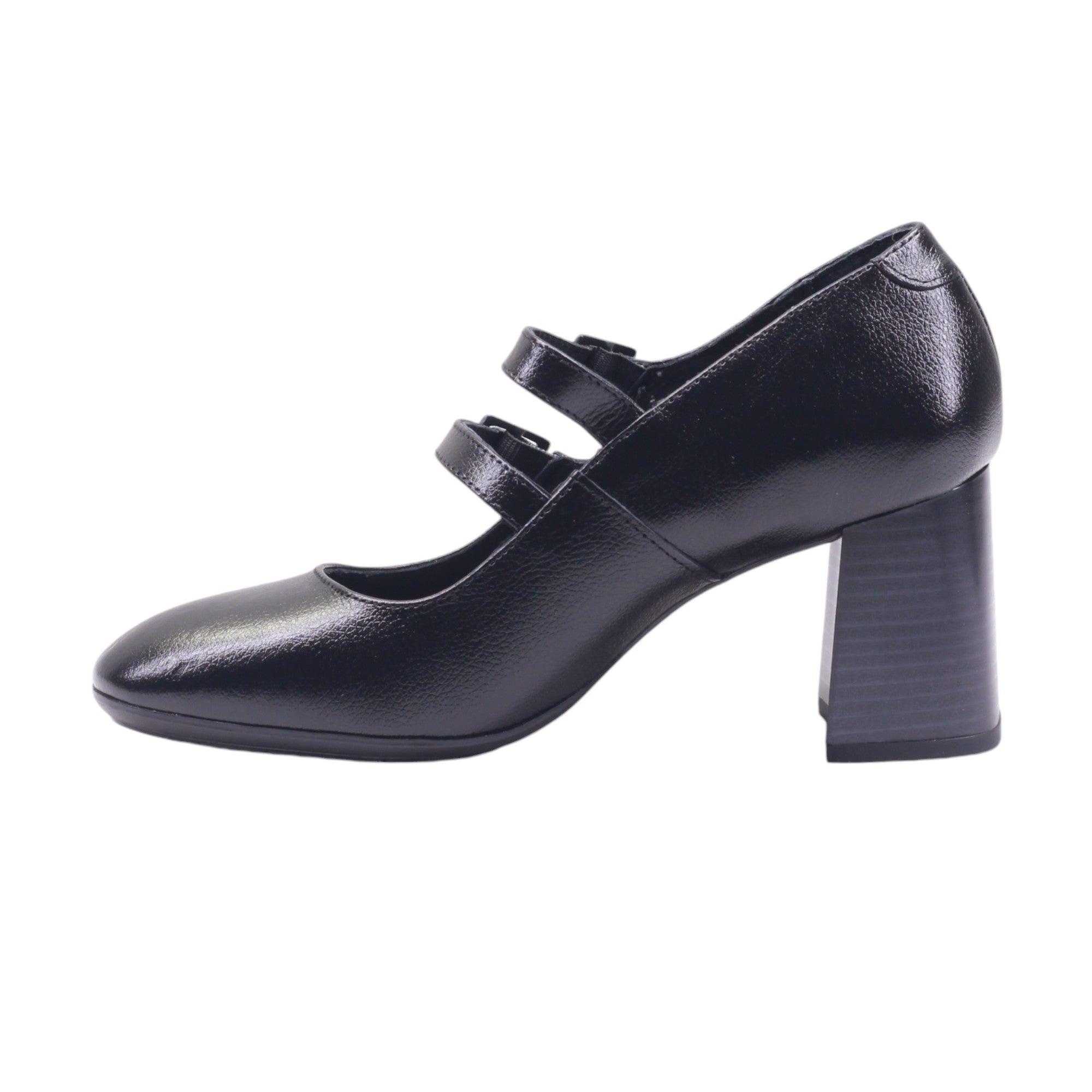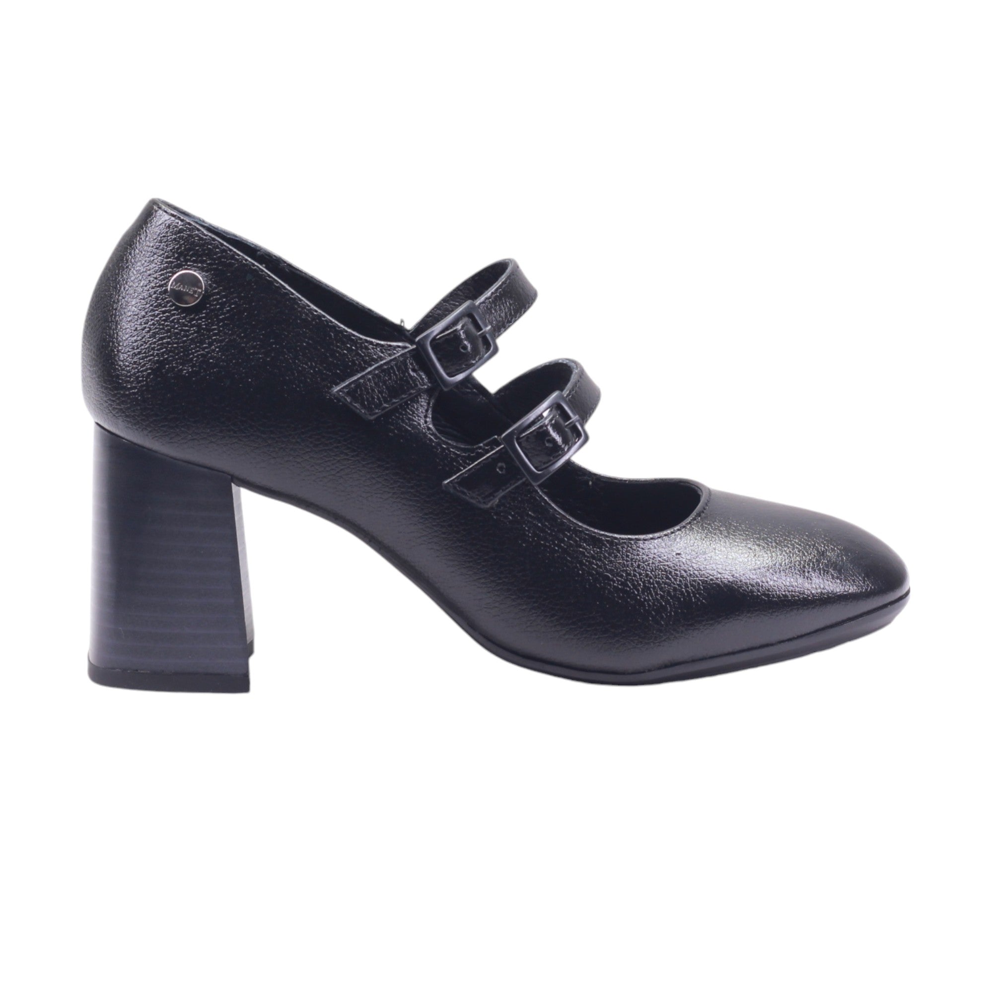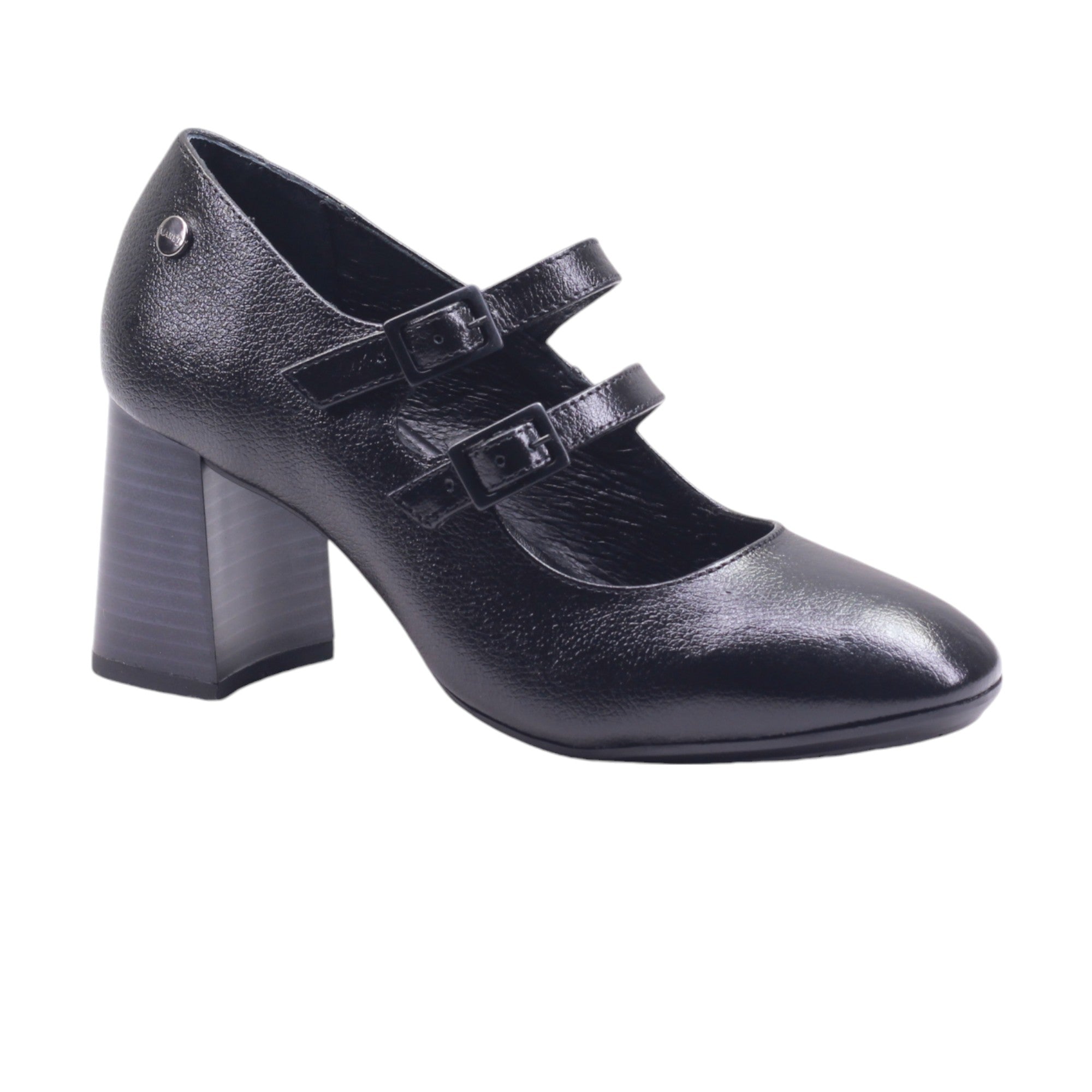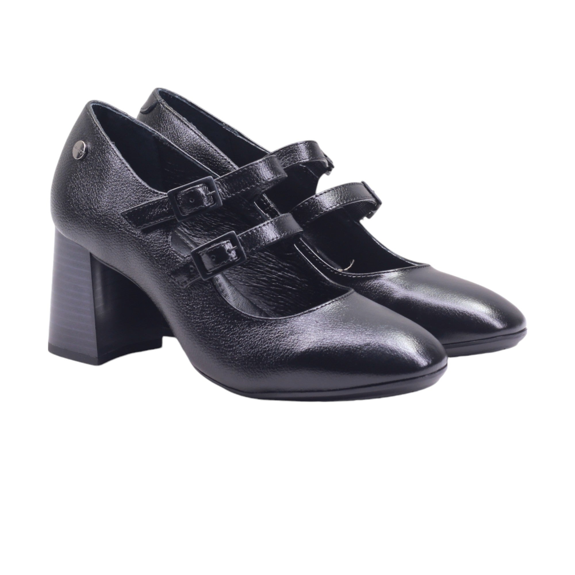 Calzado para dama marca Manet Moda en color negro. Modelo de tacón de 7.00 cm con terminado de piel vacuna. Diseño con doble tira ajustable con hebilla para mayor comodidad al caminar. ¡Eleva tu estilo y comodidad con este modelo!