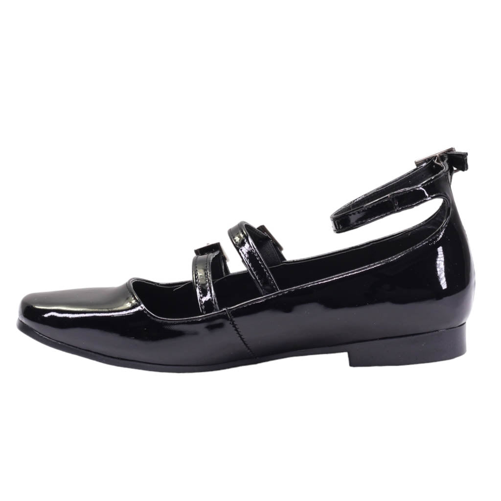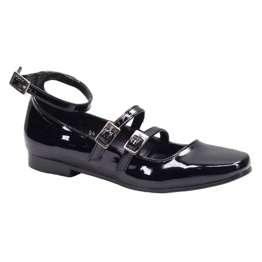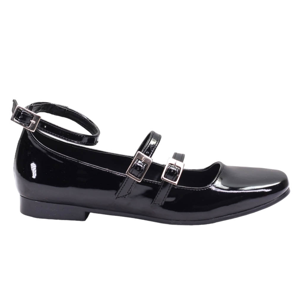 Calzado para dama marca Zócalo en color negro. Disfruta de una mayor comodidad con nuestro modelo de tacón bajo, corte con acabado en charol. Sus tres tiras con hebilla aseguran un ajuste personalizado, mientras que su punta redonda añade un toque clásico a tu look. ¡Camina con estilo y confort con este elegante par de zapatos!
