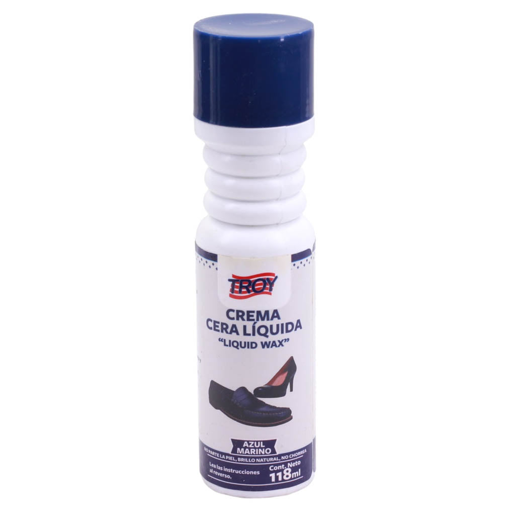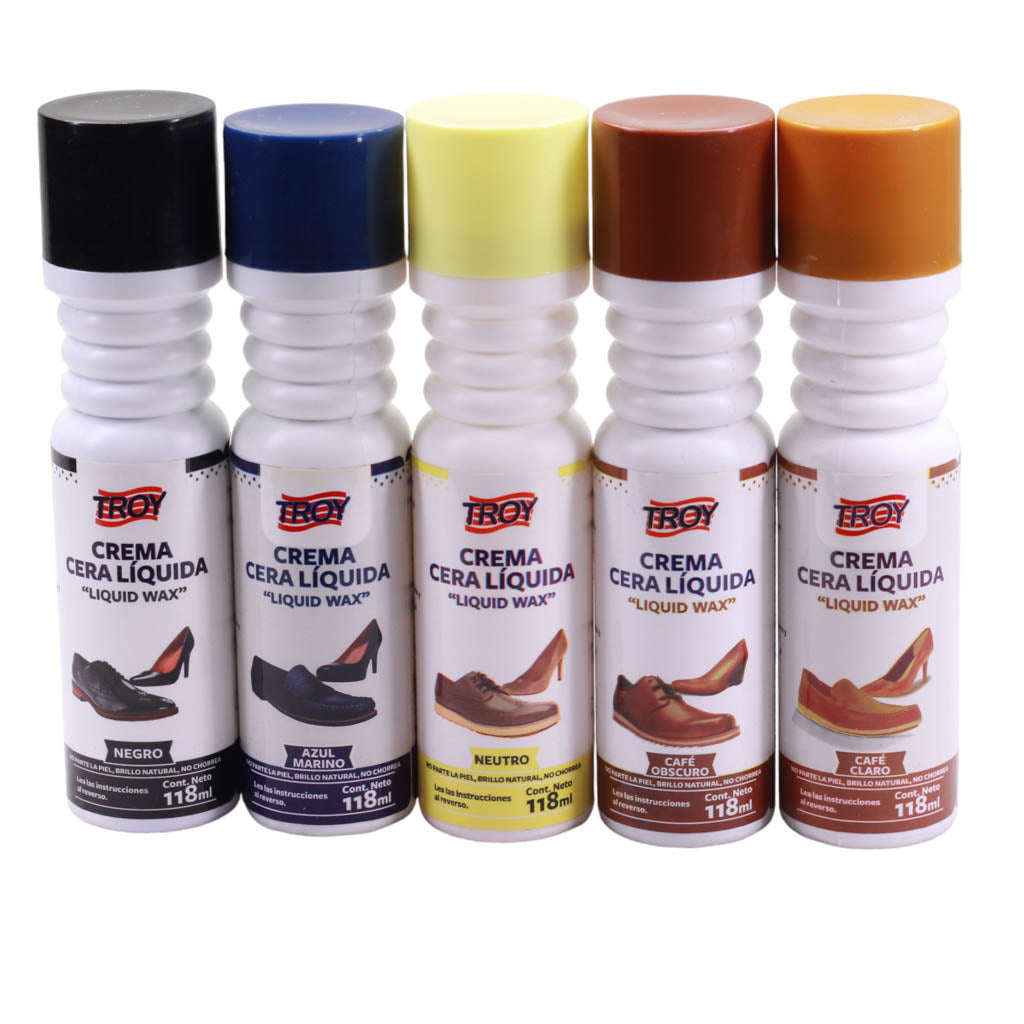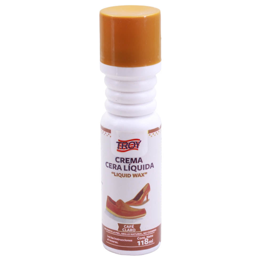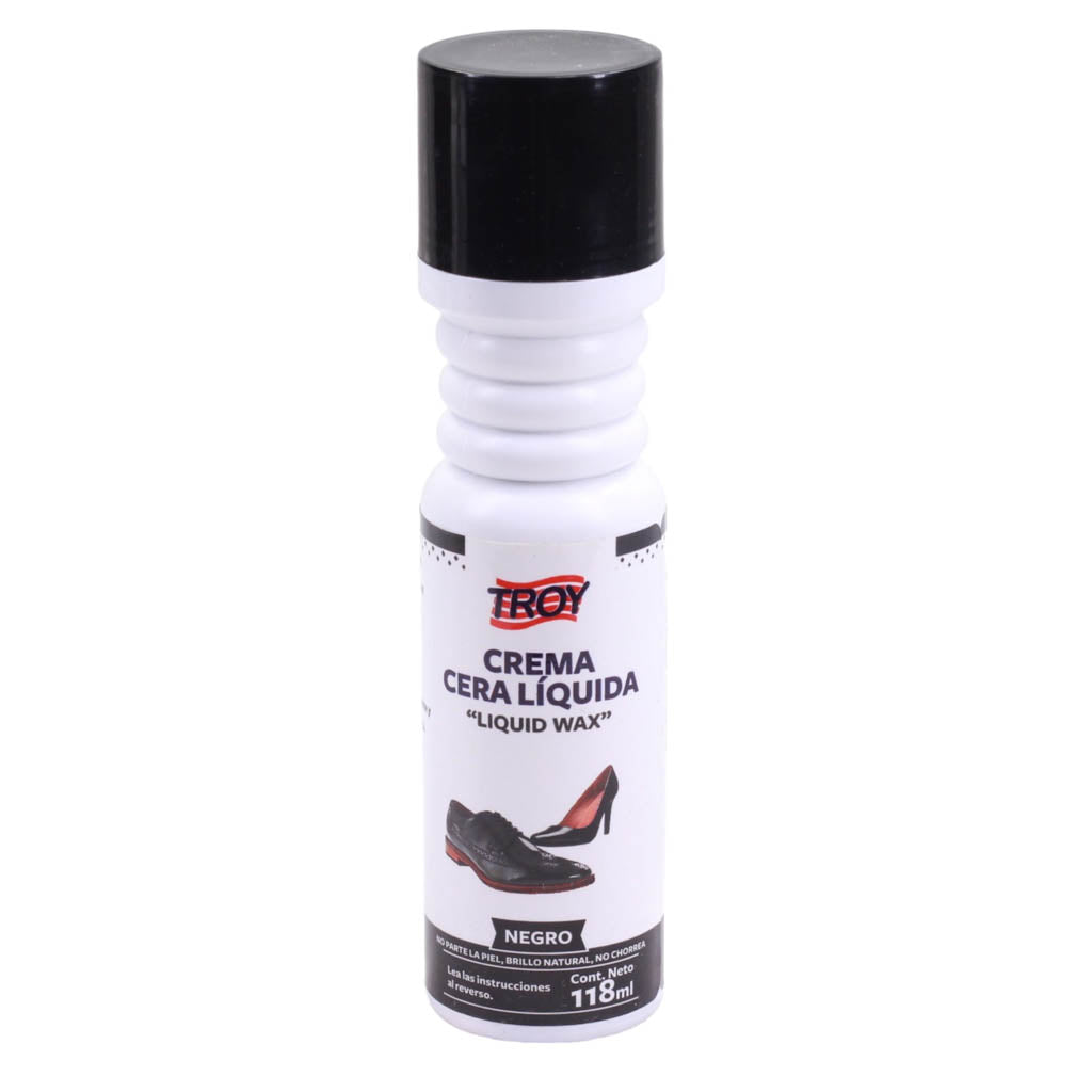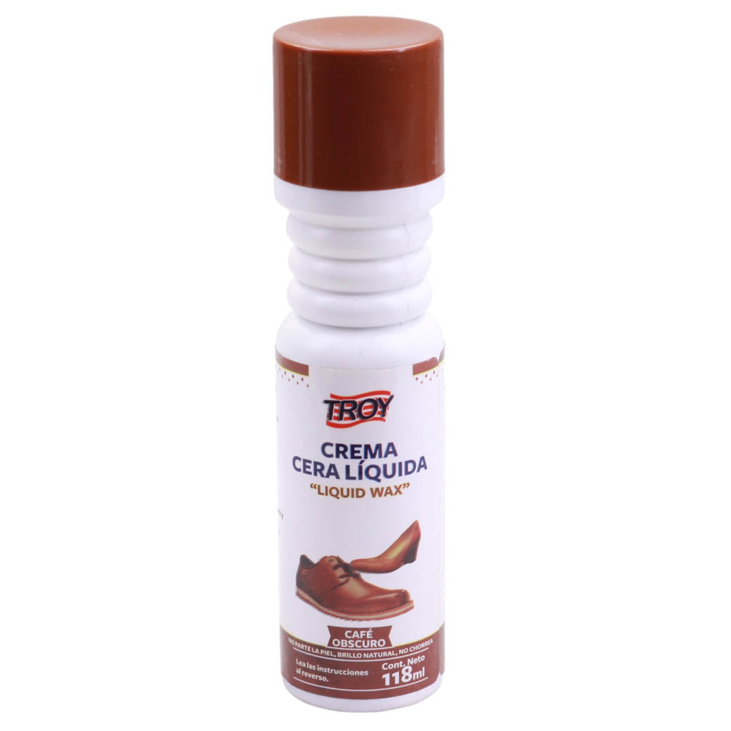 Cera liquida para calzado marca Troy. Es ideal para restaurar la apariencia original del calzado, ayudando a recuperar el color original a base de pigmentos. Ayuda a ocultar los daños en la piel del calzado, deja la superficie más suave al tacto