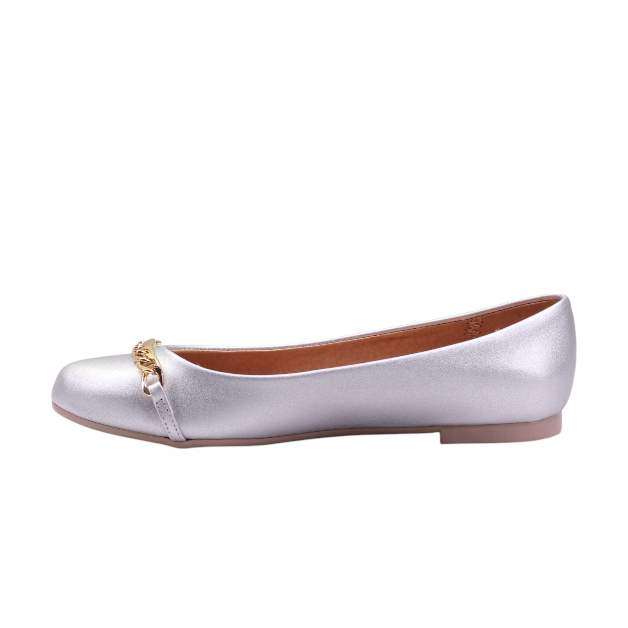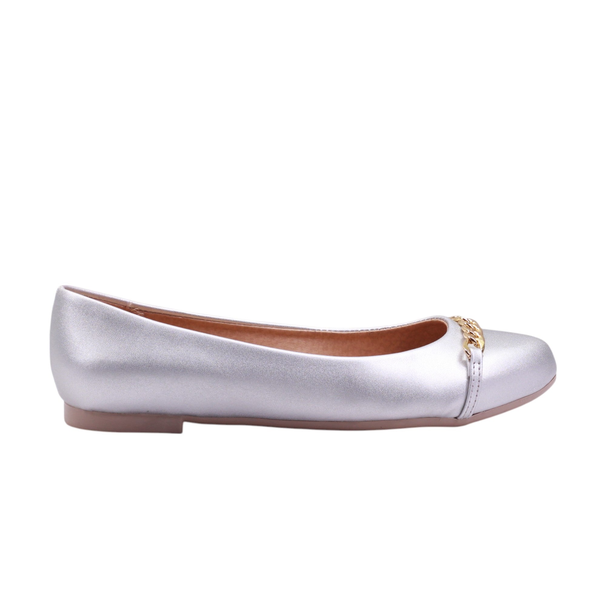 Flats para dama marca Zócalo en colores silken y silver. Este flat casual combina comodidad y estilo con un diseño versátil y moderno. Su punta redonda suaviza la silueta del calzado, mientras que el tacón bajo ofrece una ligera elevación ideal para el uso diario. El detalle más distintivo es el adorno de eslabones metálicos en el frente, que aporta un toque urbano y elegante al diseño. Fabricado en material sintético, este modelo es perfecto para complementar atuendos casuales, de oficina o incluso looks más relajados con un toque sofisticado.