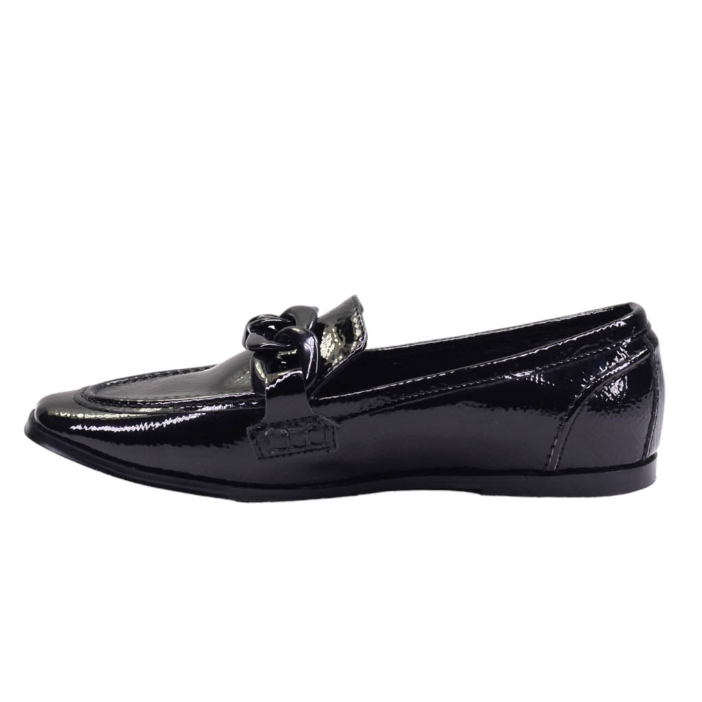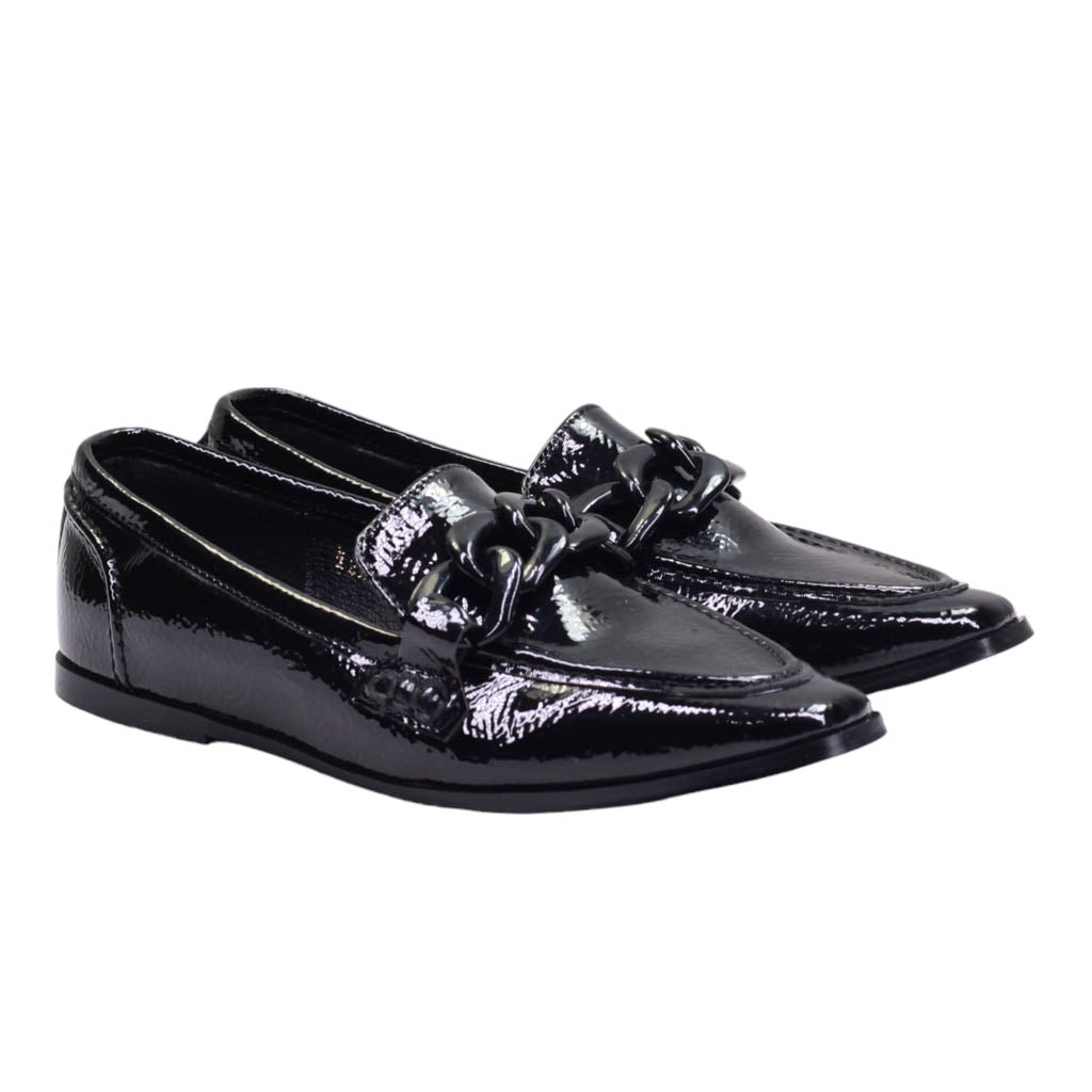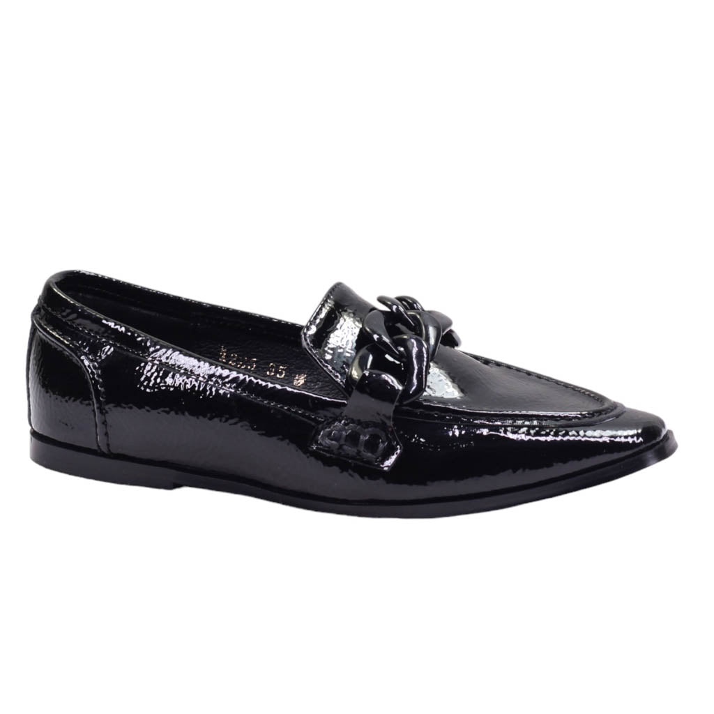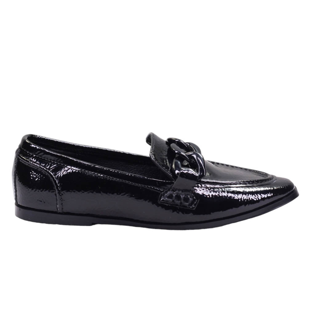 Flat para dama marca Macada en color negro. Bonito diseño de punta que brinda una apariencia moderna y un tacón bajo que garantiza mayor comodidad al caminar. Además, dispone de eslabones de adorno y una plantilla de confort, todo ello con un acabado en charol para un look refinado.