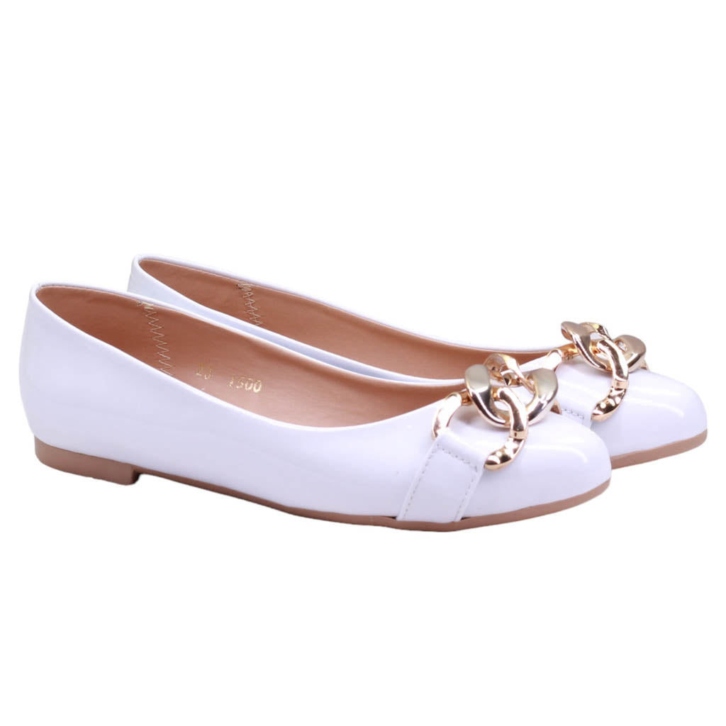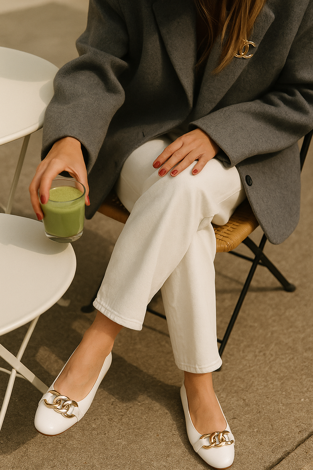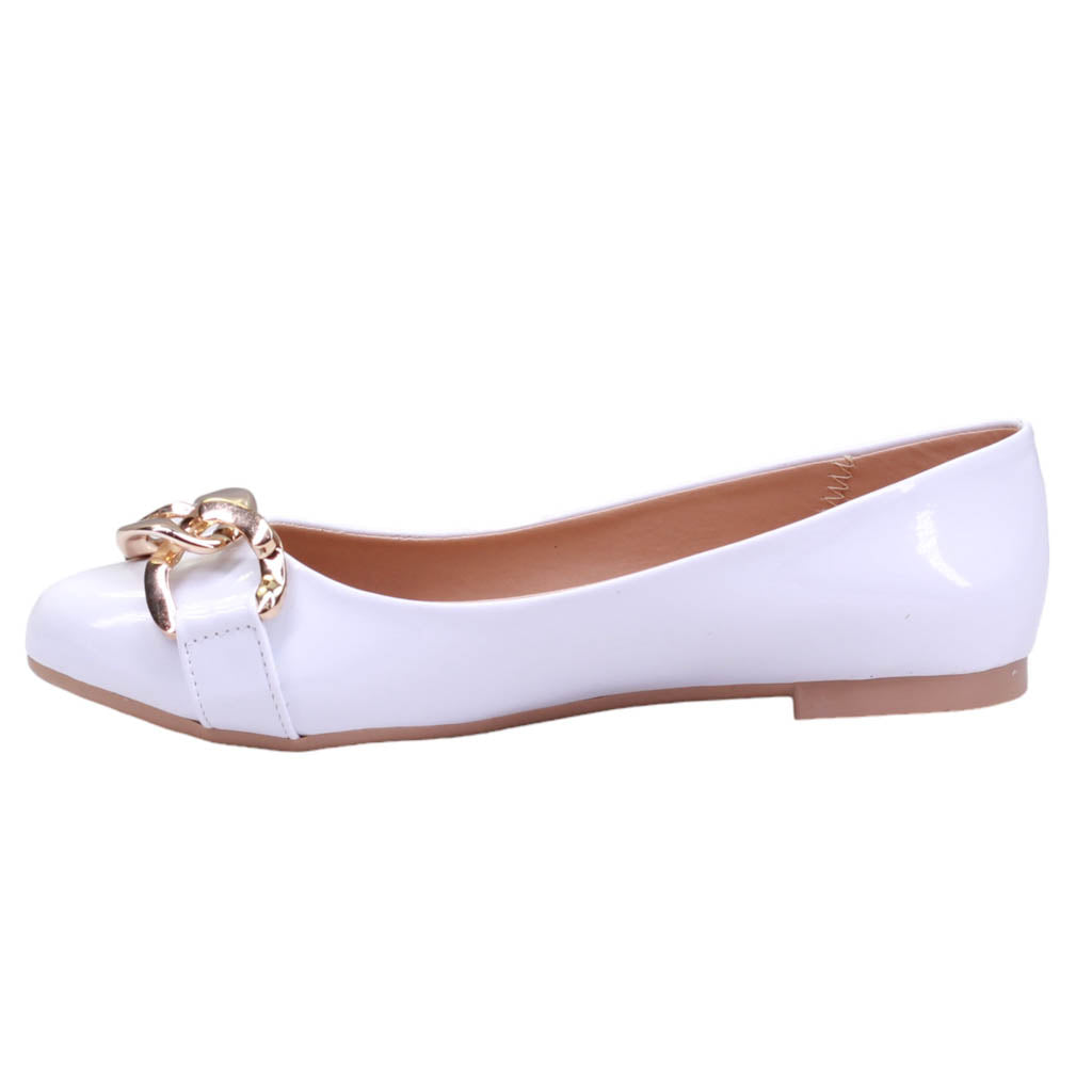 Flats para dama marca Zócalo en colores Blanco, negro y venado. Este modelo tiene un elegante punta redonda con eslabones dorados. Con un cómodo tacón bajo y una plantilla de confort, te brindan un estilo sofisticado y al mismo tiempo una gran comodidad. Perfectos para lucir elegante en cualquier ocasión.