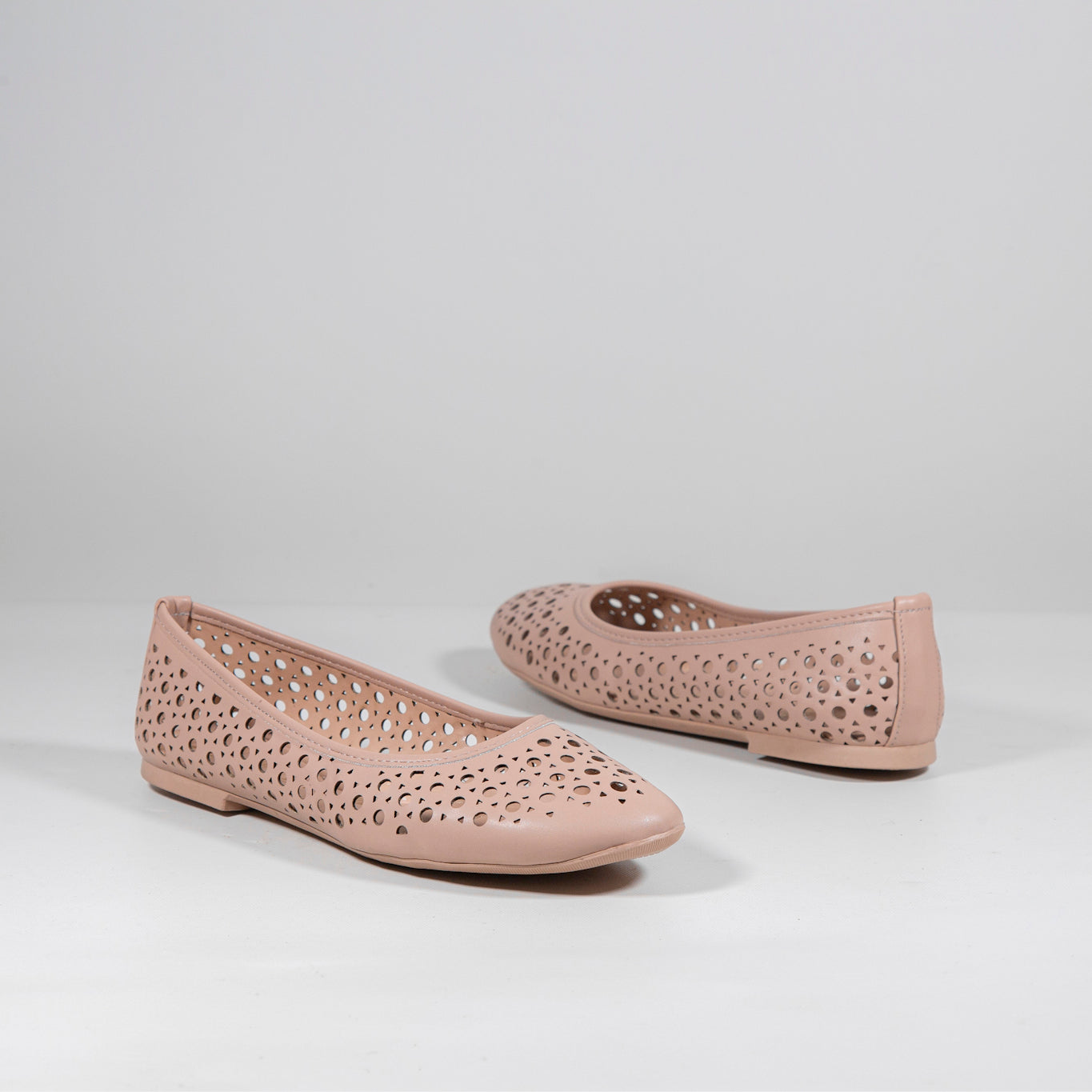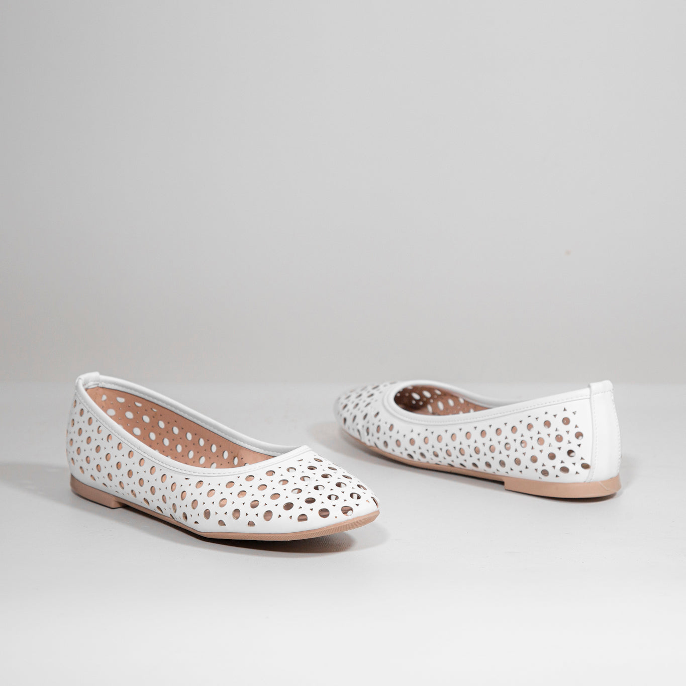 Flats para dama marca Zócalo en colores blanco y maquillaje. Este modelo de zapato presenta una punta redonda y un corte con perforaciones, lo que proporciona una mayor comodidad y transpirabilidad. Su tacón bajo y plantilla de confort son ideales para caminatas largas, brindando soporte y comodidad a tus pies. ¡Perfecto para tus aventuras al aire libre!