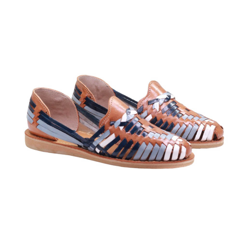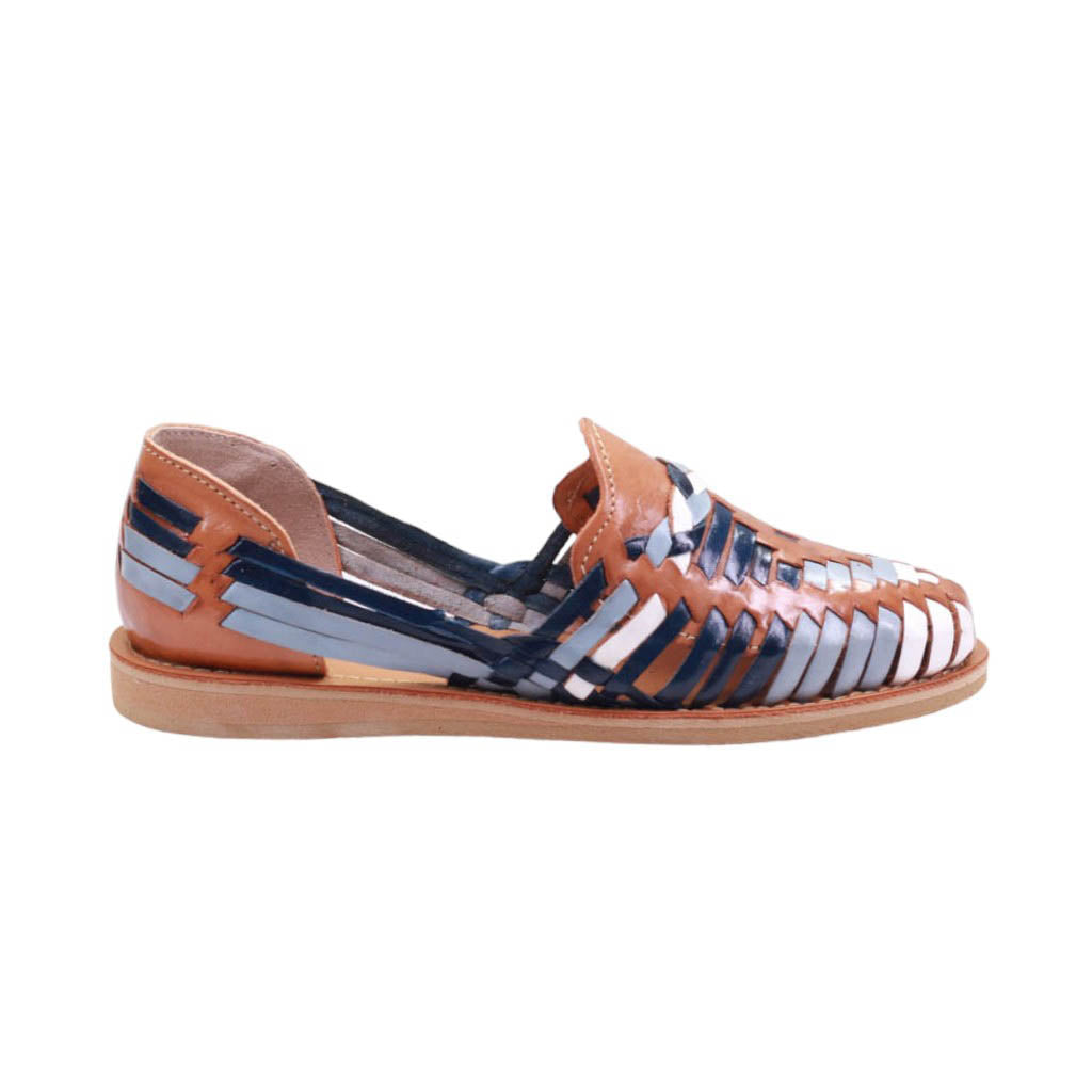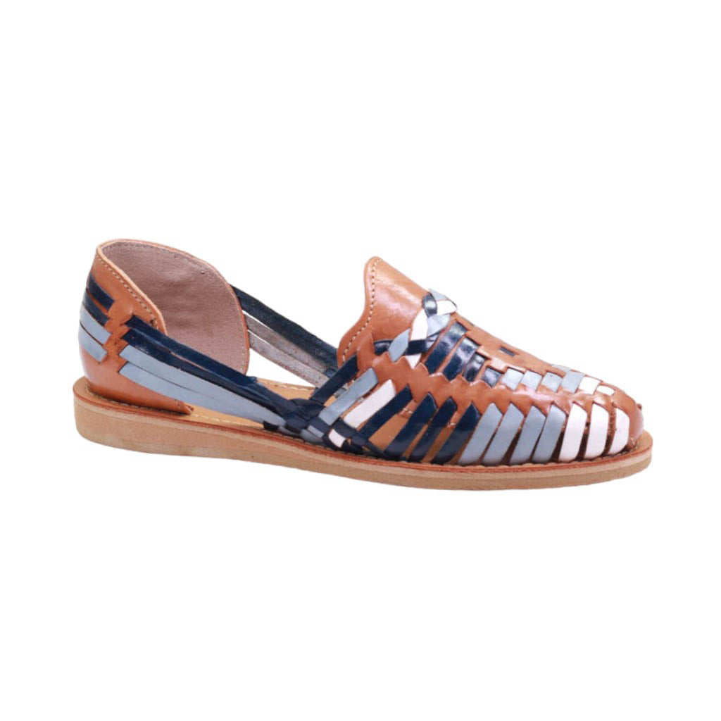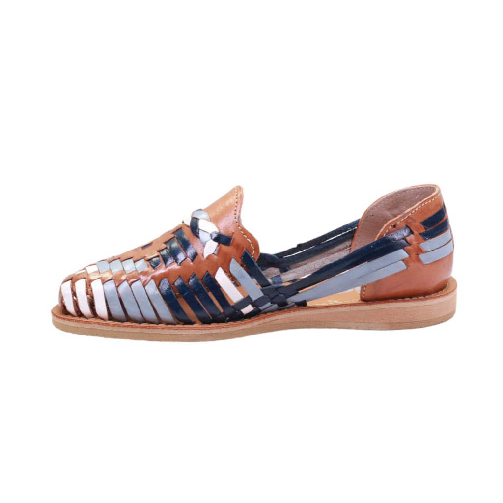 Huarache para dama marca Indios en color tan combinado. Es una sandalia de cuero, plana, que se caracteriza principalmente por un trabajo de trenzado único en el mundo, que sujeta el pie con complicados y hermosos tejidos sobre una suela.