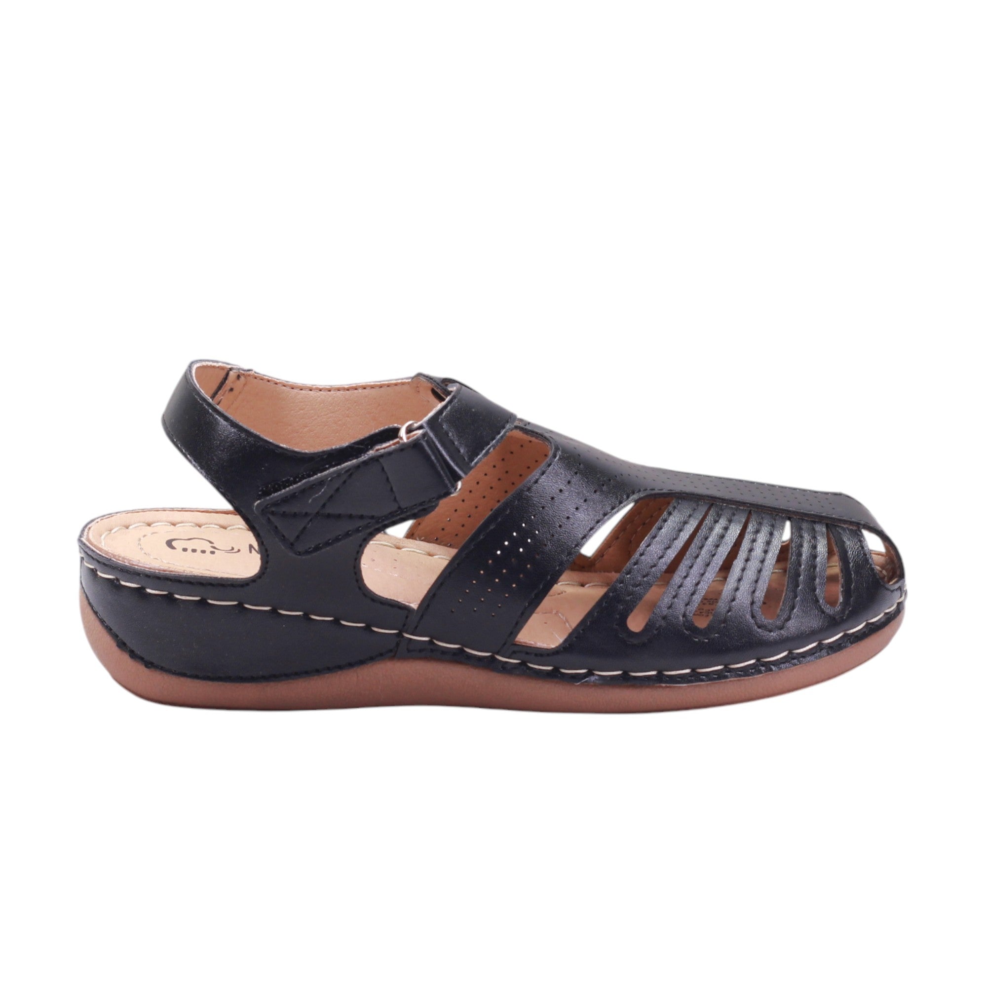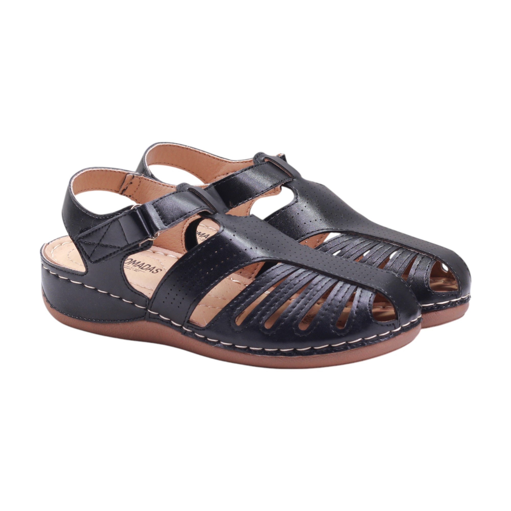 Sandalia para dama marca Nómadas en color negro y tan. Este modelo presenta un ajuste con velcro para mayor comodidad y facilidad en el calce. Cuenta con una plantilla cómoda para brindar soporte y amortiguación. Inspirado en el diseño clásico huarache.