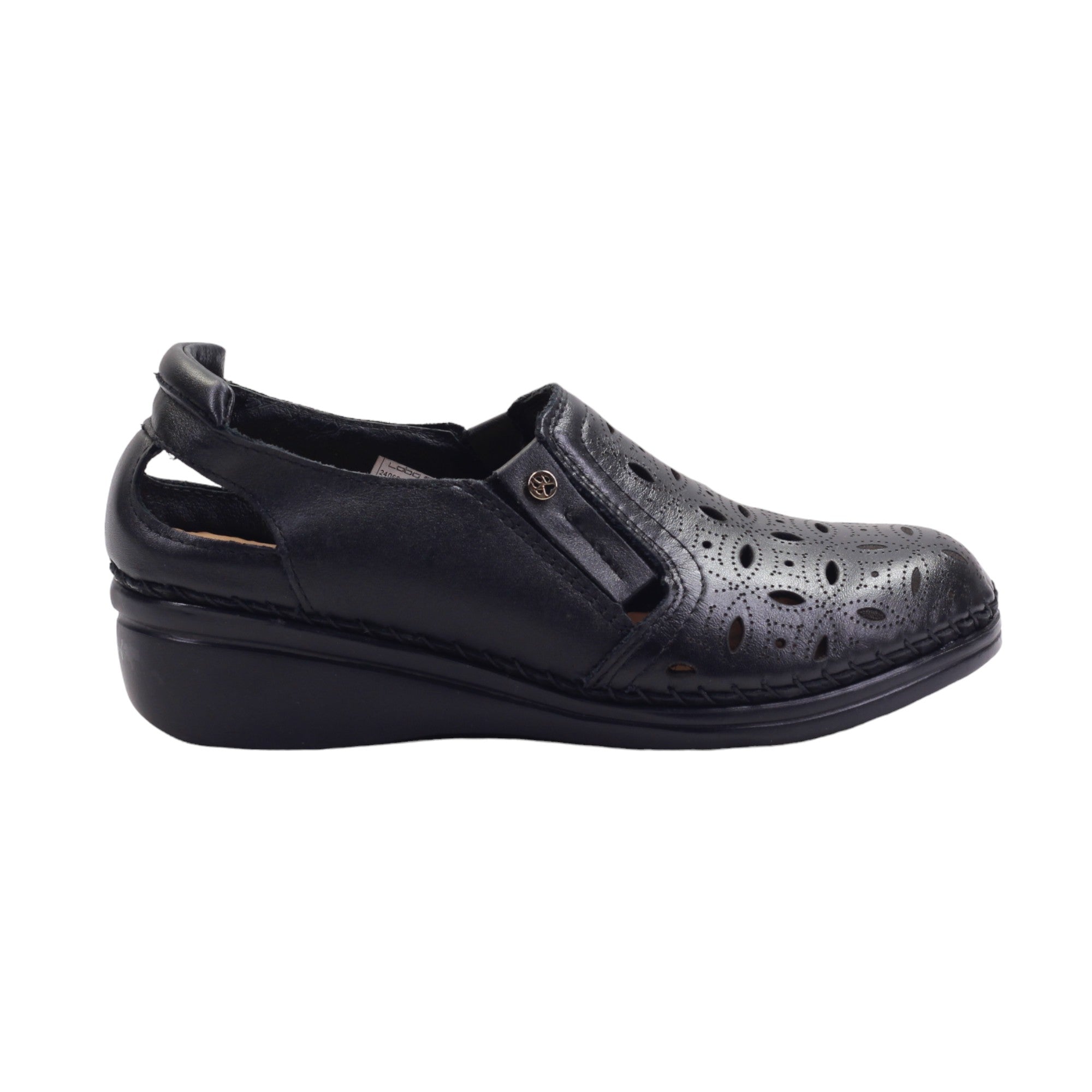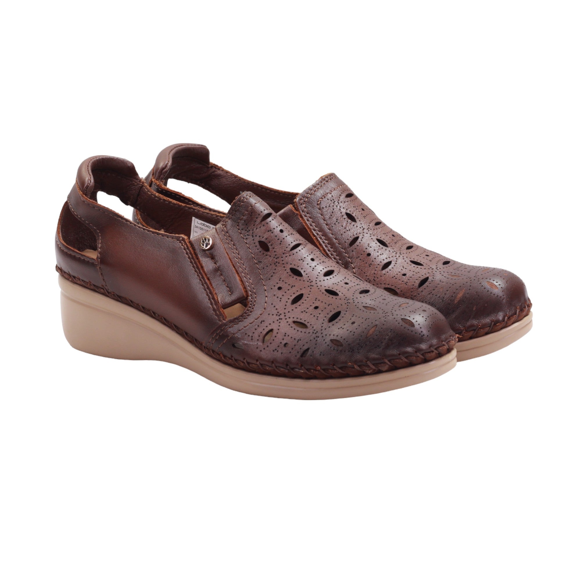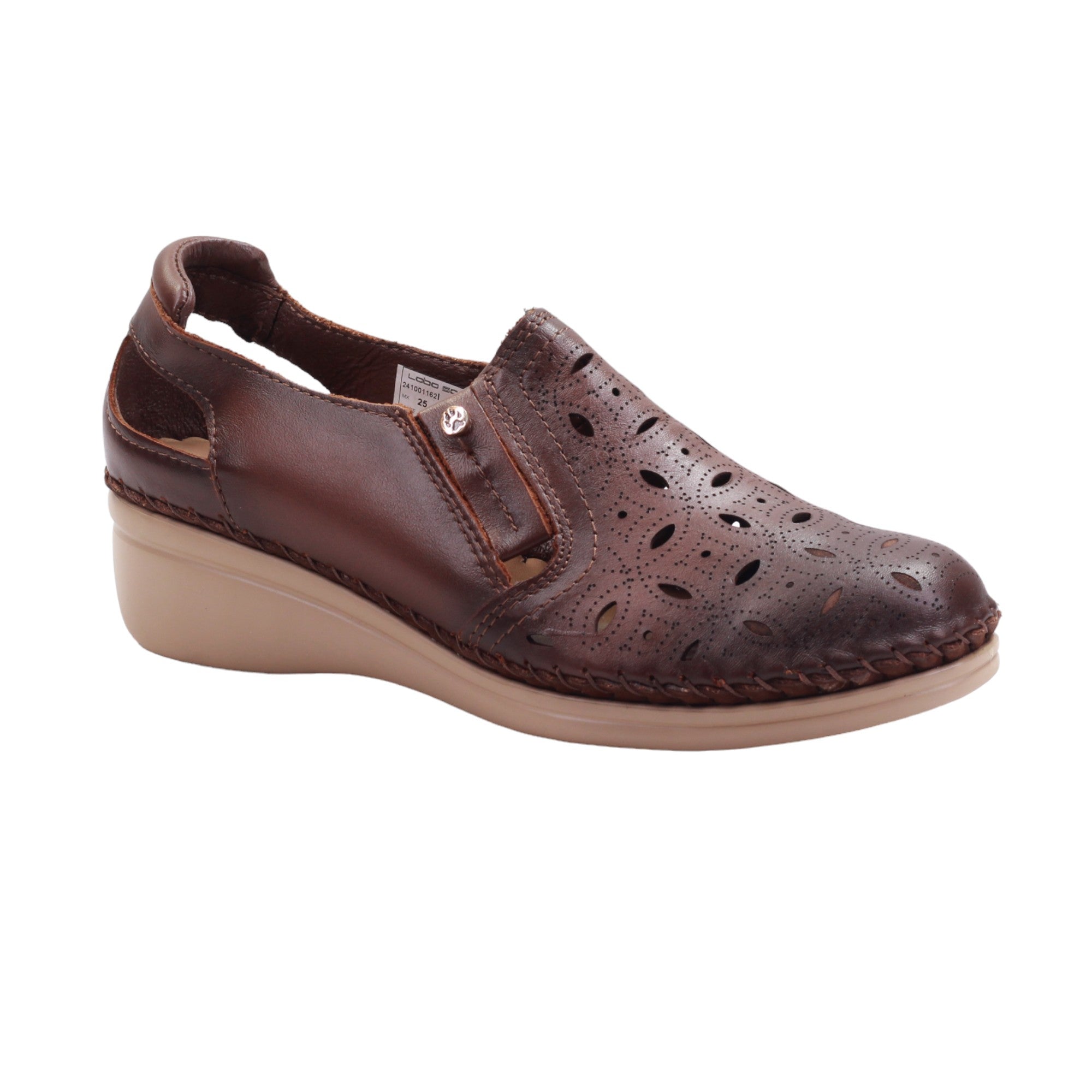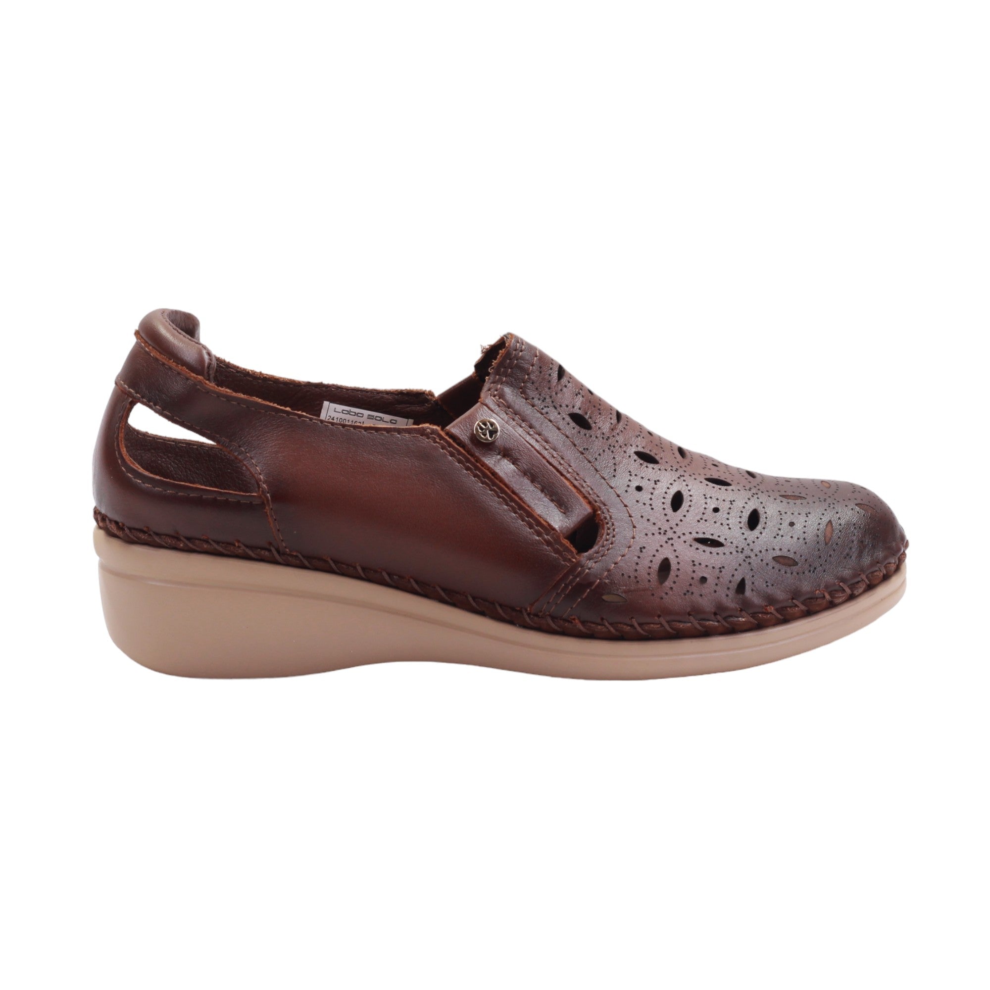 Calzado para dama marca Lobo Solo en colores Caoba y negro. Es un modelo de confort. Terminado de piel suave 100% natural, tejido a mano por artesanos mexicanos, con suela extra ligera. Su plataforma de 4.00 cm te dará el descanso y confort que tus pies necesitan.
