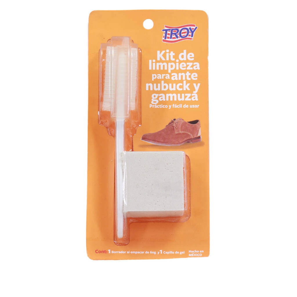 Kit de limpieza marca Troy. Este kit es ideal para mantener tus zapatos limpios y con una apariencia natural. Contiene un cepillo útil para eliminar la mugre superficial fácilmente, y un borrador que ayuda a quitar manchas.