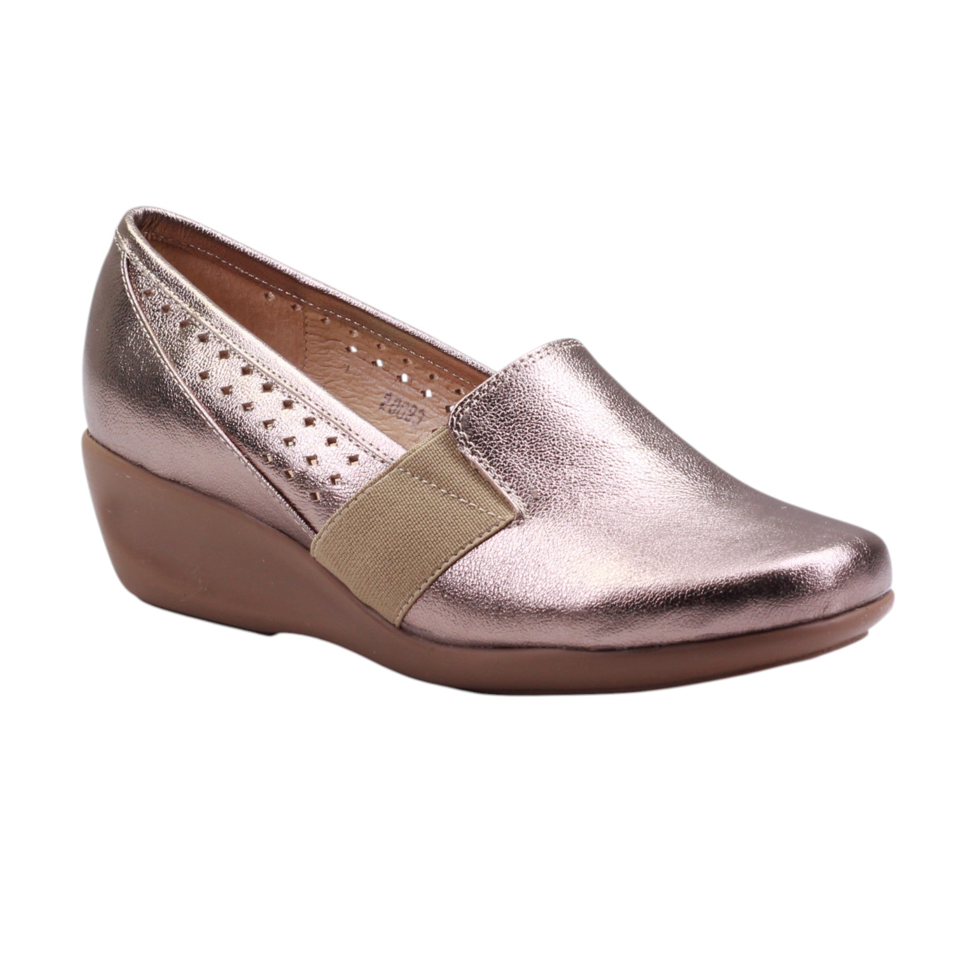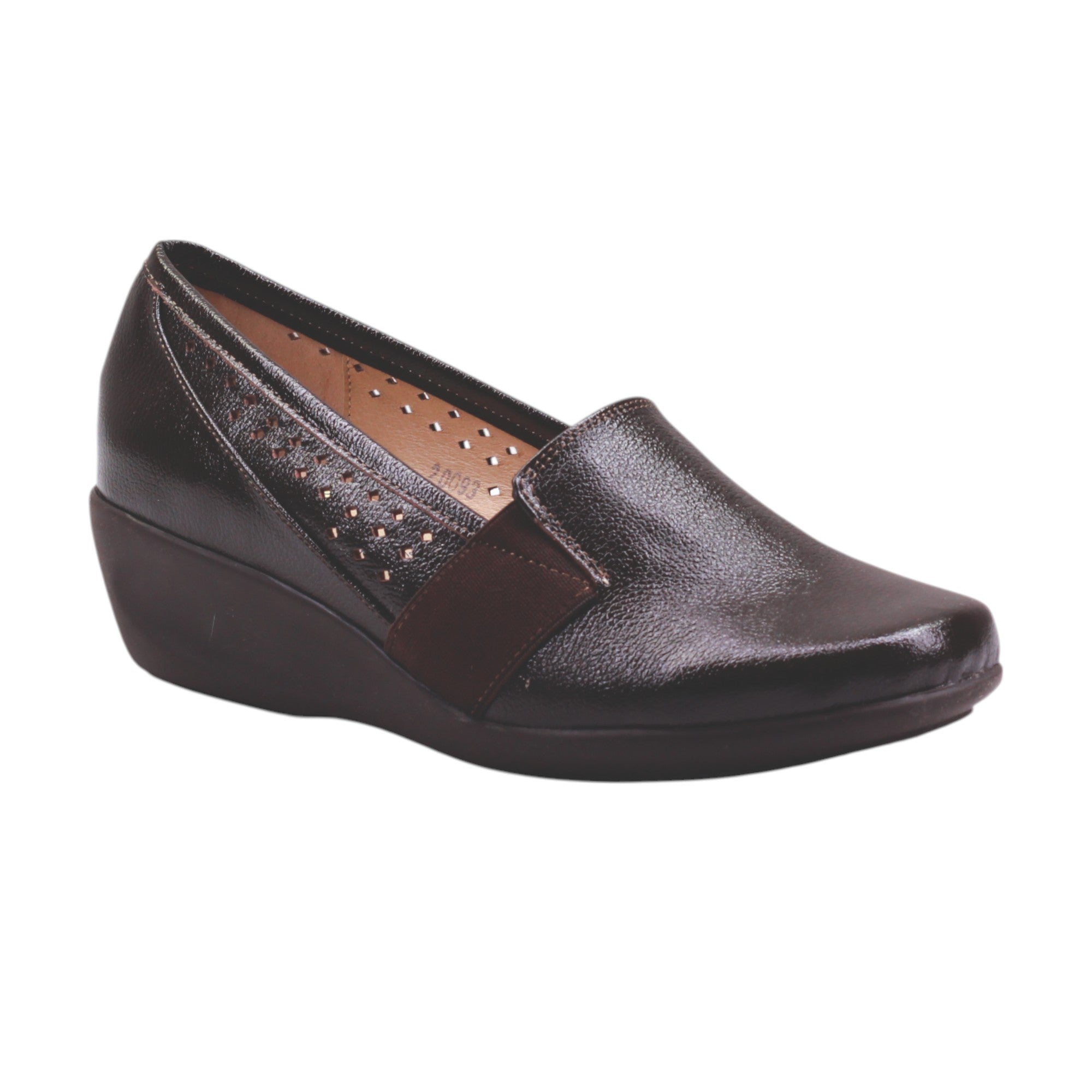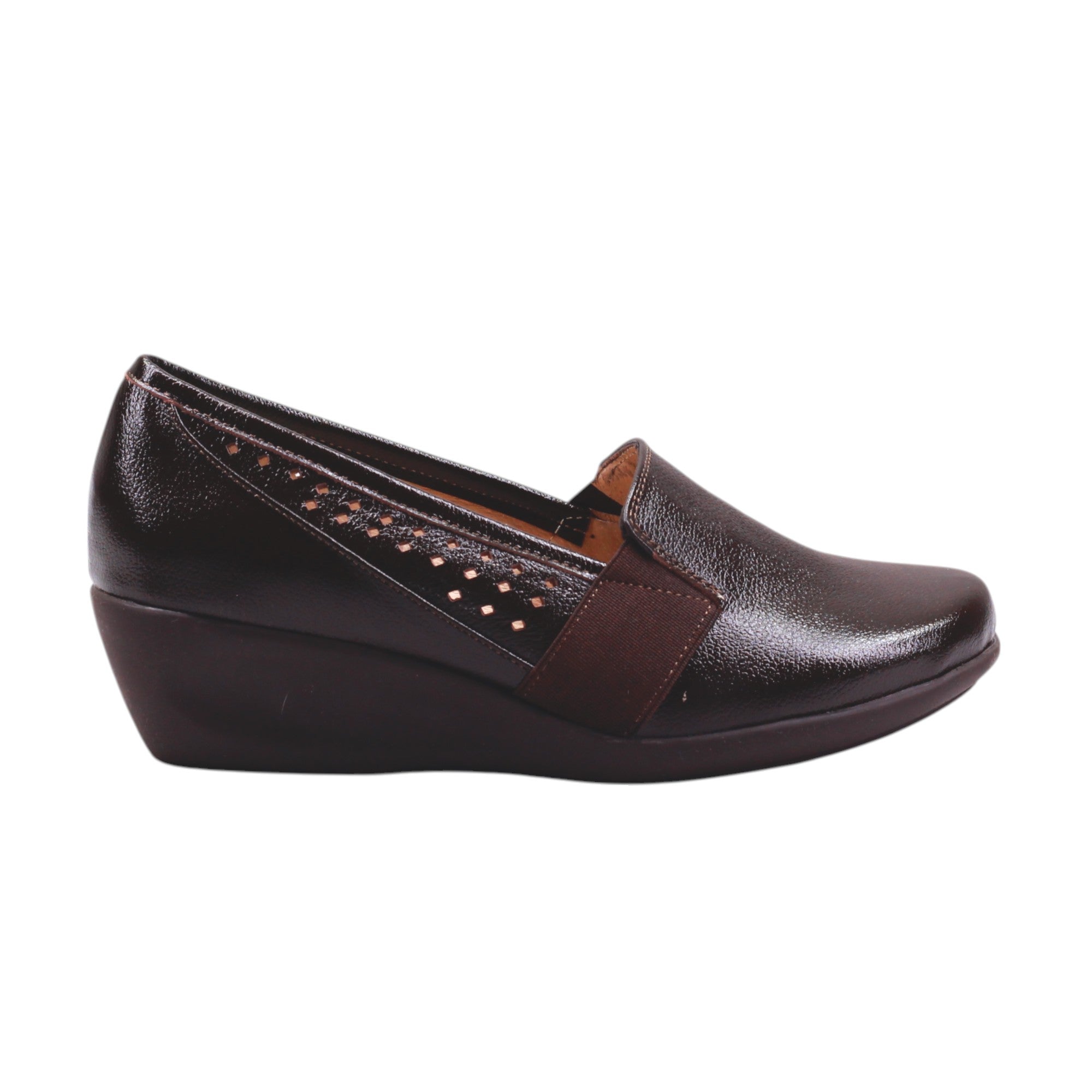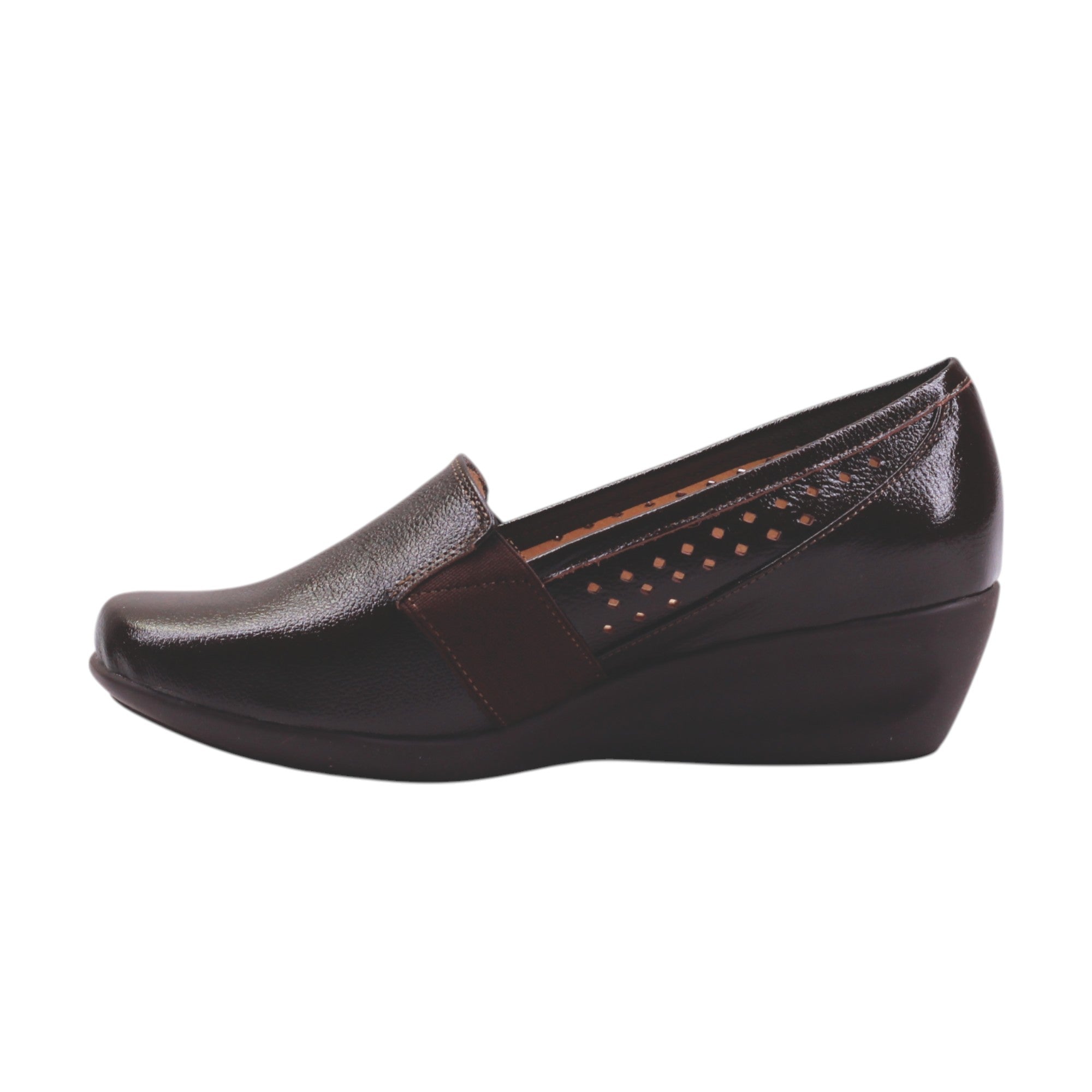 Destaca por su elástico lateral que facilita el ajuste, y por las perforaciones decorativas en los costados internos, que añaden un toque de estilo discreto mientras permiten mejor ventilación. El acabado brillante del corte le da un aspecto sofisticado, ideal tanto para el trabajo como para salidas casuales.
