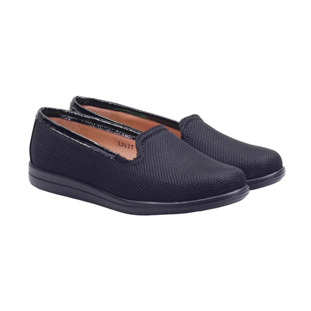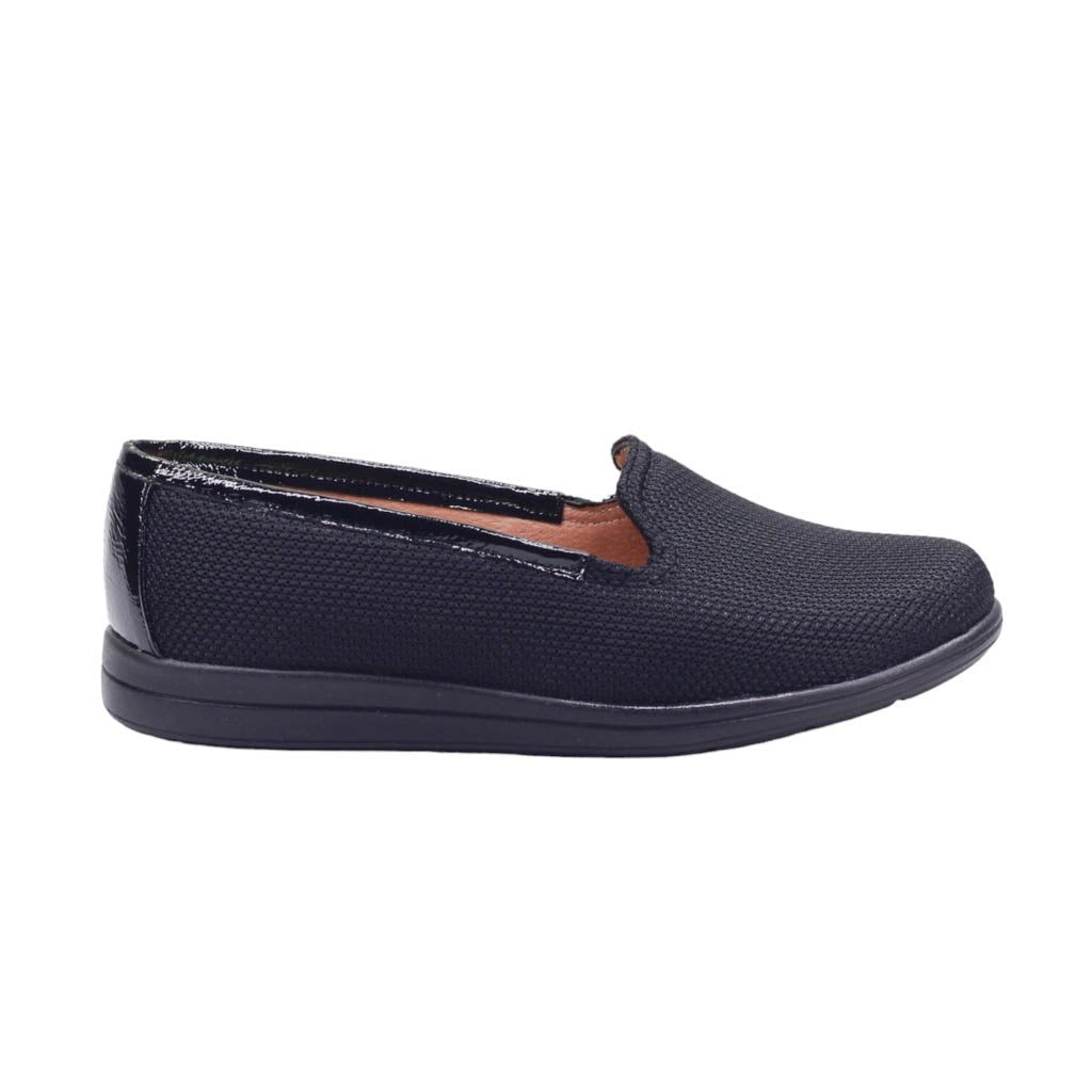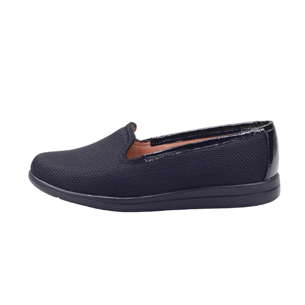 Calzado para dama marca Capricho en color negro. Nuestro zapato de textil cuenta con una suela de 2.5 cm de altura y una plantilla de confort que ofrece comodidad duradera. El acabado acharolado en la orilla del corte agrega un toque elegante a tu estilo. Diseñado para una apariencia sofisticada y un ajuste cómodo.