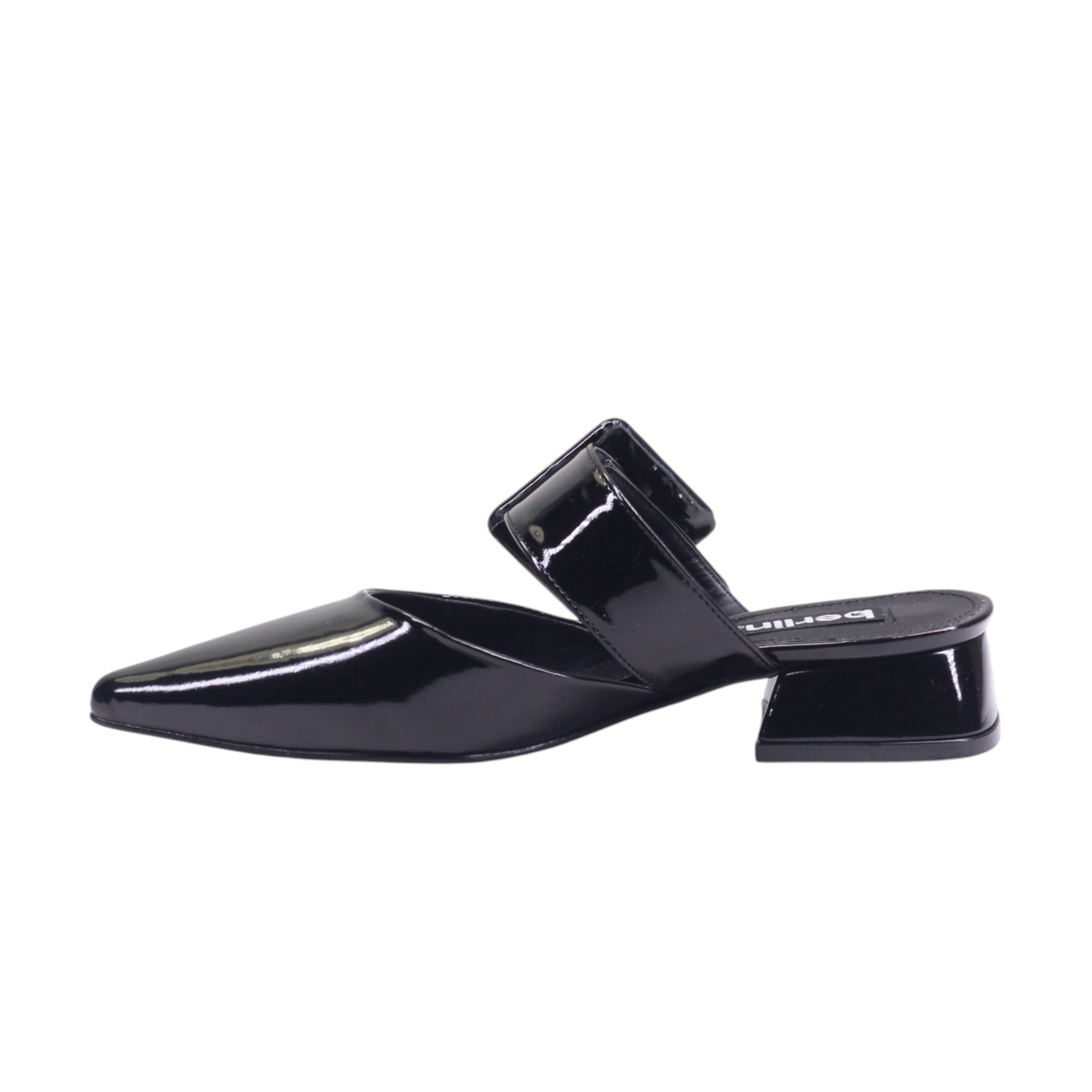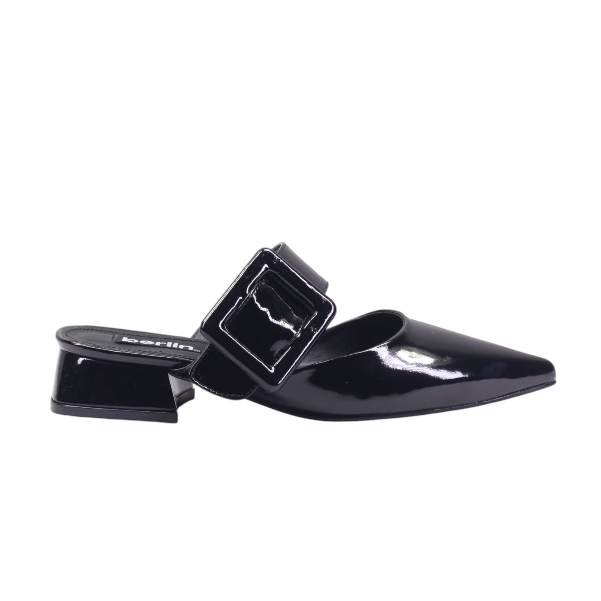 Mule para dama marca Berlin en color negro. Diseño contemporáneo con presencia pulida. Este mule está confeccionado en materiales sintéticos tanto en el corte como en el forro, con un acabado tipo charol que aporta brillo intenso y una textura lisa que refleja la luz con elegancia. La silueta destalonada permite un calce rápido y estiliza el pie con su forma de punta afinada.
