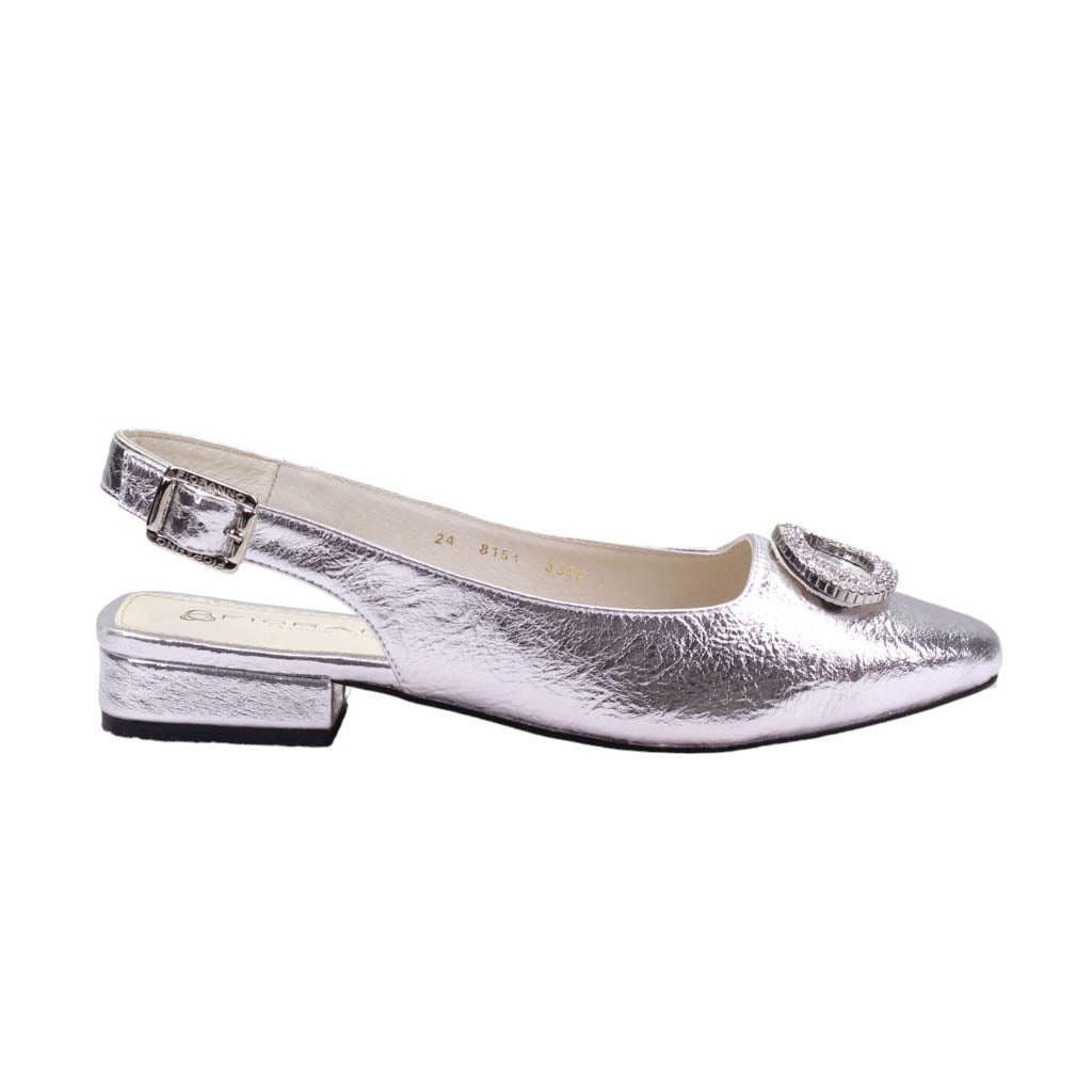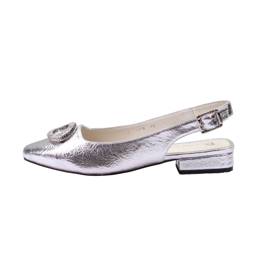 Mule para dama marca Fioranno en color plata. Este elegante modelo cuenta con un adorno cubierto en pedrería que le da un toque de glamour. Además, su plantilla de confort brinda una sensación de comodidad al caminar. Su tacón bajo permite una mayor estabilidad y su ajuste trasero con hebilla asegura una sujeción perfecta.