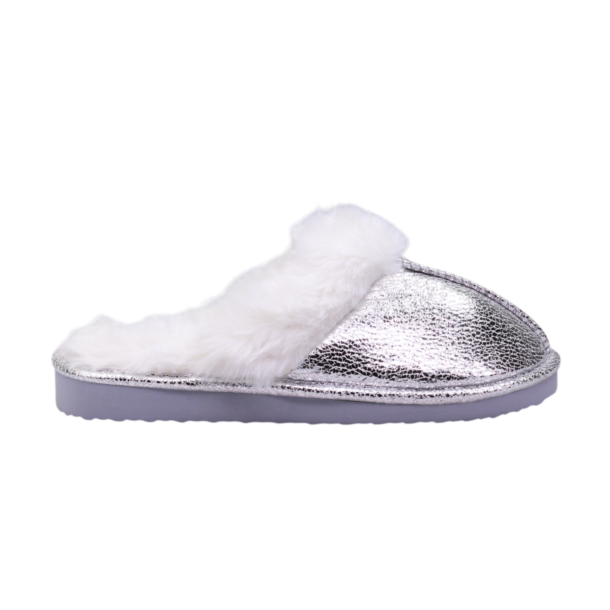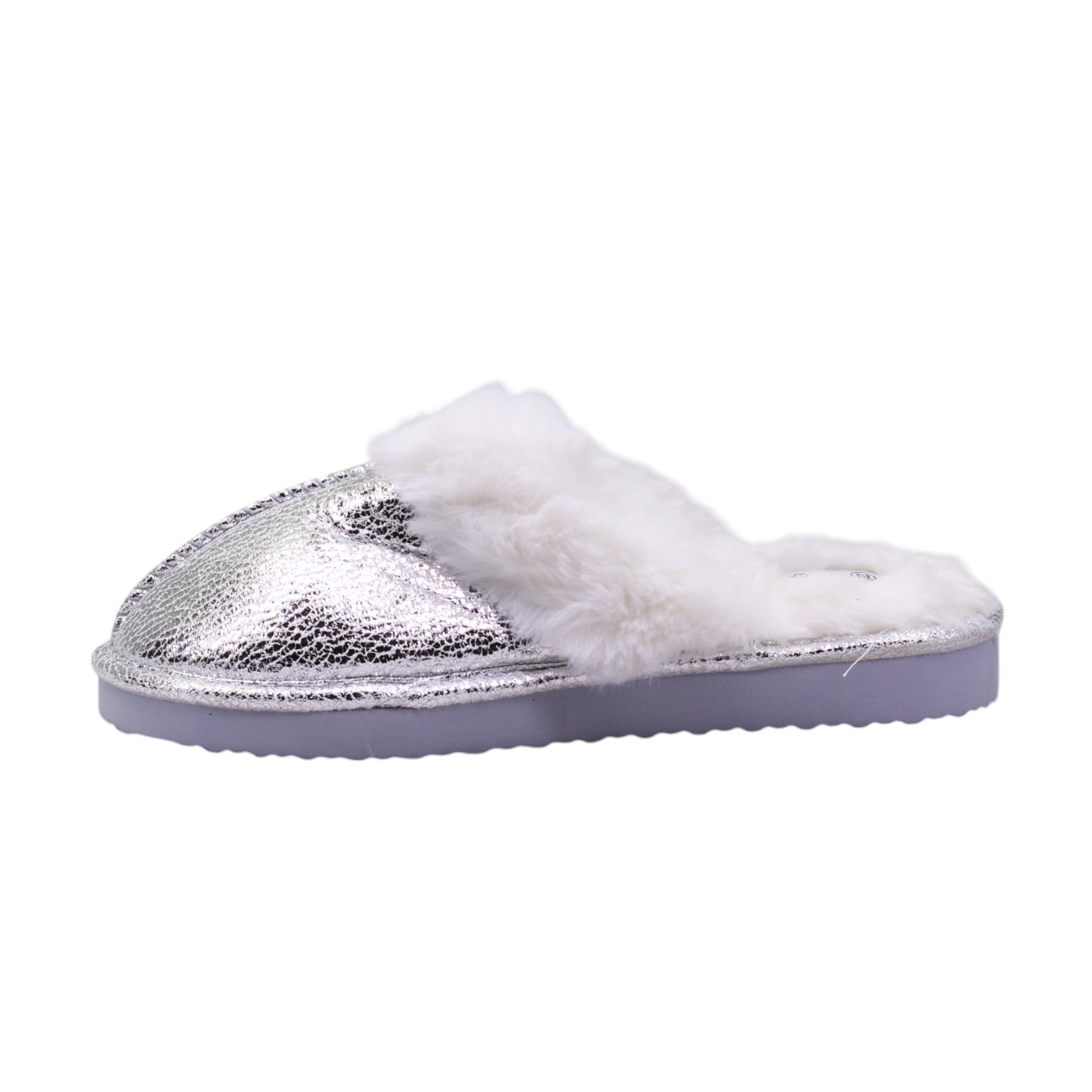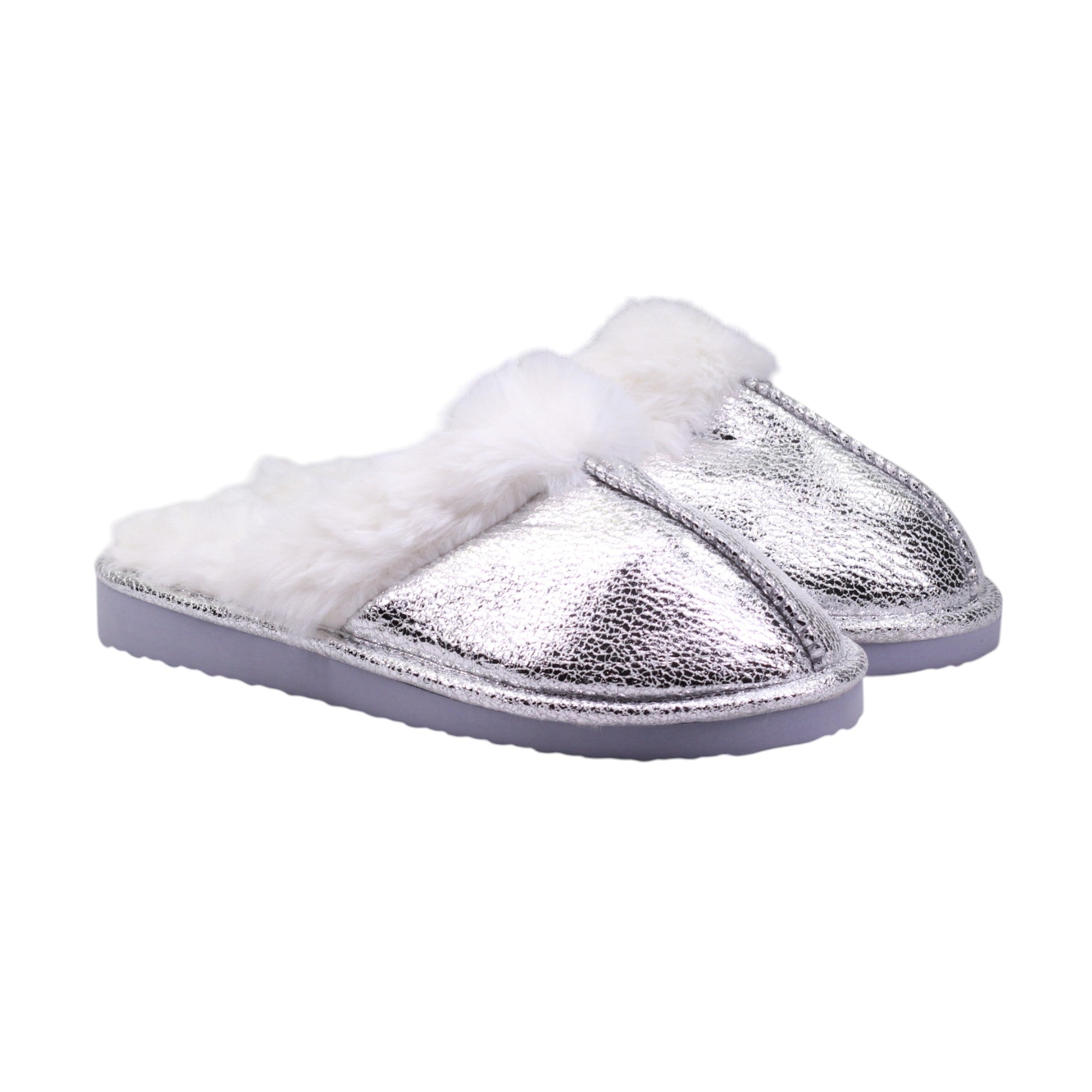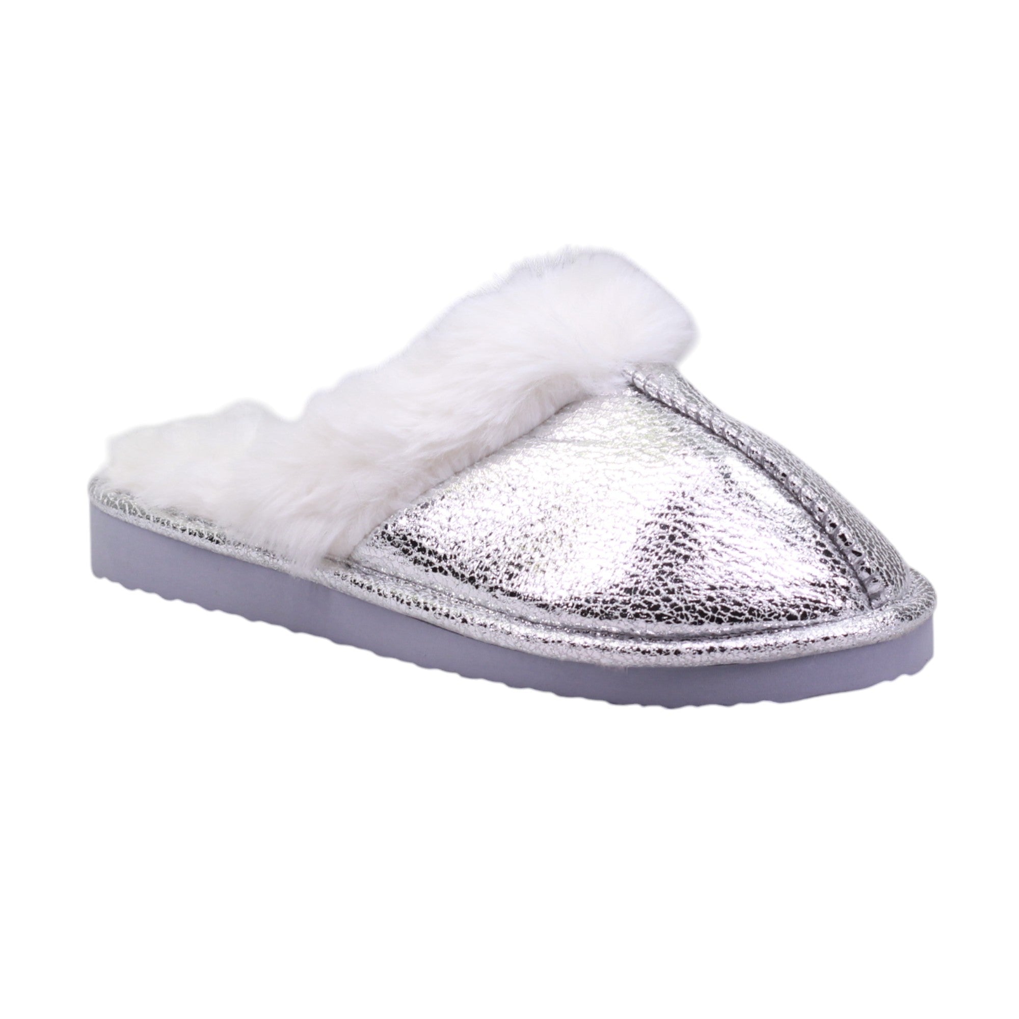 Pantufla para dama marca Furor en color plata. Estas pantuflas ofrecen una combinación perfecta de confort y estilo. Ideales para relajarte en casa, su diseño con peluche interno mantiene tus pies abrigados, mientras que la suela ligera proporciona una sensación de bienestar. El corte con tono metalizado añade un toque de elegancia, haciendo de estas pantuflas un accesorio imprescindible para tus momentos de descanso.