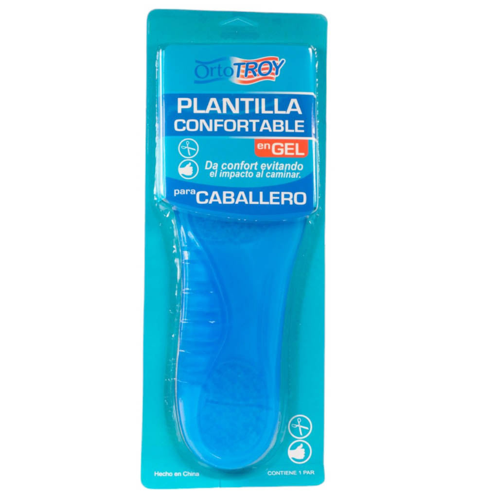 Plantilla de gel para caballero marca Troy. Esta plantilla es recortable y está diseñada para brindar mayor confort y absorber el impacto al caminar. Tiene ajuste al calzado, comodidad para el talón y reduce el mal olor. Ideal para cualquier zapato cerrado