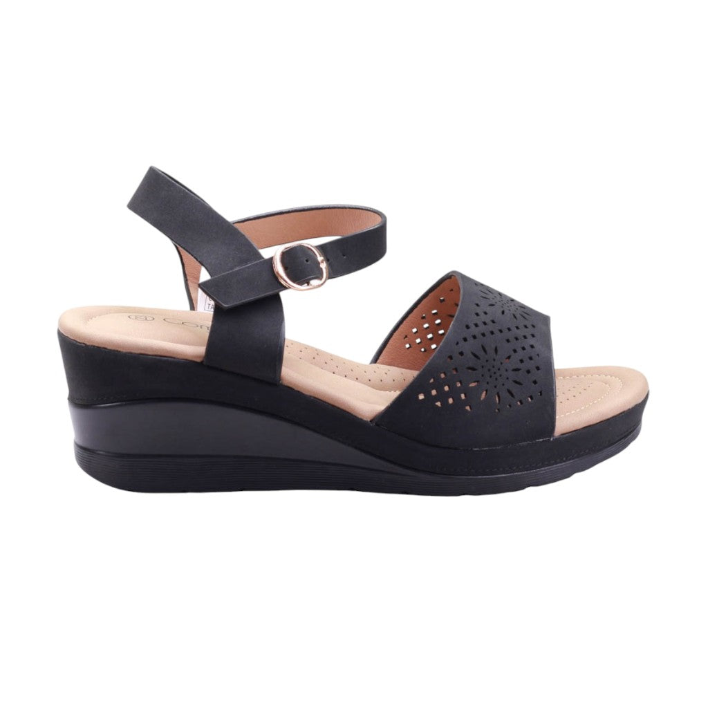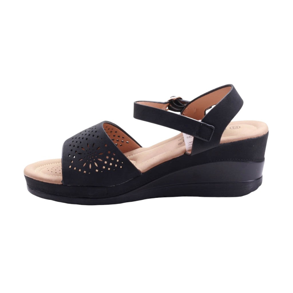 Plataforma para dama marca Furor en color negro. Este modelo cuenta con una altura de 6 centímetros y un ajuste al tobillo que brinda mayor soporte y comodidad. Además, su plantilla acojinada y su corte con perforaciones ofrecen una sensación de frescura y transpirabilidad para tus pies.