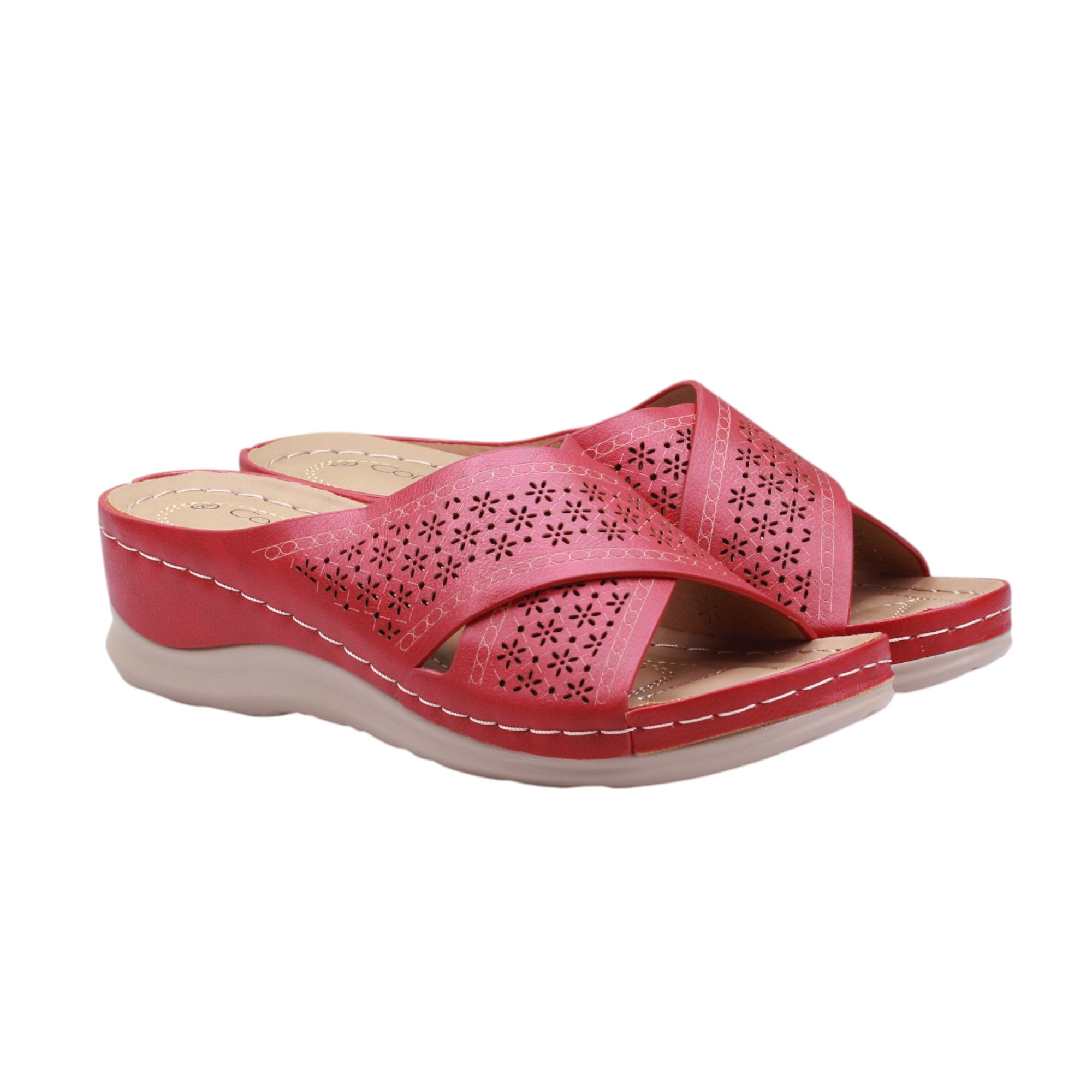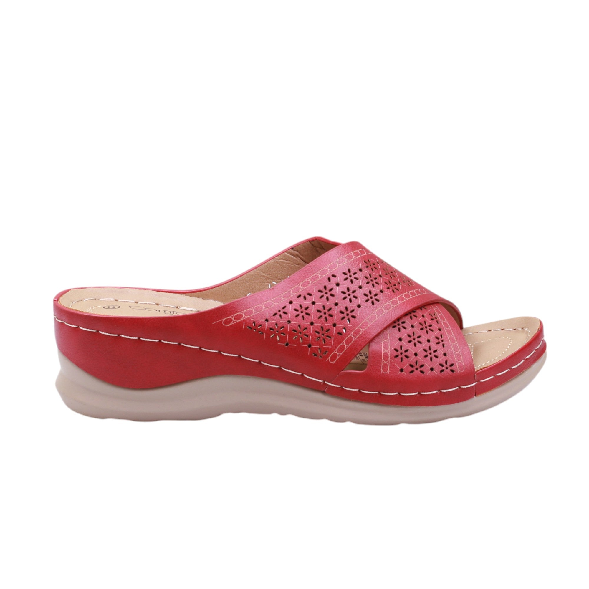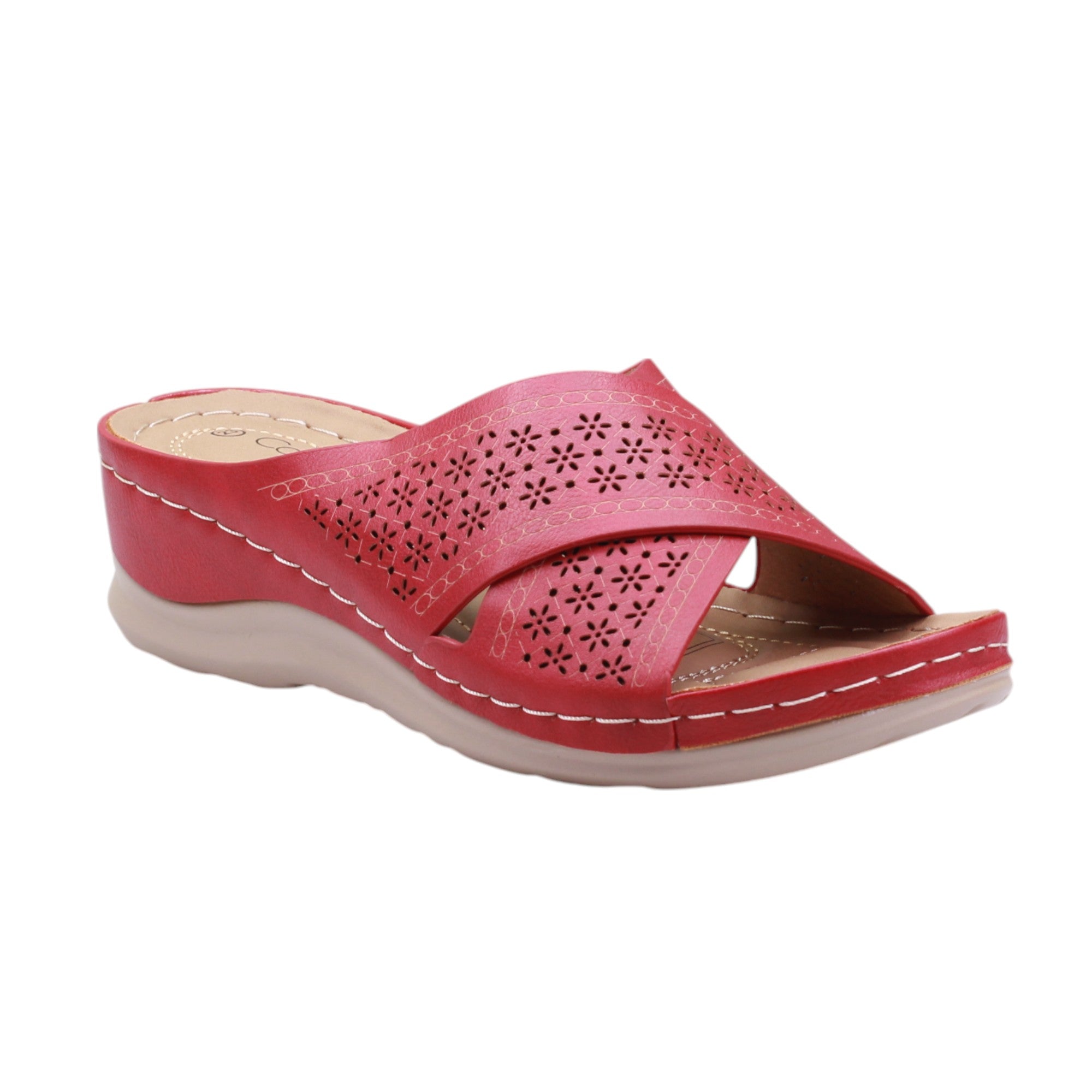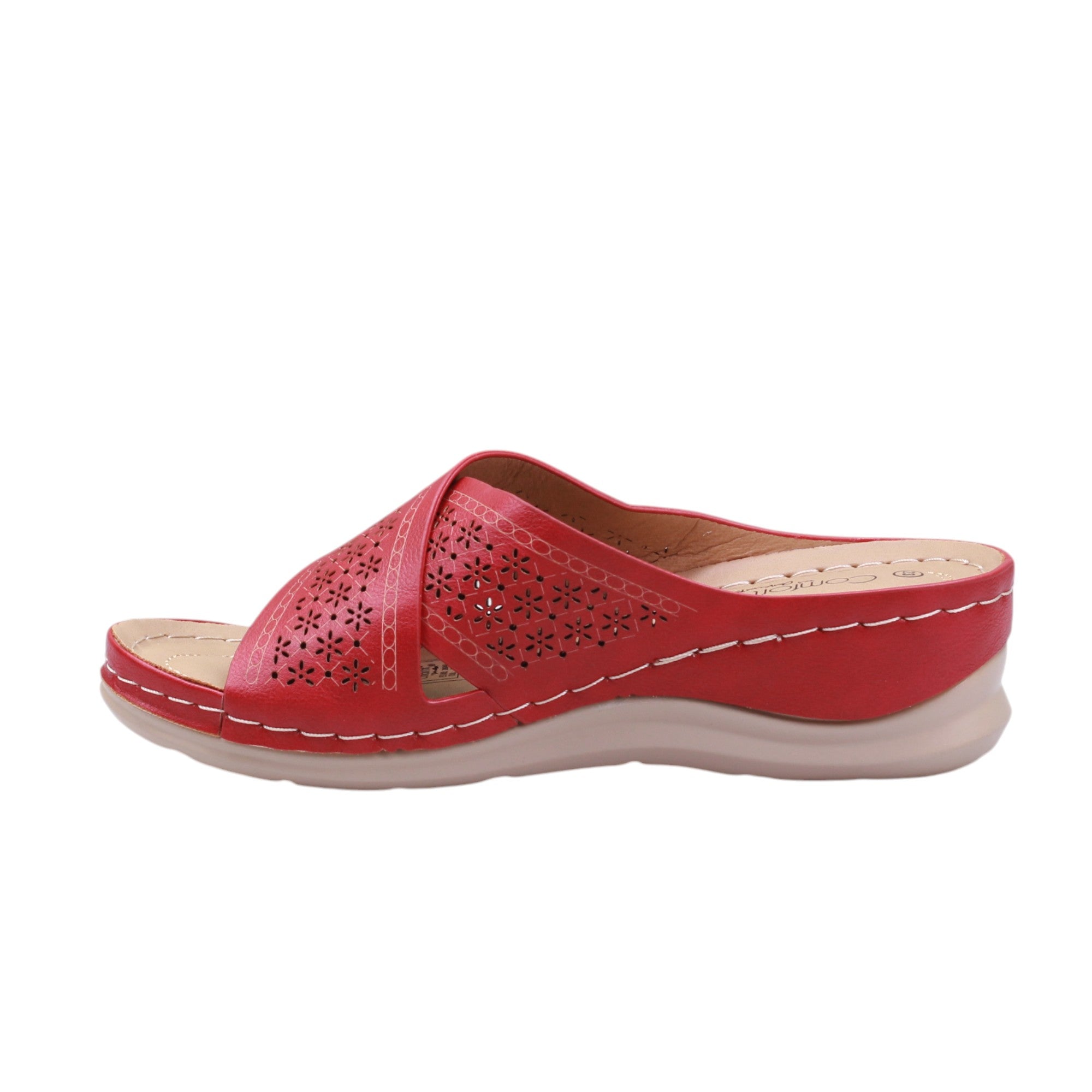 Plataforma para dama marca Furor en color rojo. Tus pies se sentirán cómodos y elegantes con nuestro modelo destalonado con tiras anchas en cruce. Con una plantilla cómoda y altura de 5.00 centímetros, podrás lucir a la moda sin sacrificar la comodidad. ¡Encuentra el equilibrio perfecto con este diseño!