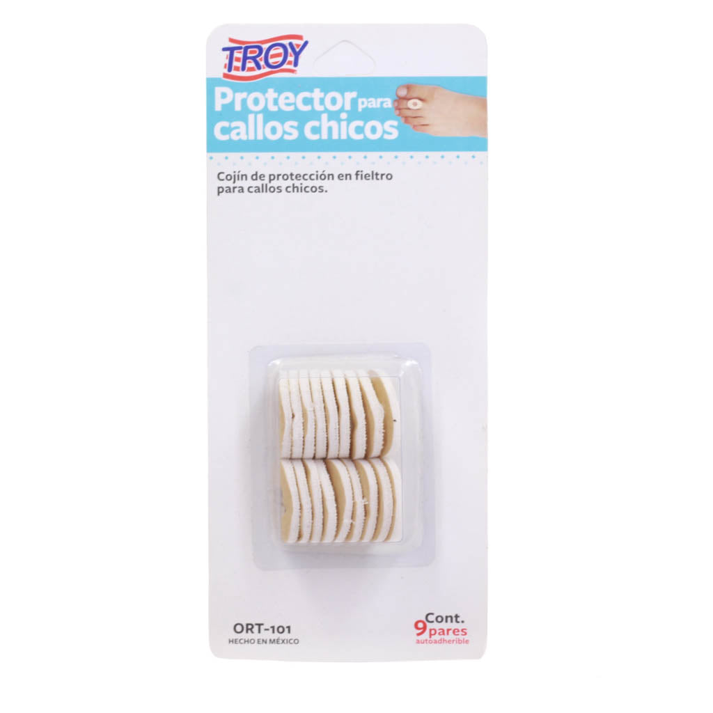 Protector para callos chicos marca Troy. Es un cojín de fieltro diseñado para brindar comodidad a los pies cuando se tiene un callo que molesta al caminar.