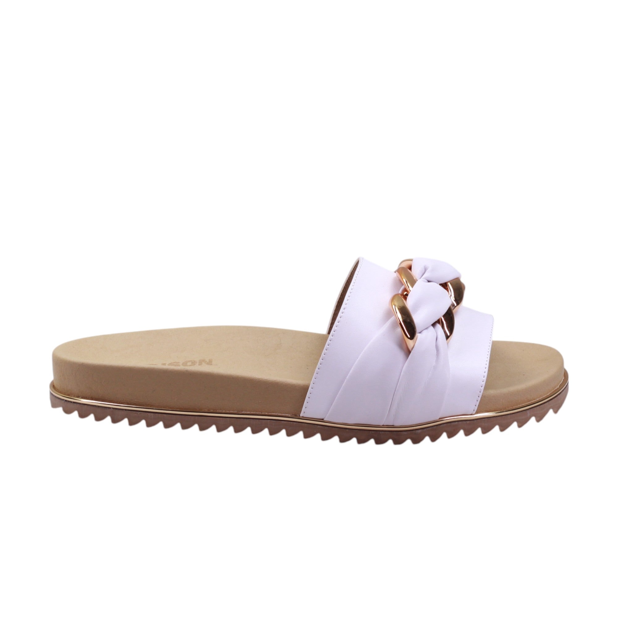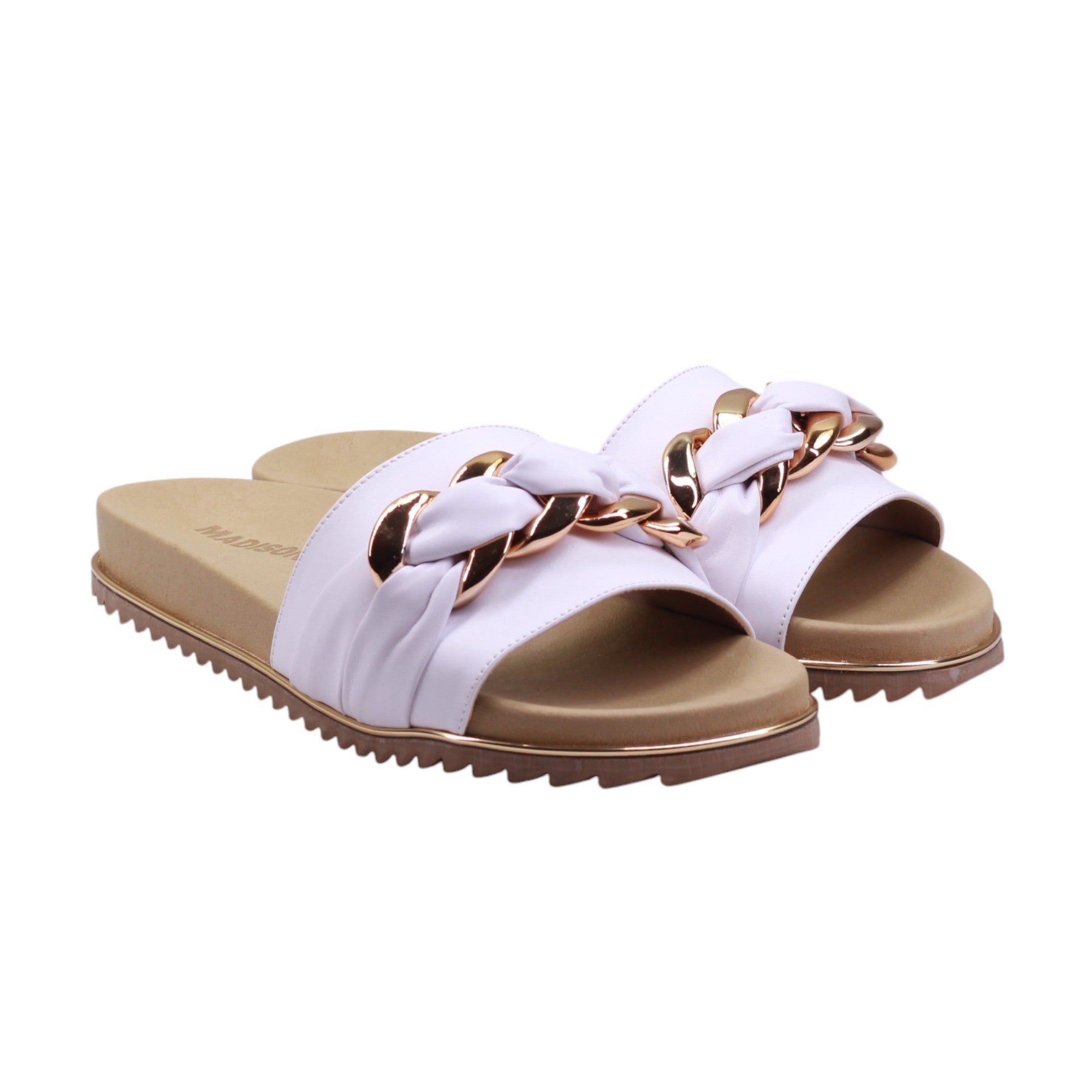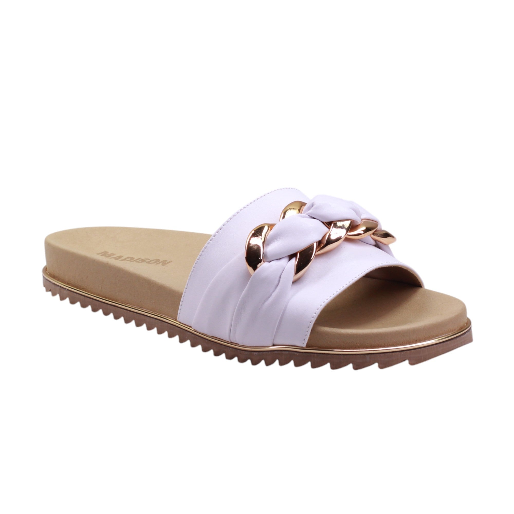 Sandalia para dama marca Madison en colores blanco y camel. Este modelo casual cuenta con un elegante eslabón dorado adornando el corte, que le da un toque de sofisticación. Además, su suela ergonómica ofrece comodidad durante todo el día. Disfruta de estilo y confort con este zapato único.