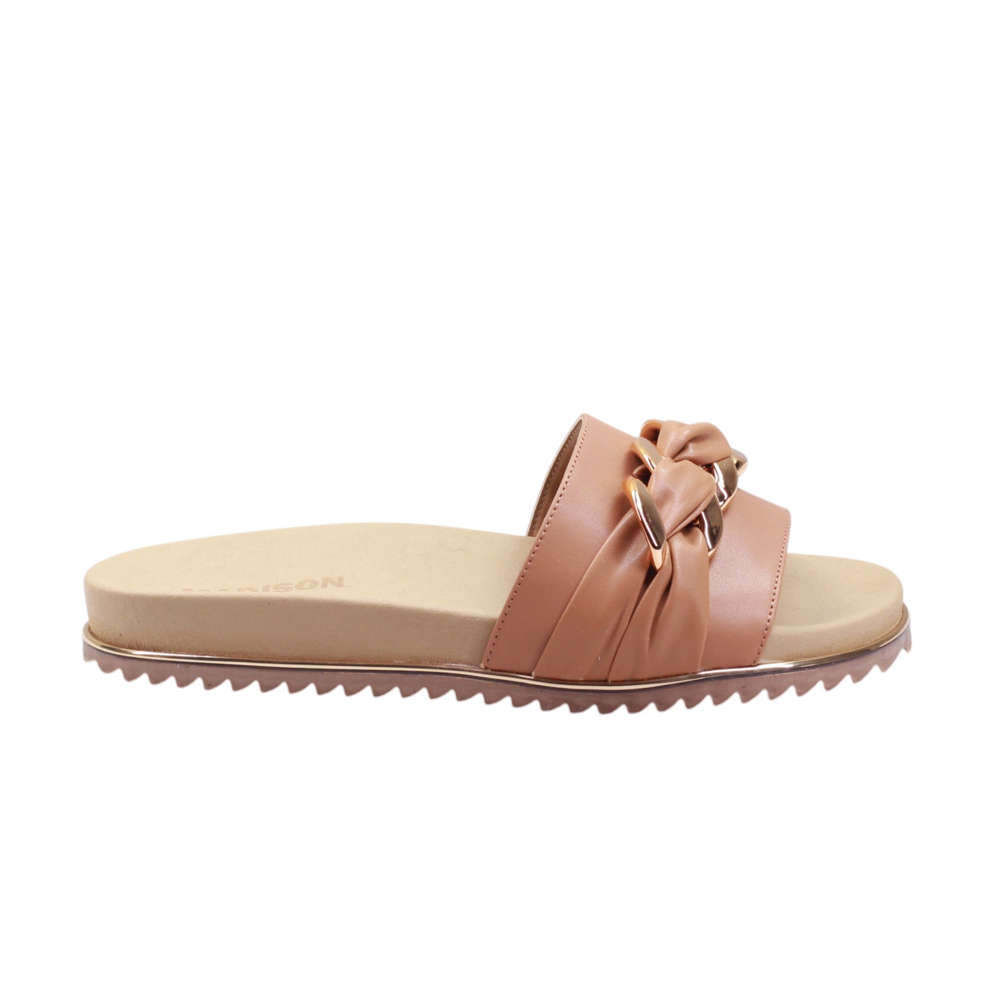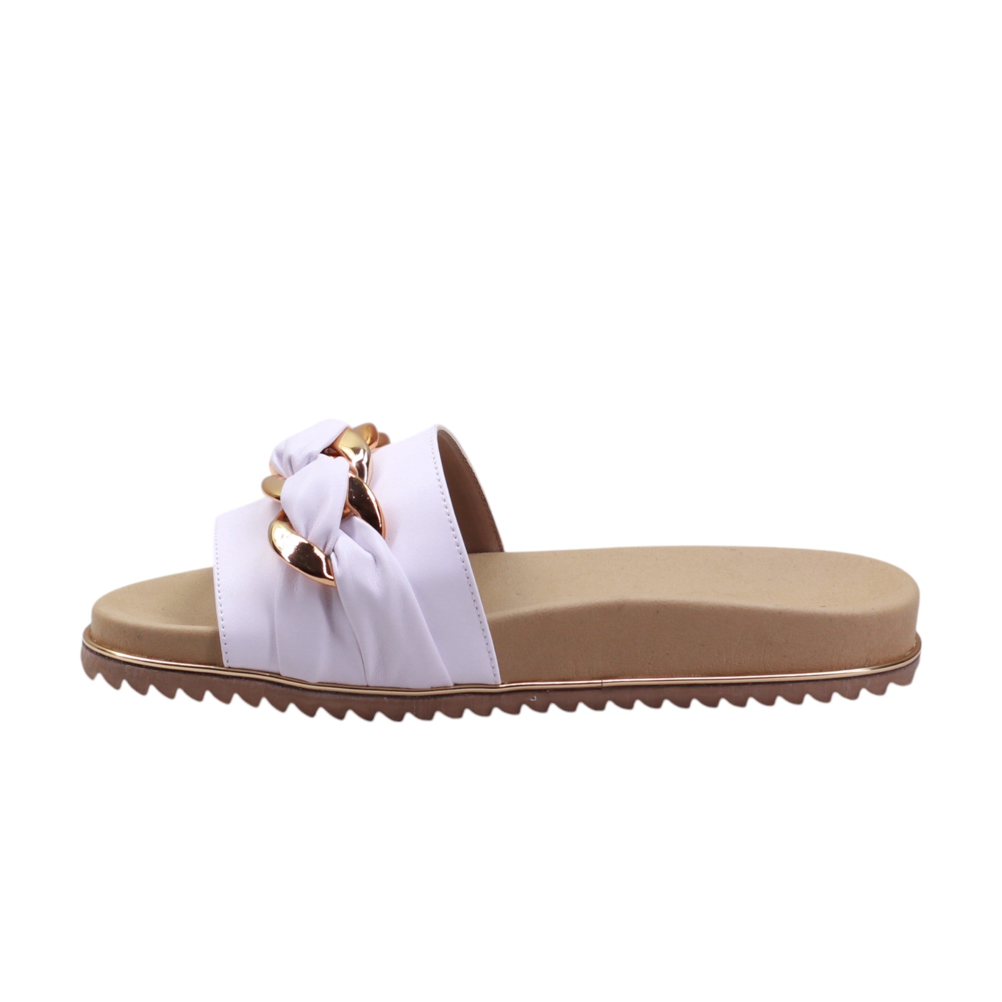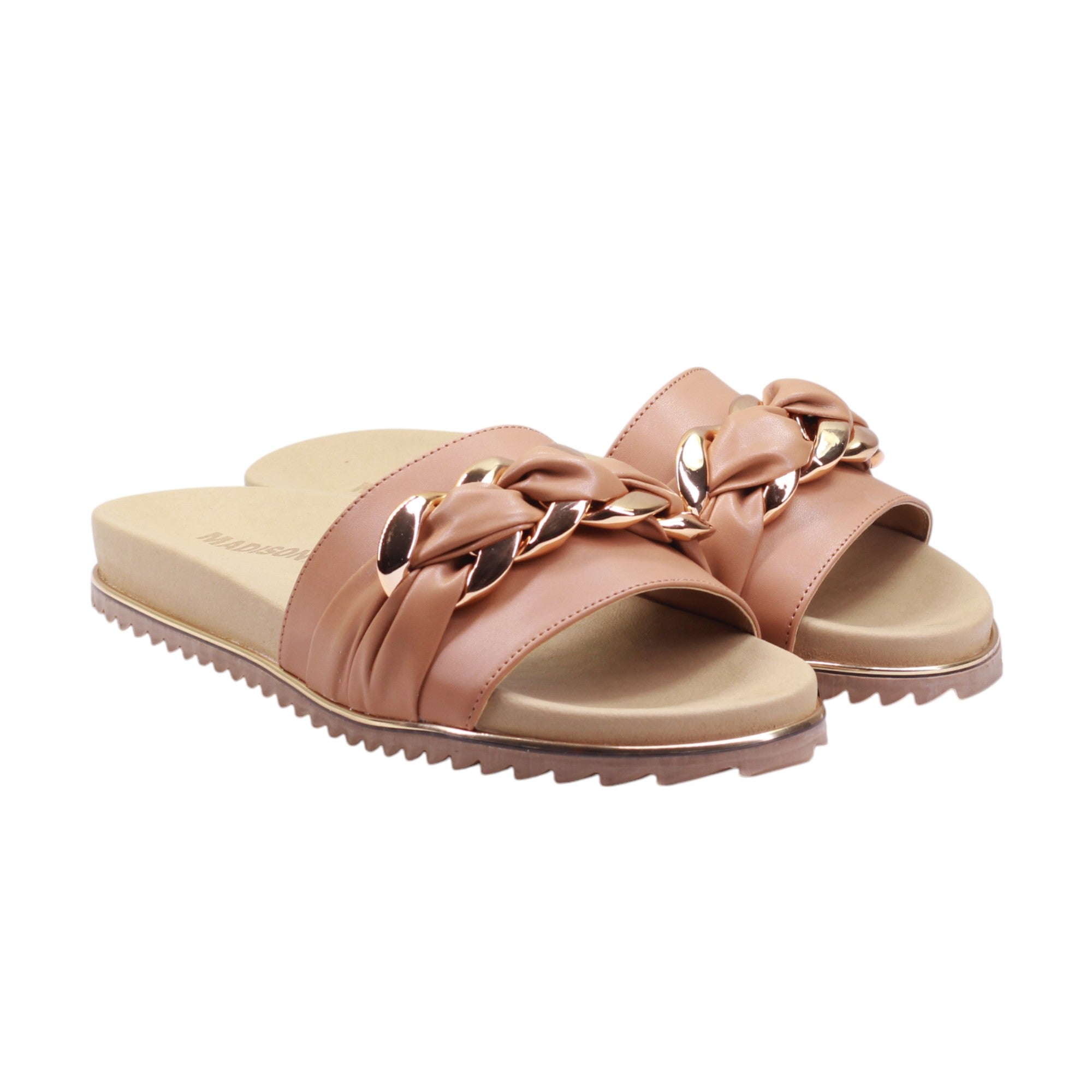 Sandalia para dama marca Madison en colores blanco y camel. Este modelo casual cuenta con un elegante eslabón dorado adornando el corte, que le da un toque de sofisticación. Además, su suela ergonómica ofrece comodidad durante todo el día. Disfruta de estilo y confort con este zapato único.