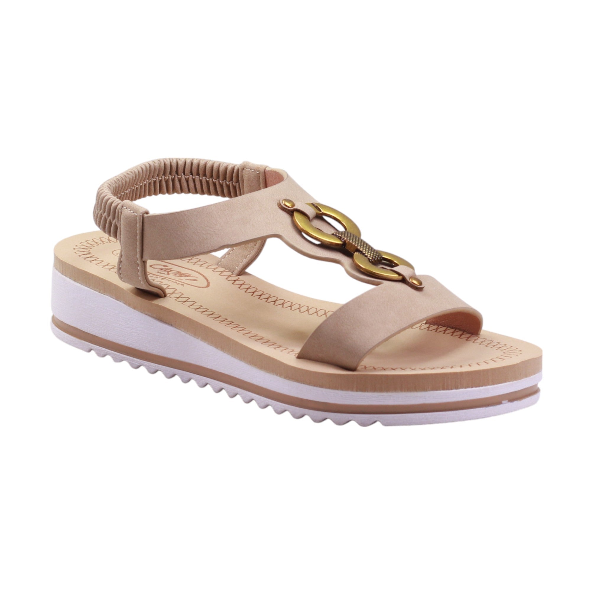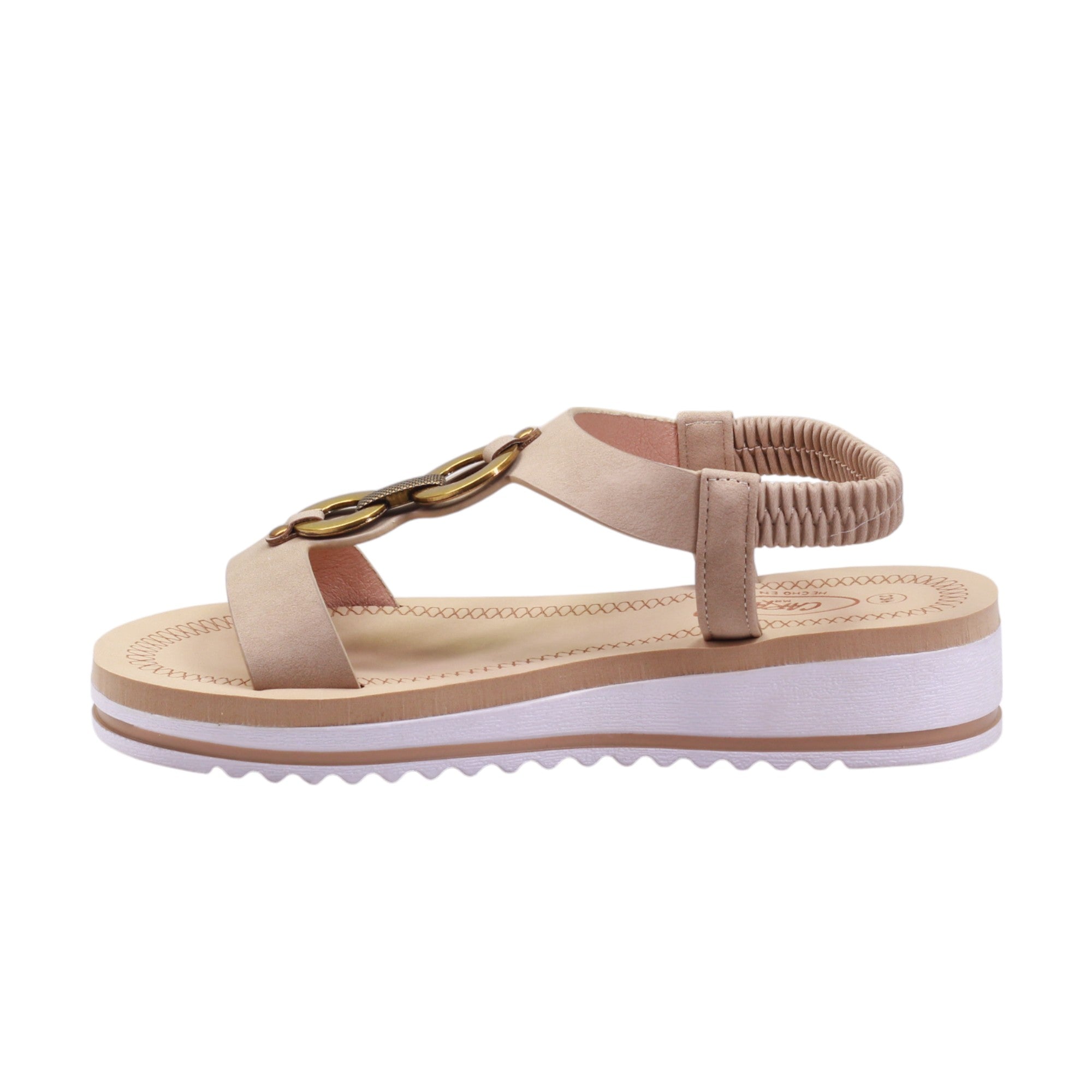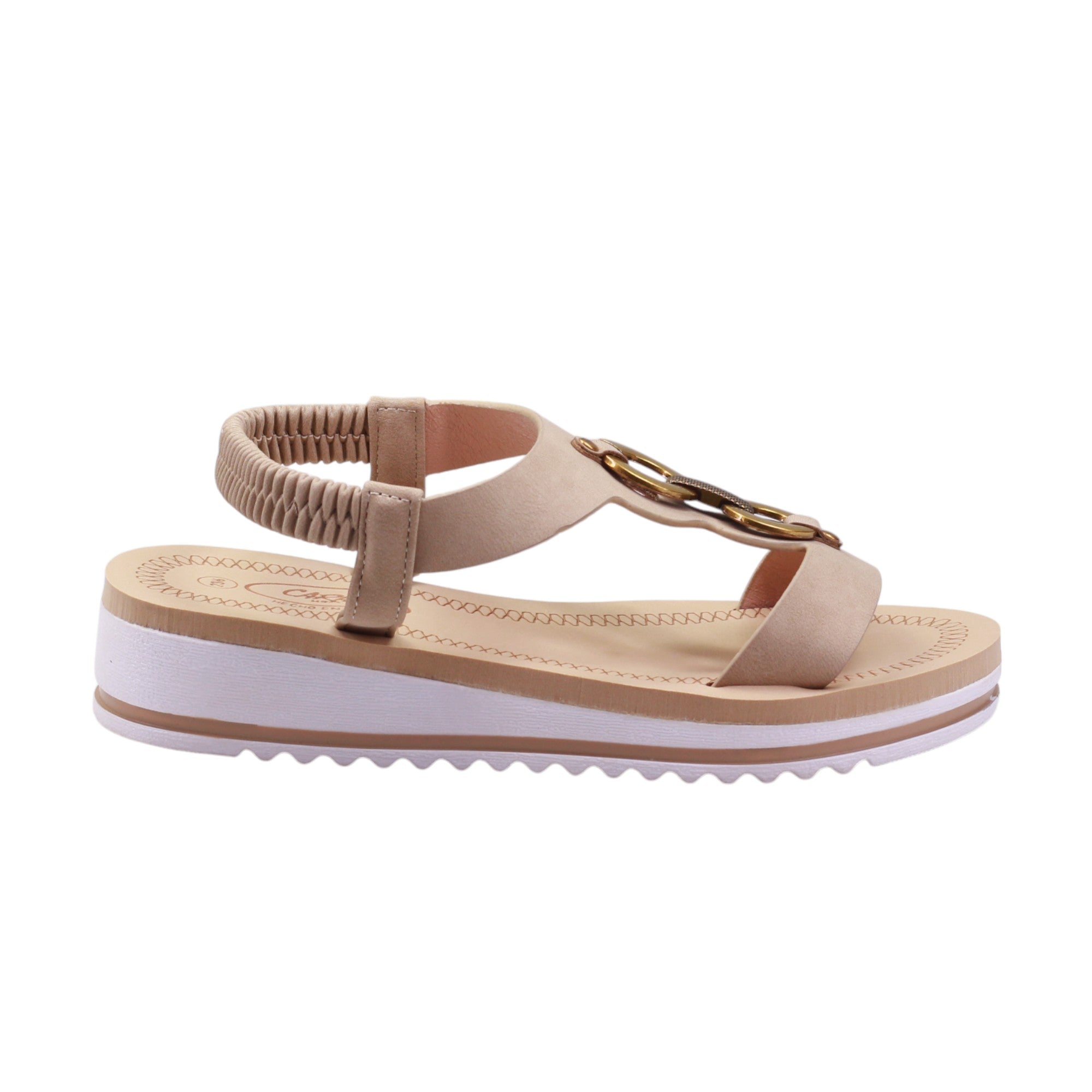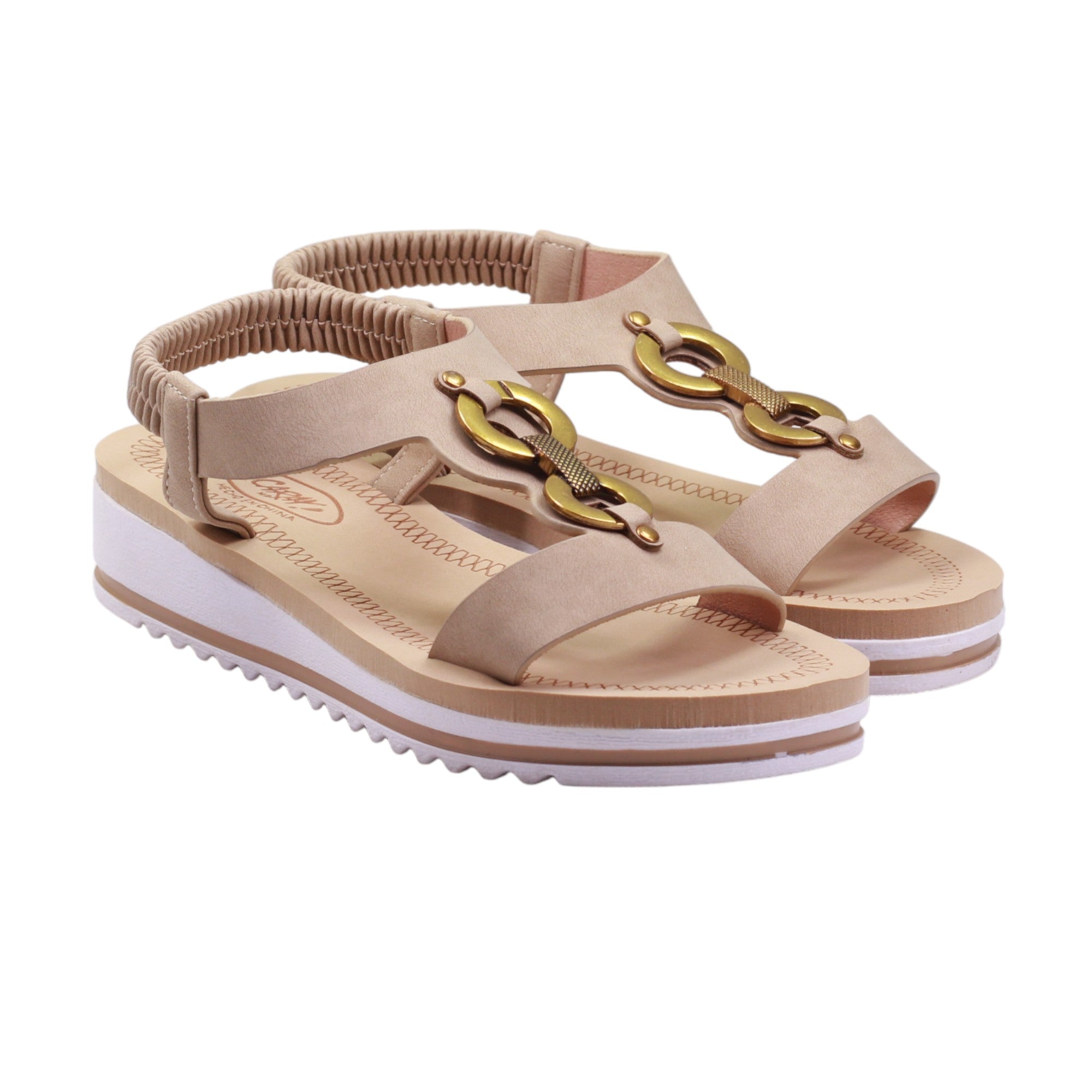 Sandalia para dama marca Caray en color taupe. Descubre el glamour y la comodidad con nuestro modelo de plataforma de 3.5 cm. Cuenta con corte con adorno metálico y tira trasera elástica ofrecen ajuste perfecto. ¡Haz una declaración de moda con estos zapatos únicos en su clase!