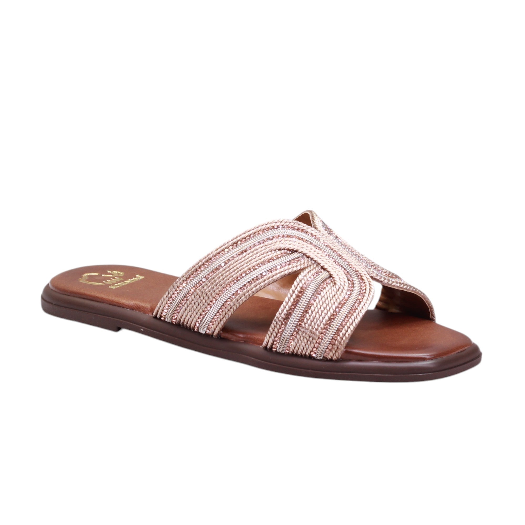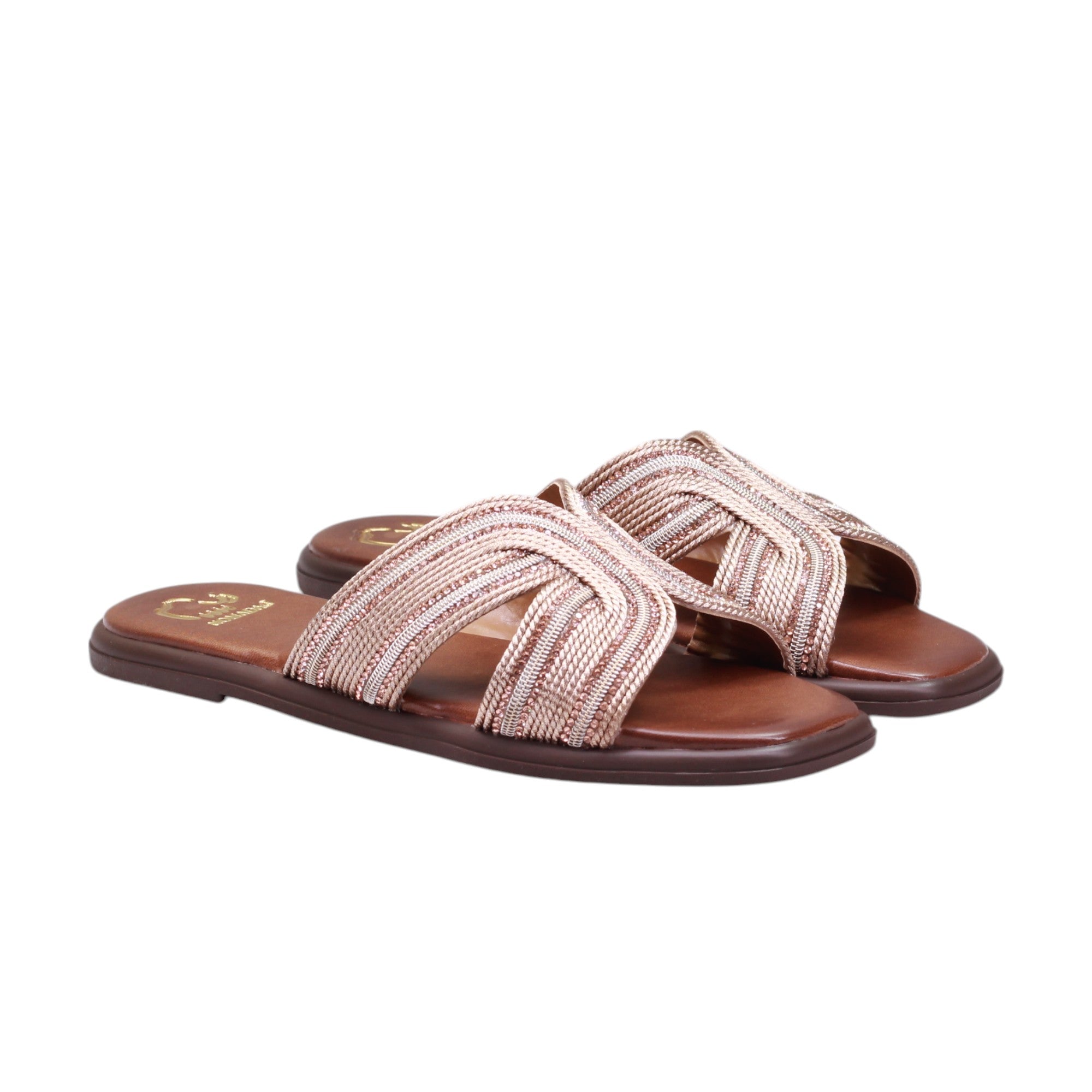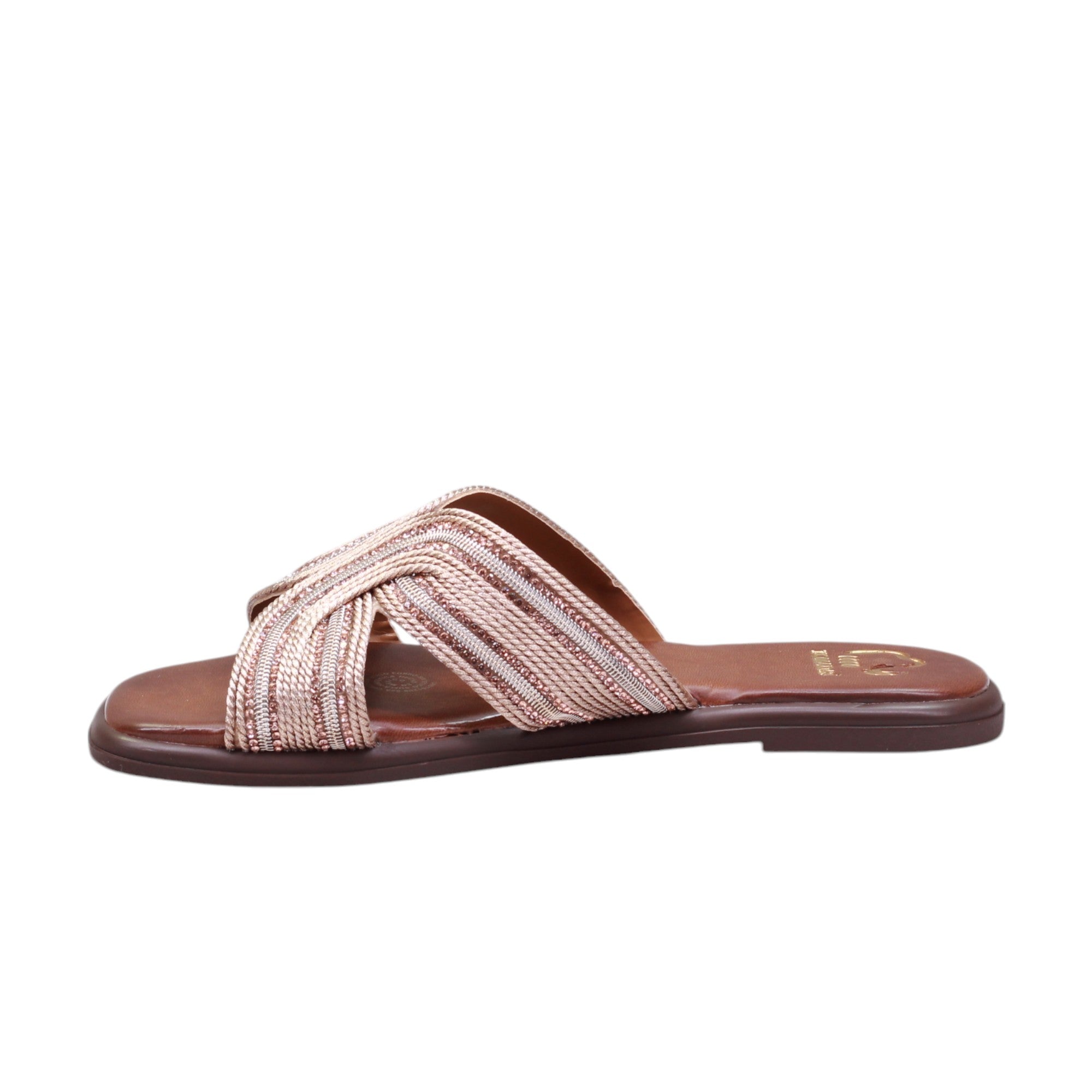 Sandalia para dama marca Nomadas en color bronce. Este modelo casual es ligero y está confeccionado con tejido y pedrería artificial en el corte. Perfecto para usar en casa o para salidas casuales, proporciona estilo y comodidad. ¡Una opción ideal para cualquier ocasión!