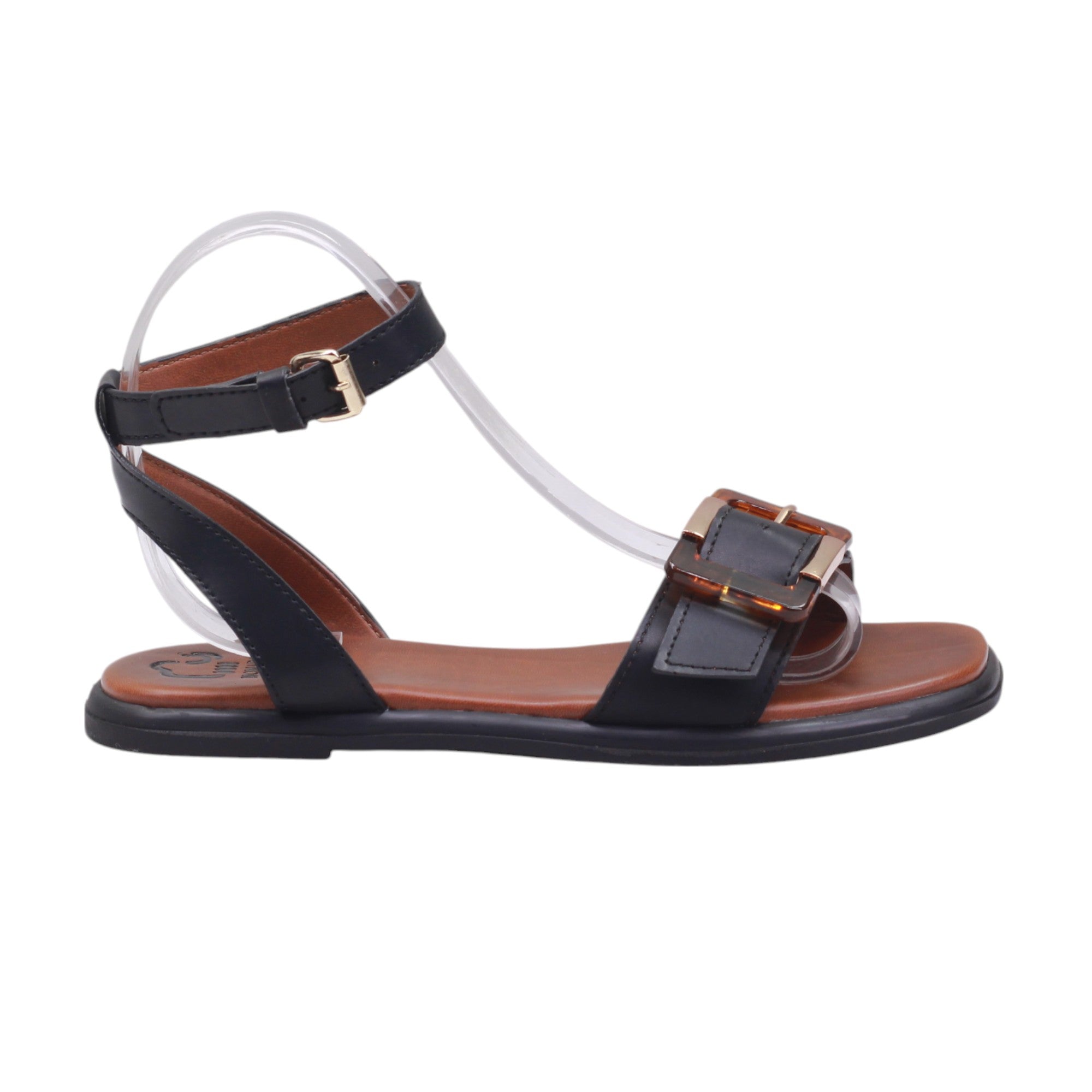 Sandalia para dama marca Nómadas en color negro. Modelo de ajuste al tobillo con hebilla, perfectas para uso en casa o simples caminatas.