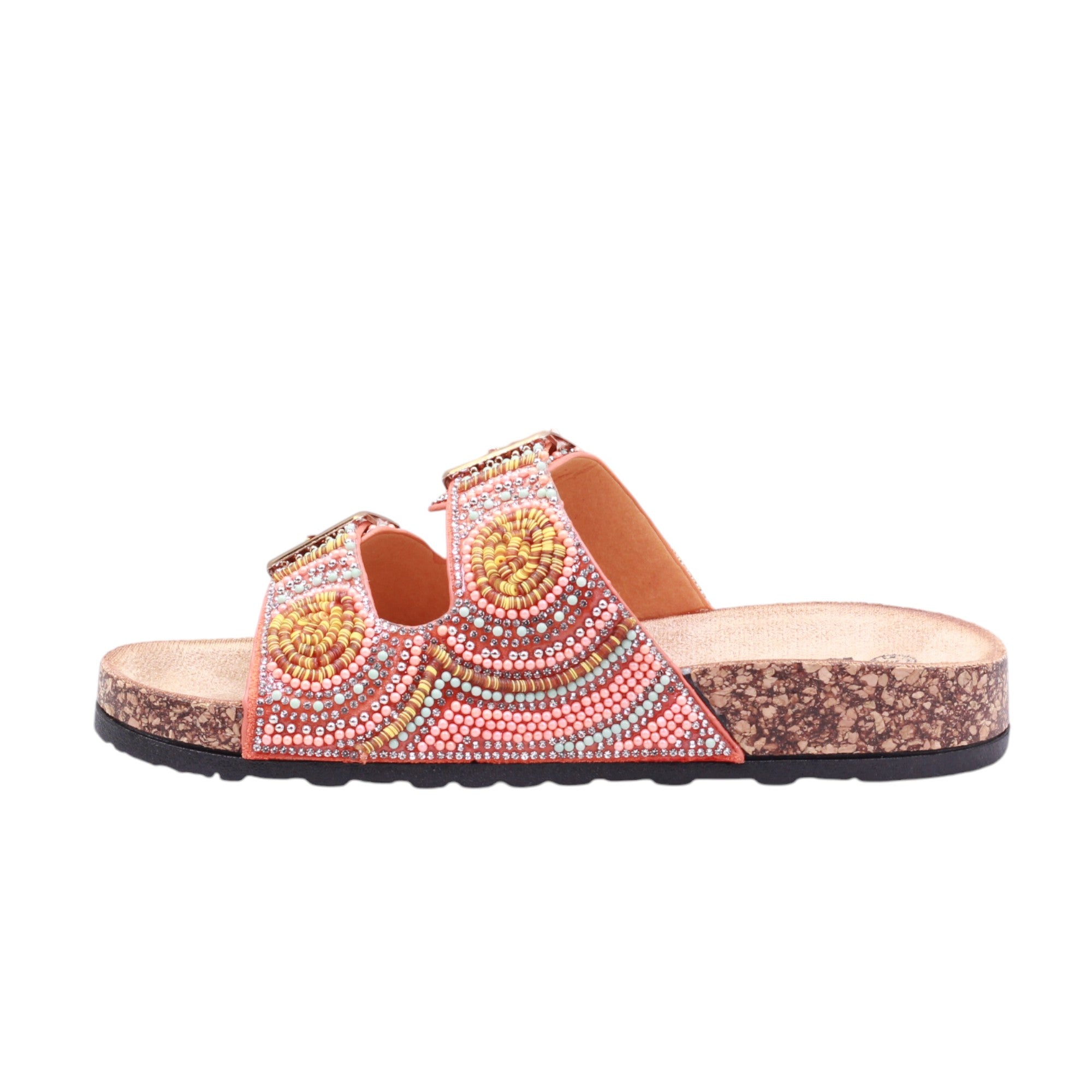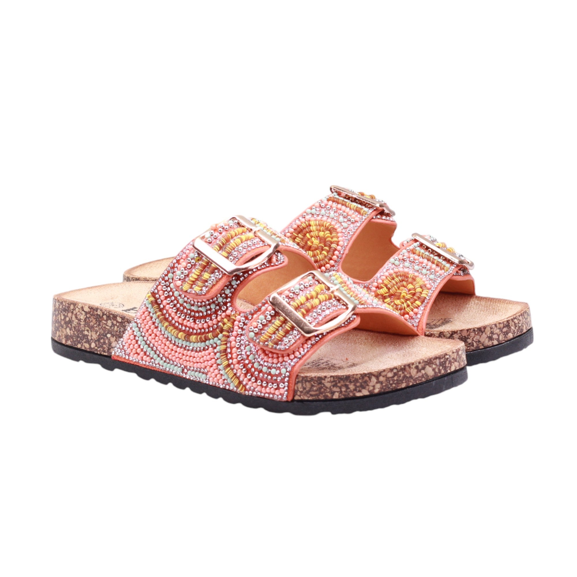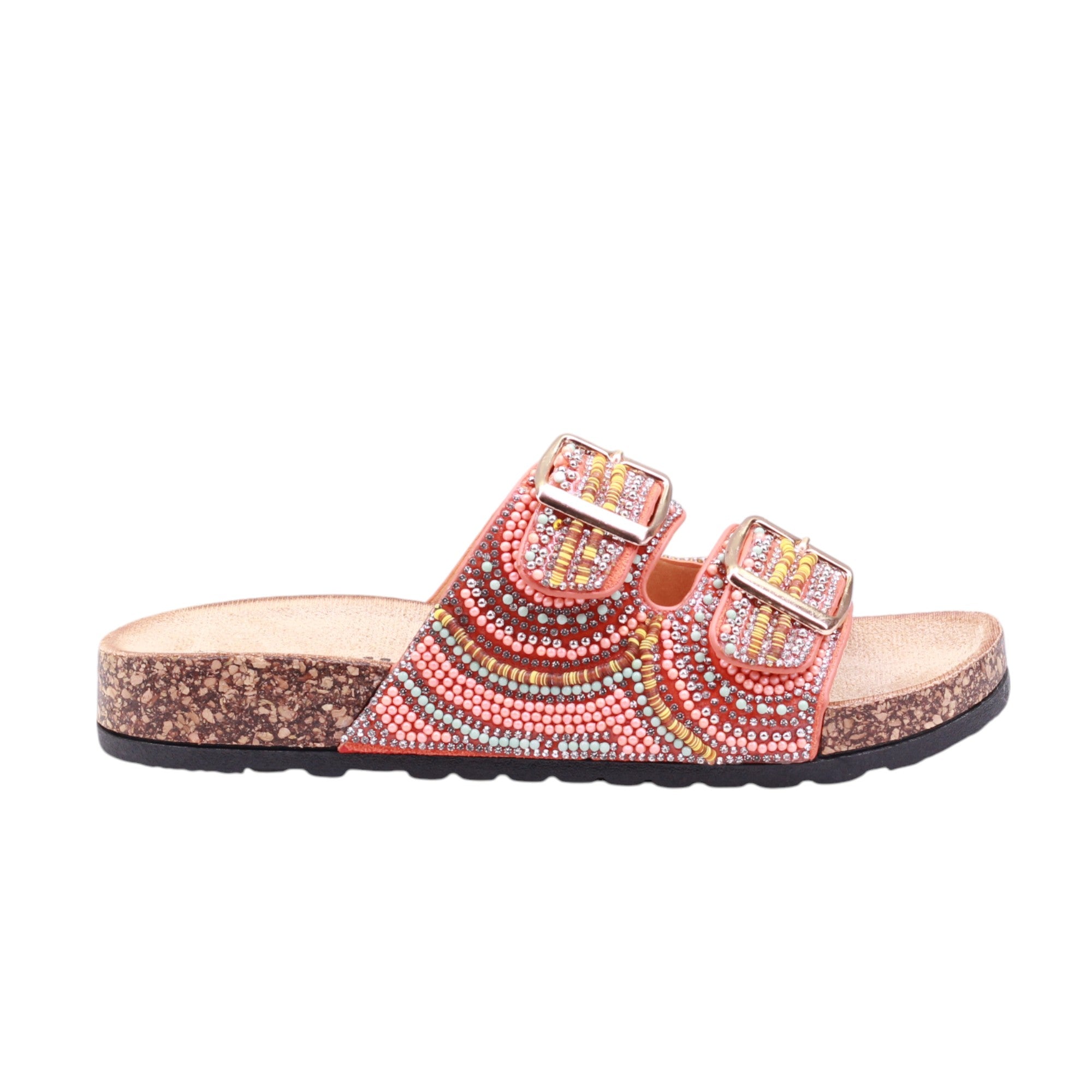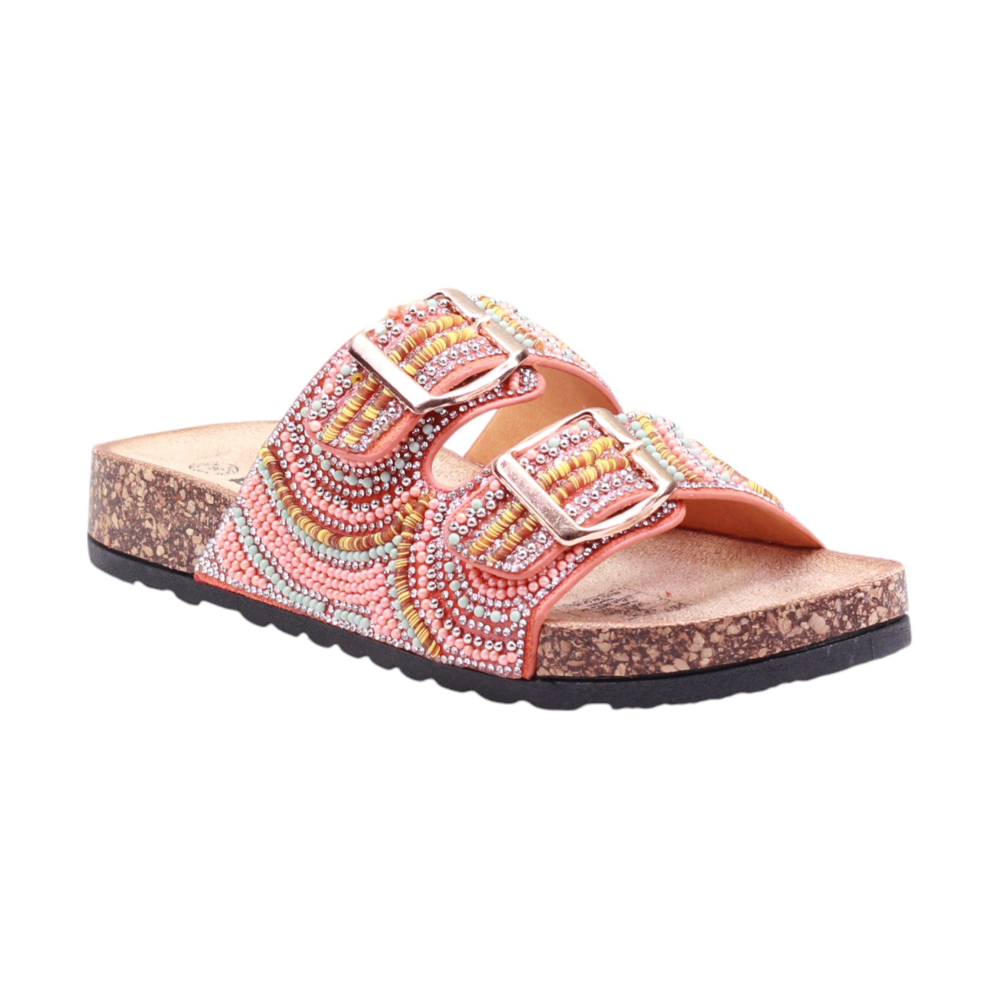 Sandalia para dama marca Berlin en colores orange. Este modelo cuenta con una doble tira ajustable mediante hebillas, lo que garantiza un ajuste perfecto y cómodo. Su corte está adornado con pedrería artificial, añadiendo un toque de elegancia. Además, su plantilla ergonómica de corcho brinda comodidad y soporte a tus pies.