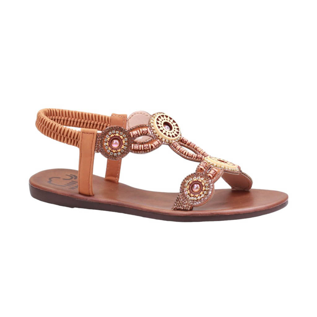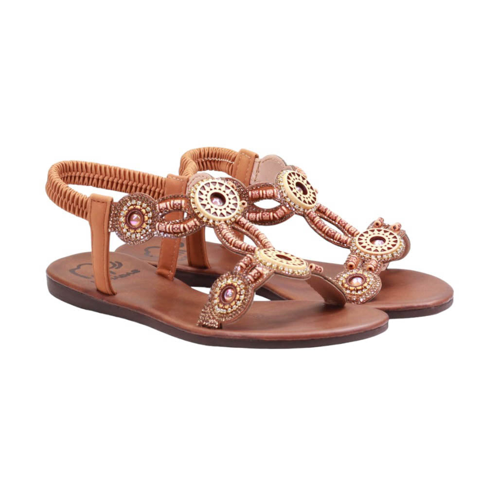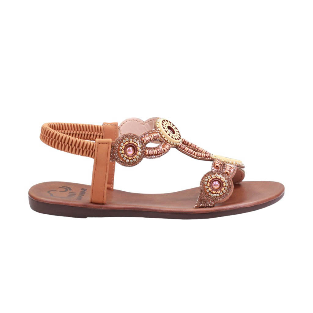 Sandalia para dama marca Nomadas en color camel. Este modelo cuenta con un elástico trasero para un ajuste perfecto, además de contar con adornos decorativos en el corte. Diseñado para brindar comodidad y estilo, es ideal para cualquier ocasión.