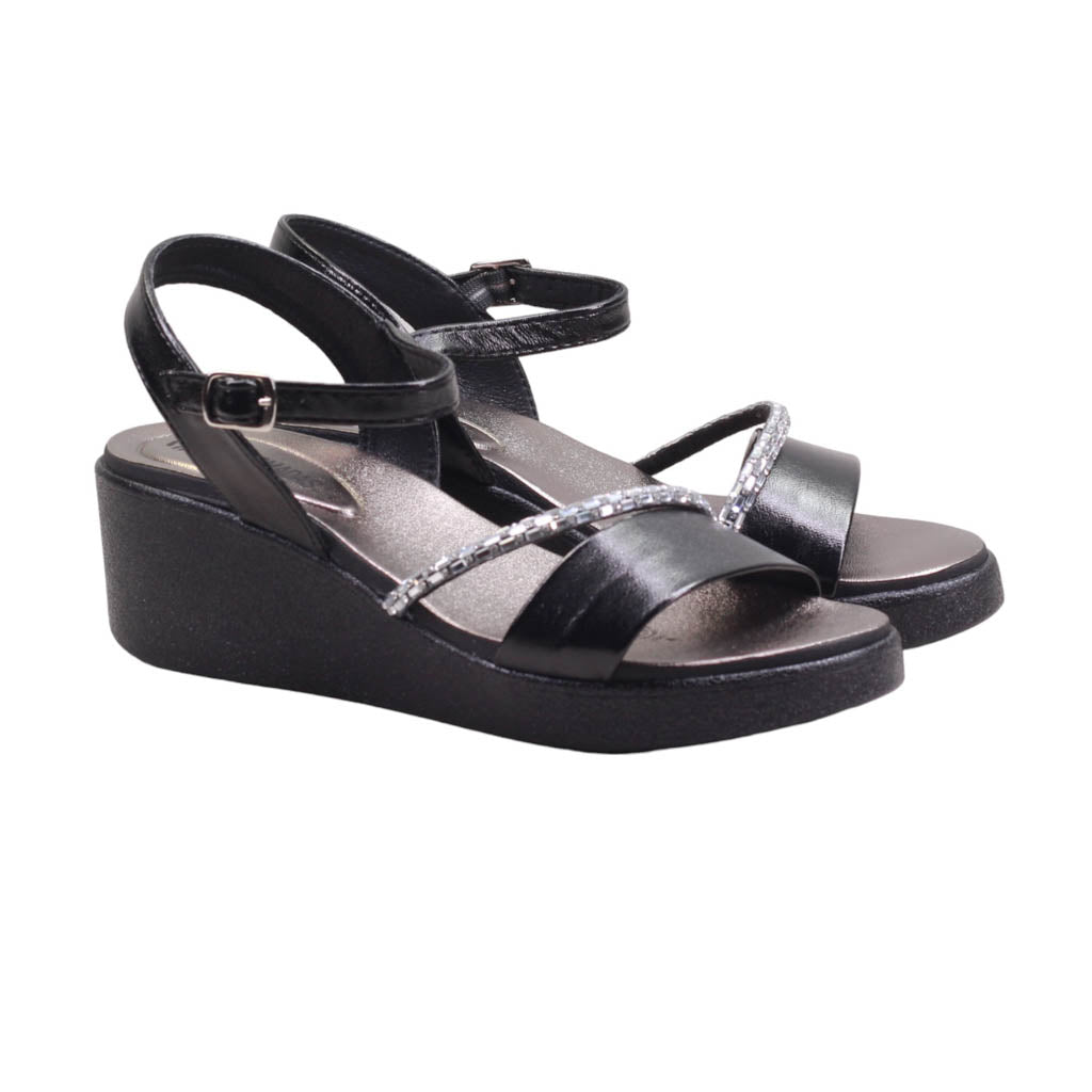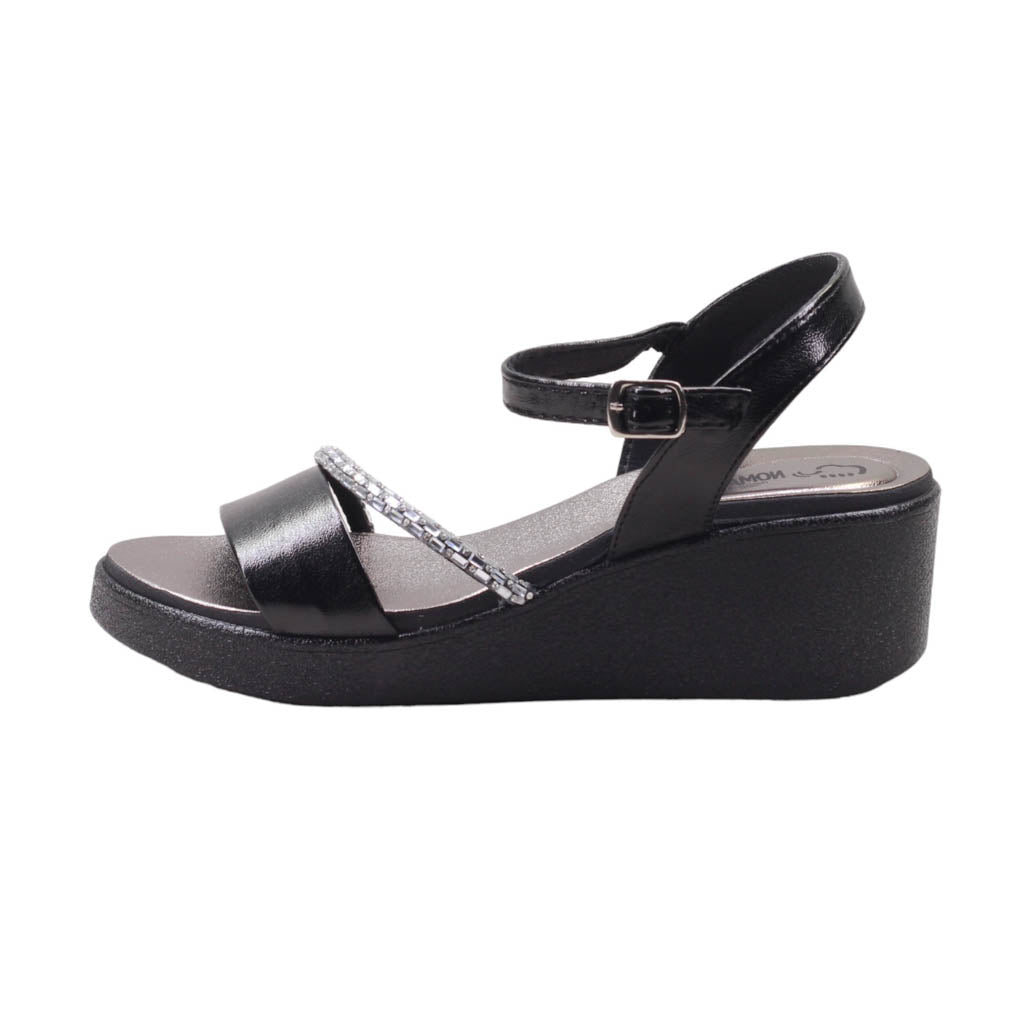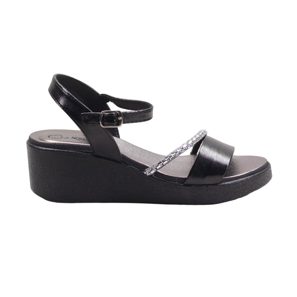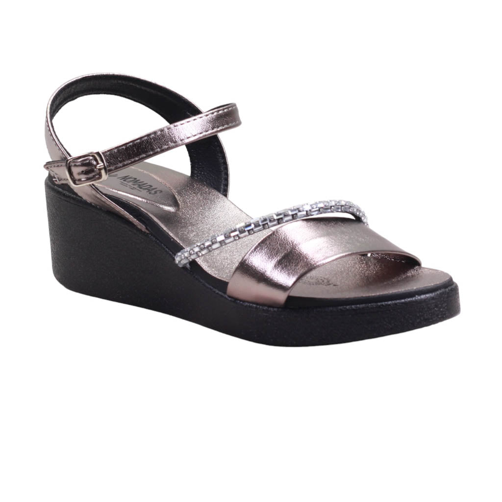 Sandalia para dama marca Nomadas en colores inox y negro. diseñada para realzar tu estilo con un toque de sofisticación.