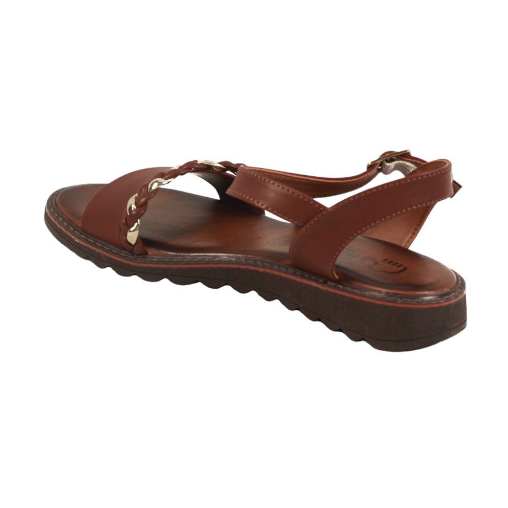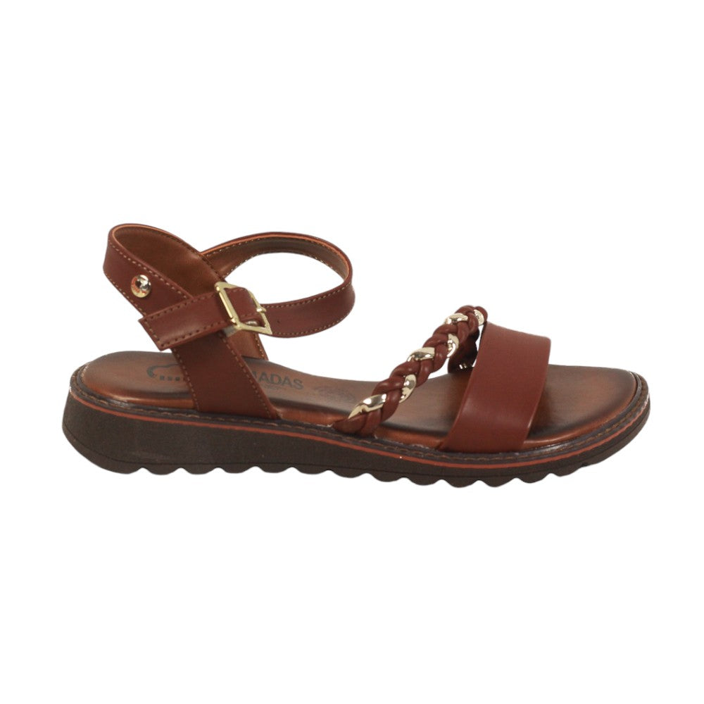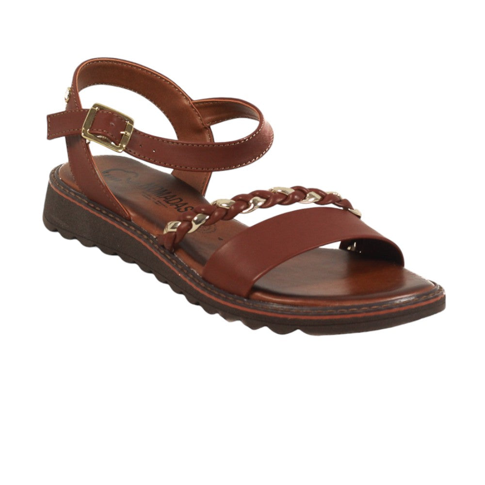 Sandalia para dama marca Nomadas en color tan. Bonito modelo con una tira con diseño entrelazado en dos tonos que le da un toque atractivo, cuenta con plantilla de confort que facilitara tus caminatas paso a paso.