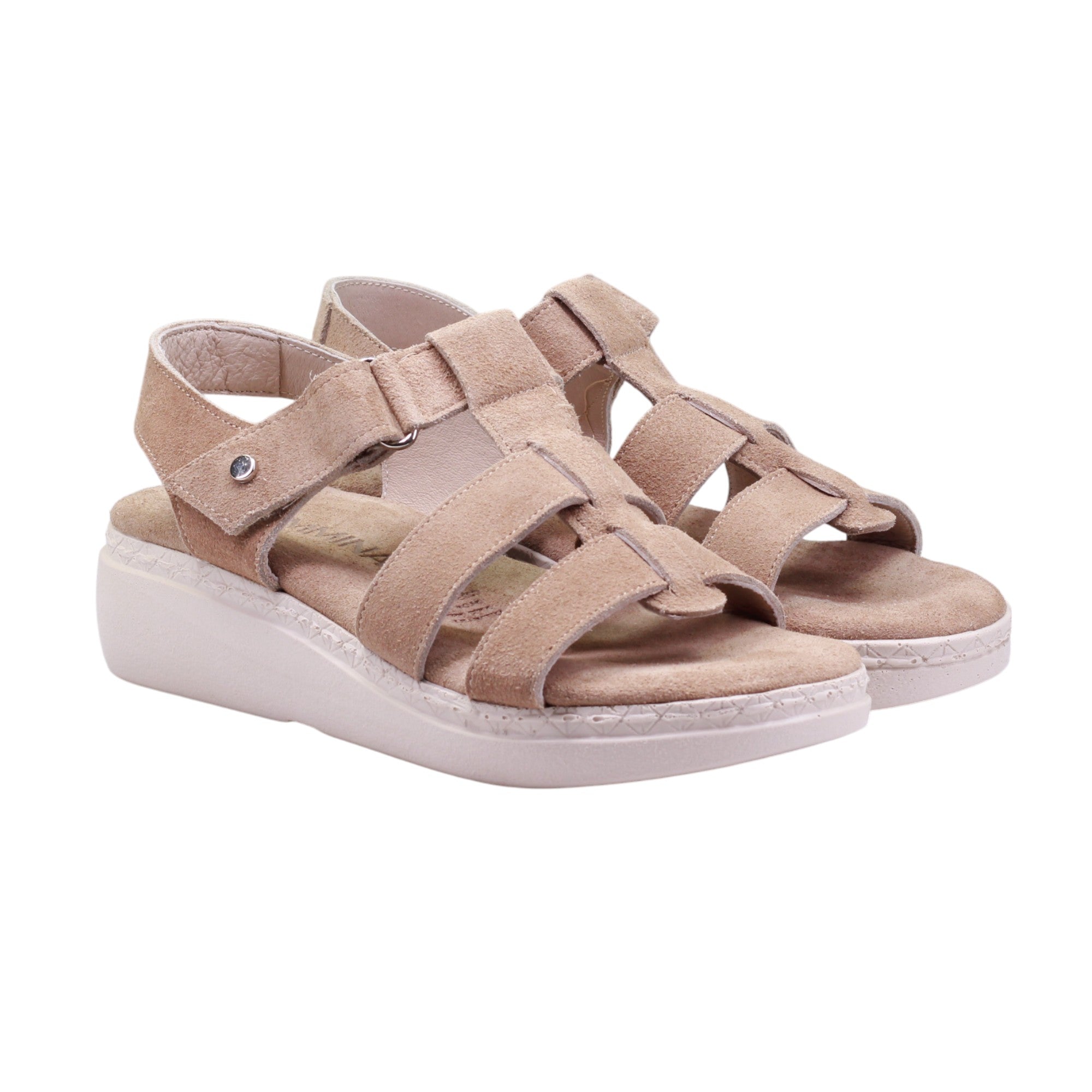 Sandalia para dama marca Camina.mx en color arena. Aumenta tu estilo con este modelo de plataforma de 4.00 cm con corte en piel durazno. Su modelo de ajuste con velcro y plantilla acojinada brindan comodidad y un ajuste perfecto. Combina moda y comodidad con cada paso.