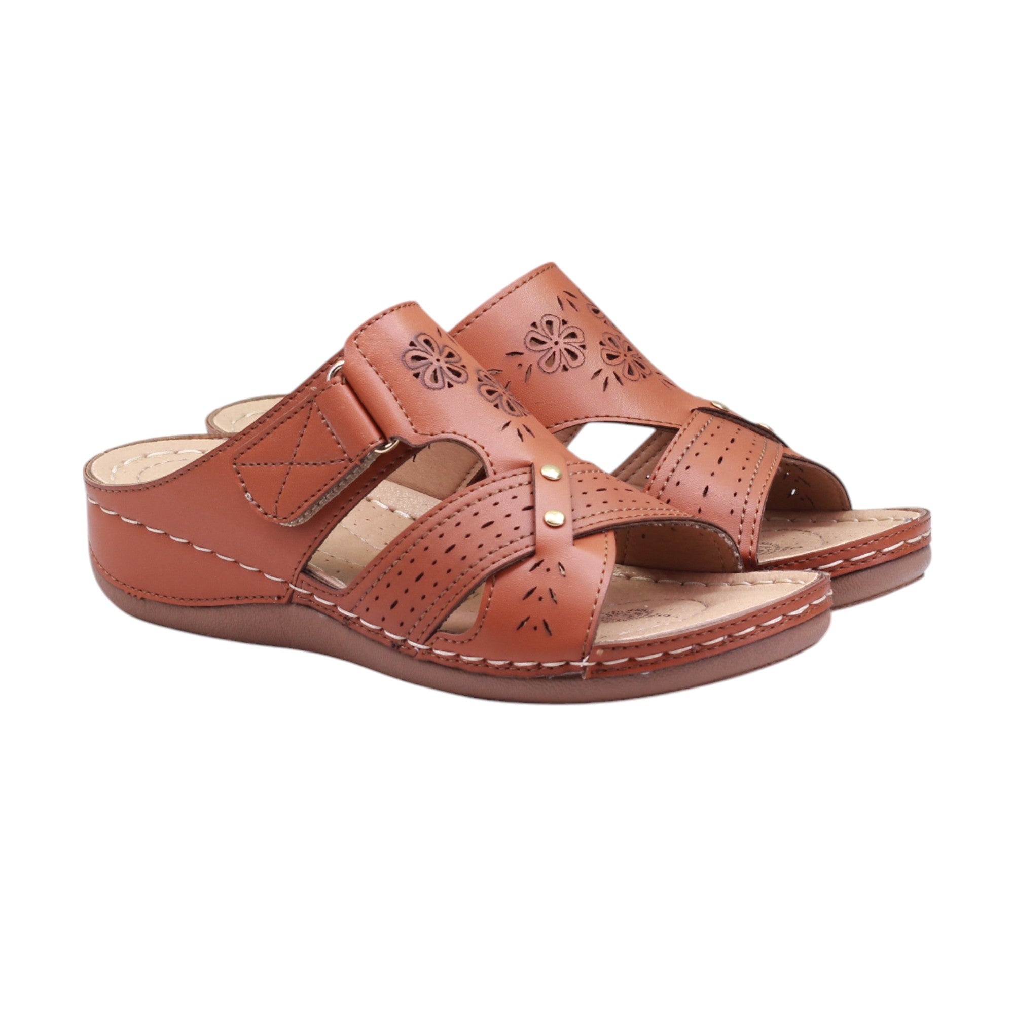 Sandalia para dama marca Nómadas en colores maquillaje y armañac. Nuestra plataforma de 4.00 cm con tira ajustable y velcro combina comodidad y estilo. Sus perforaciones en el corte le dan un toque único. Disfruta de una mayor altura sin sacrificar la comodidad.