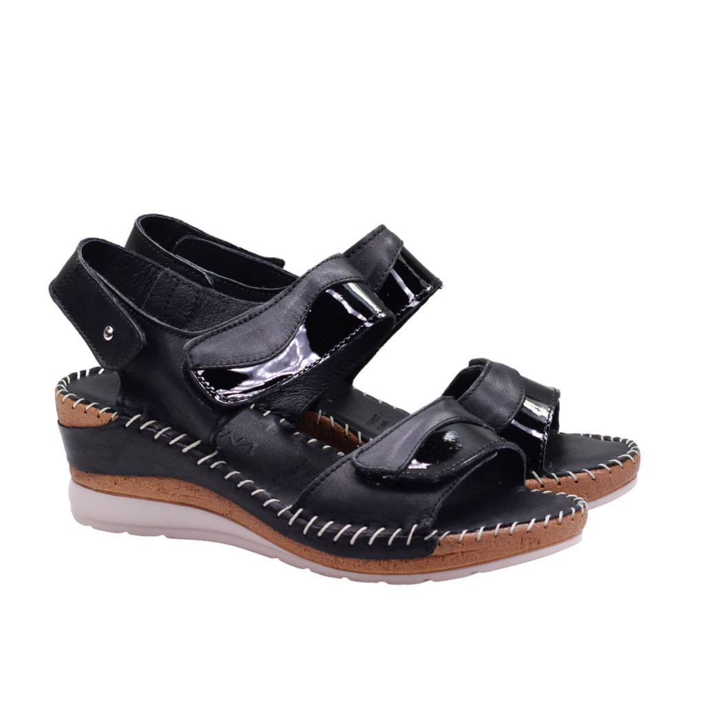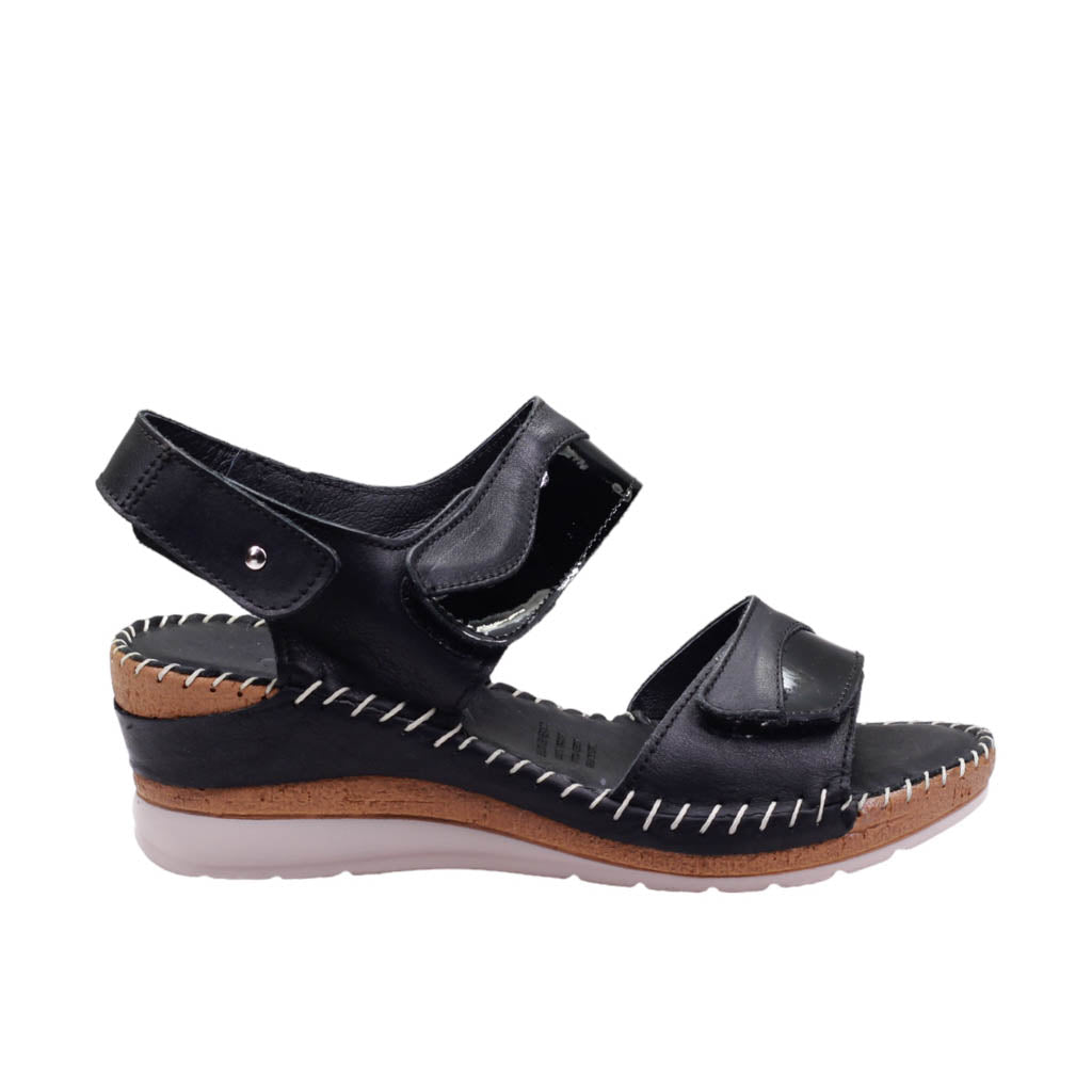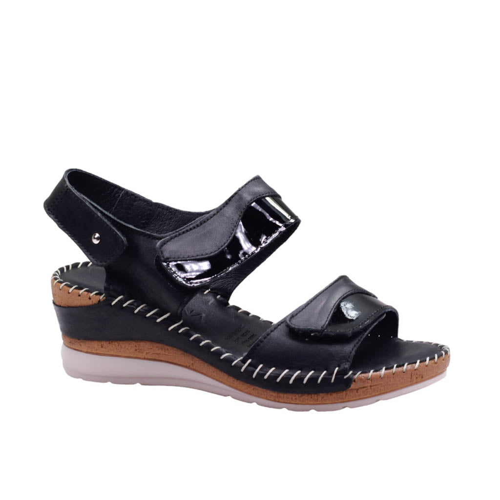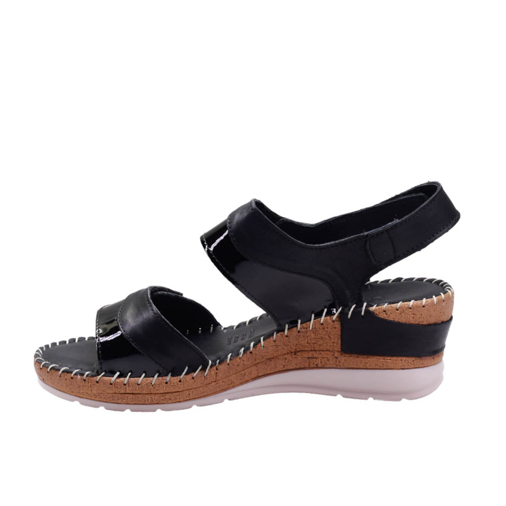 Sandalia para dama marca Camina.mx en color negro. Esta sandalia de plataforma tiene un diseño elegante con un ajuste de velcro para mayor comodidad. La plantilla de super confort brinda una experiencia cómoda y duradera. Además, su corte de piel y charol le da un acabado de alta calidad. La plataforma y la plantilla unidas con tejido proporcionan una mayor durabilidad.