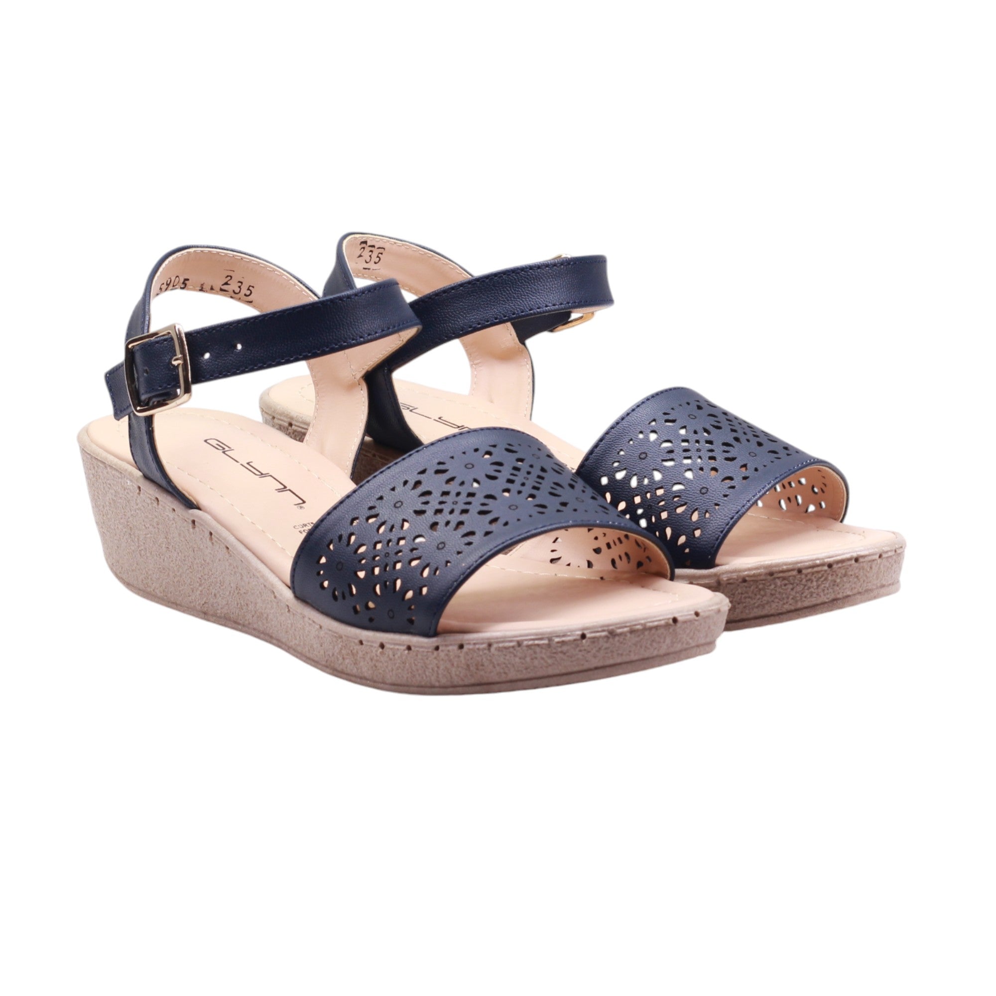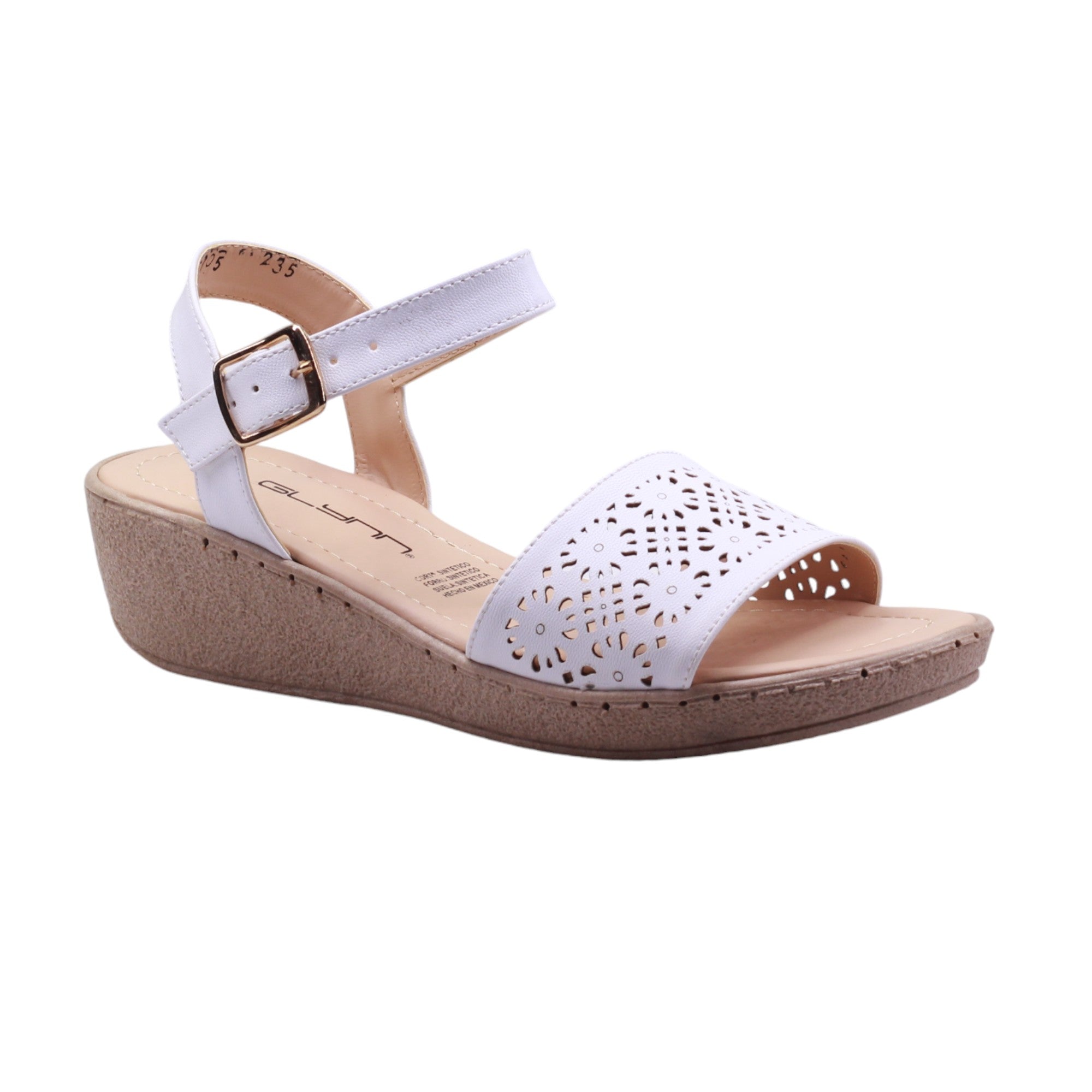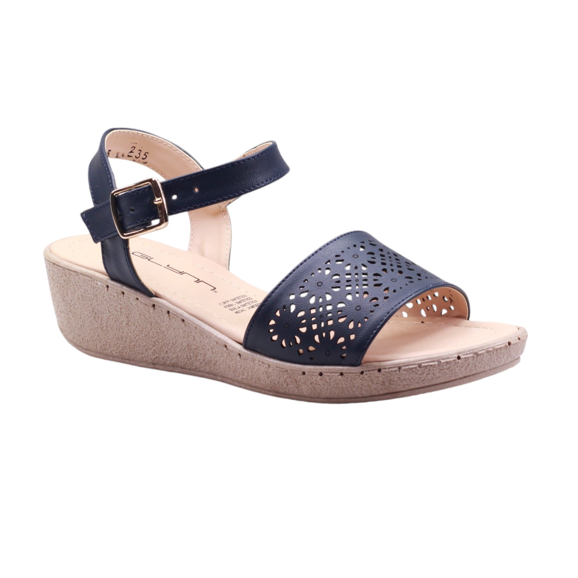 Sandalia para dama marca Glynn en colores azul, bail y blanco. Esta plataforma tiene una altura de 4.5 cm para una mayor elevación y comodidad. La tira ajustable al tobillo con hebilla permite un ajuste perfecto, mientras que el corte con perforaciones añade un toque moderno y transpirable. Perfecto para cualquier ocasión.