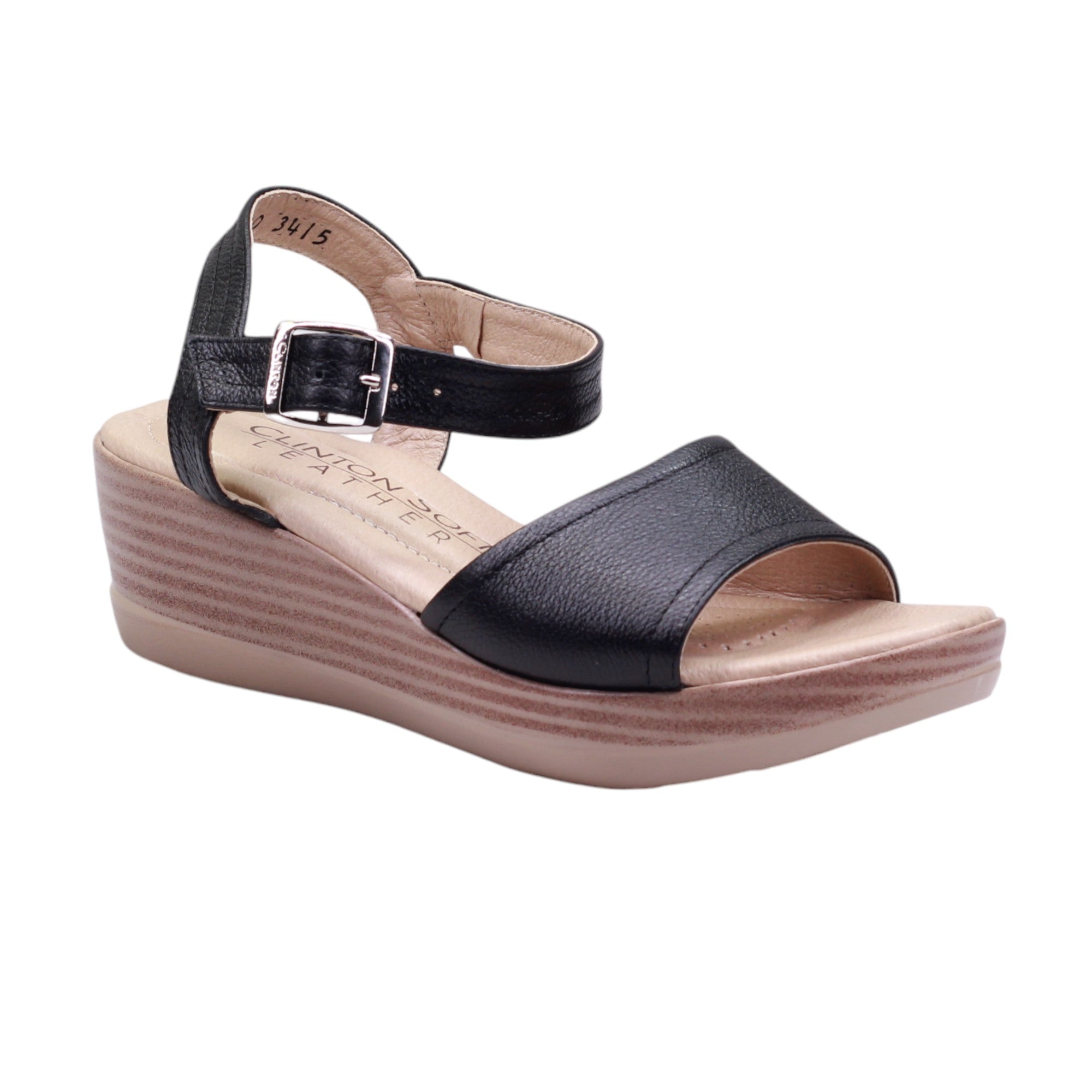 Sandalia con plataforma para dama marca Clinton en color negro. Descubra la comodidad y la elegancia con nuestro Modelo de plataforma con vista madera y altura de 5.00 cm. El ajuste al tobillo con hebilla ofrece seguridad y estabilidad, mientras que la plantilla cómoda asegura una experiencia cómoda durante todo el día. ¡Perfecto para un look moderno y sofisticado!
