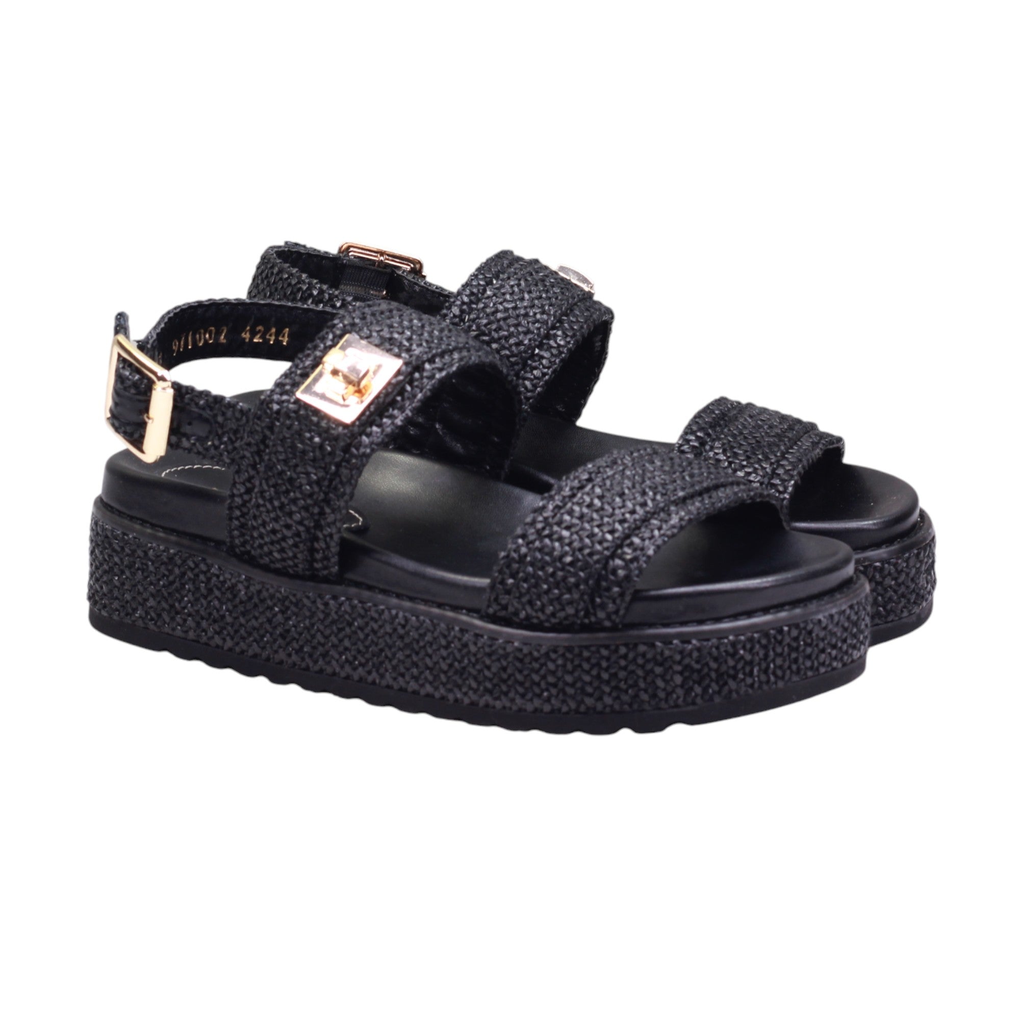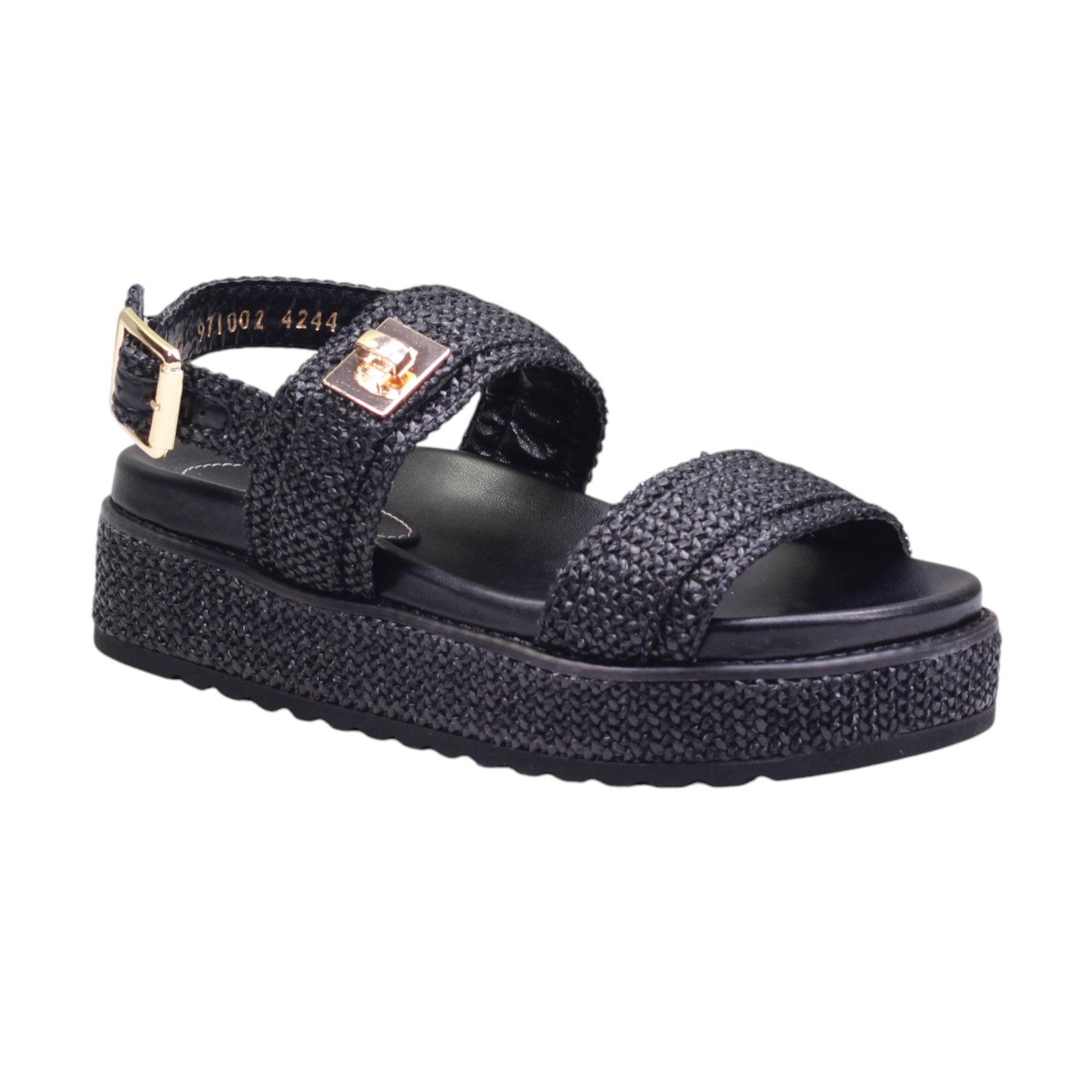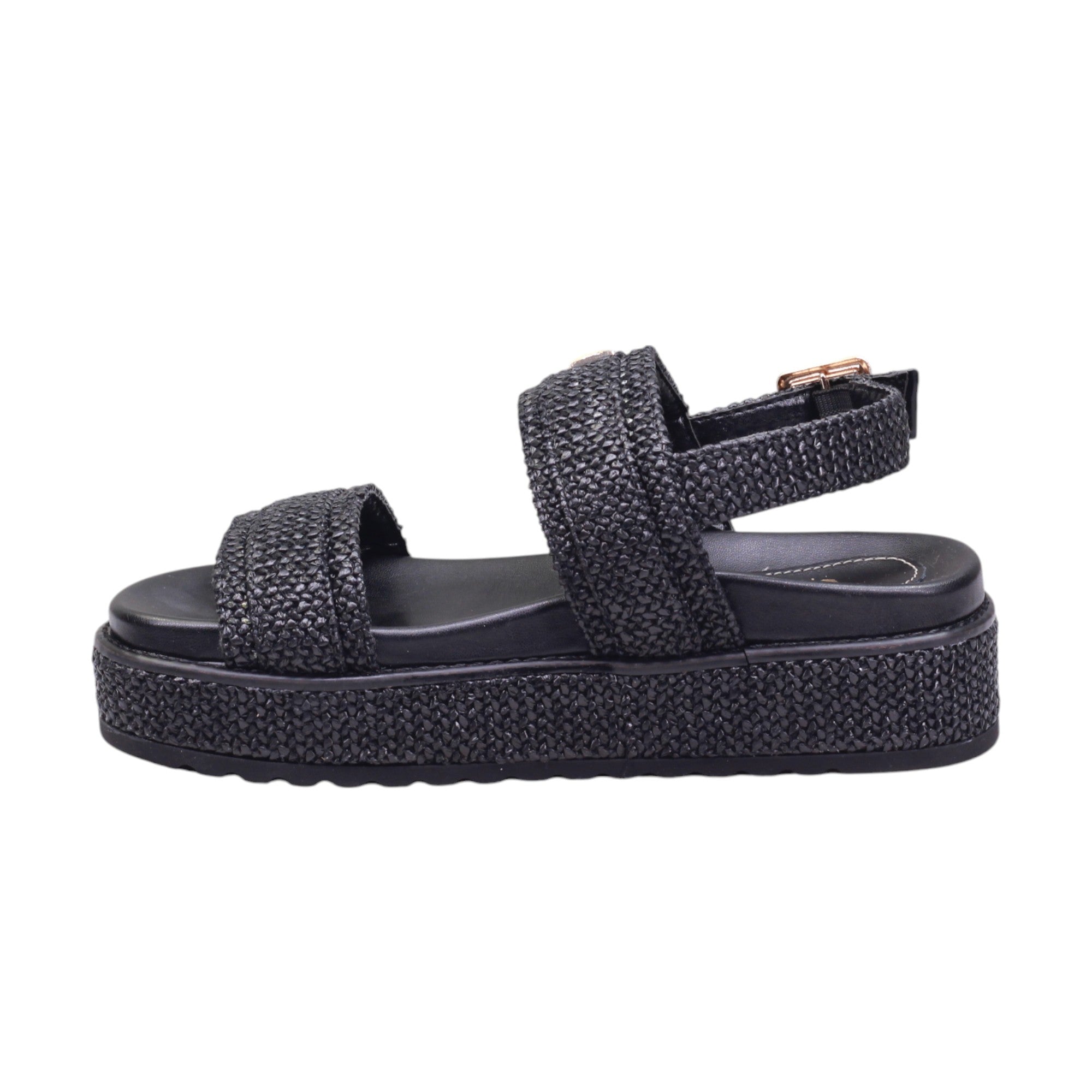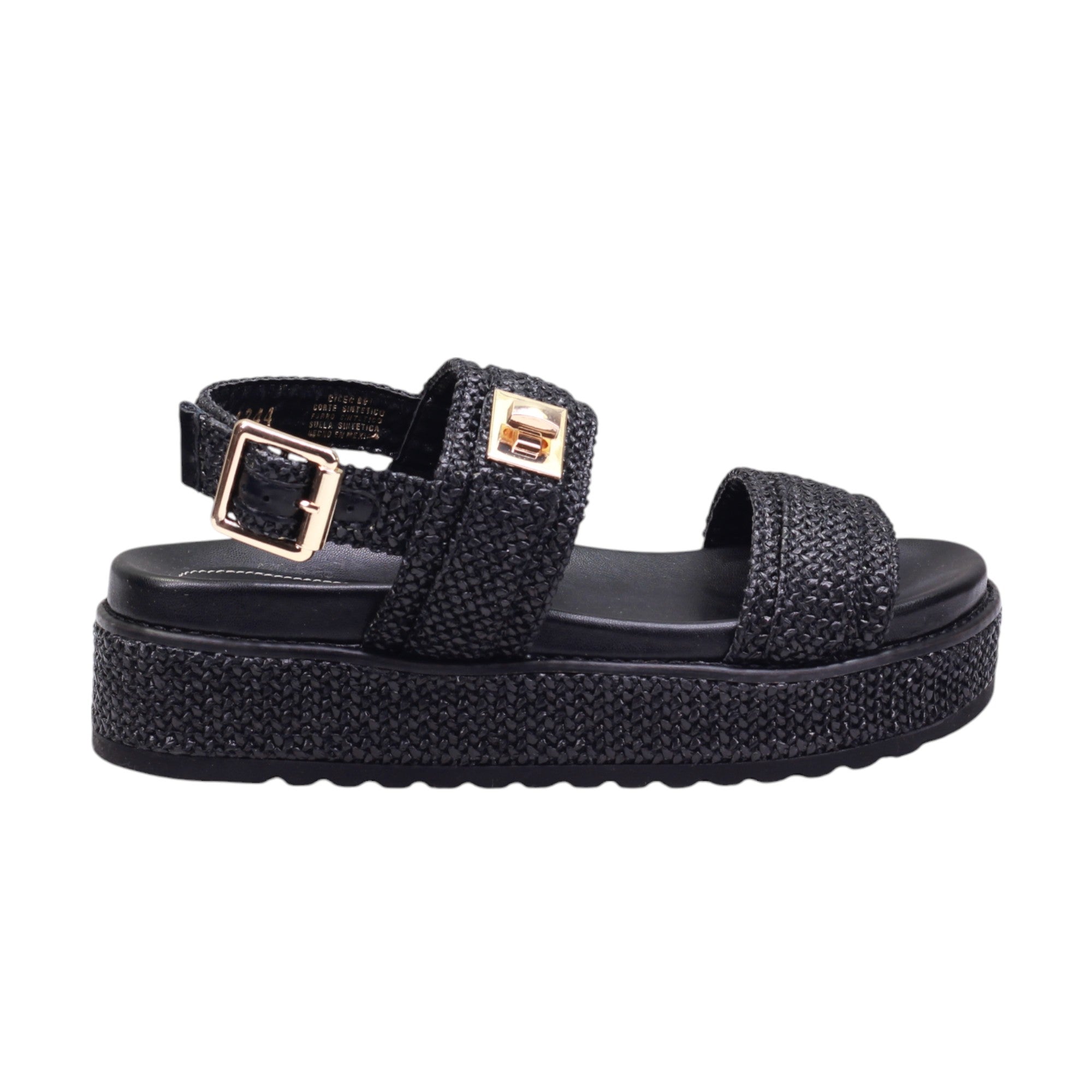 Sandalia para dama de la marca Gillio en color negro. Esta sandalia cuenta con un modelo de tira y una práctica tira trasera ajustable con hebilla. Con su adorno metálico, se convierte en el complemento perfecto para cualquier look. Además, su suela corrida de 3.5 cm ofrece comodidad y estilo en cada paso.